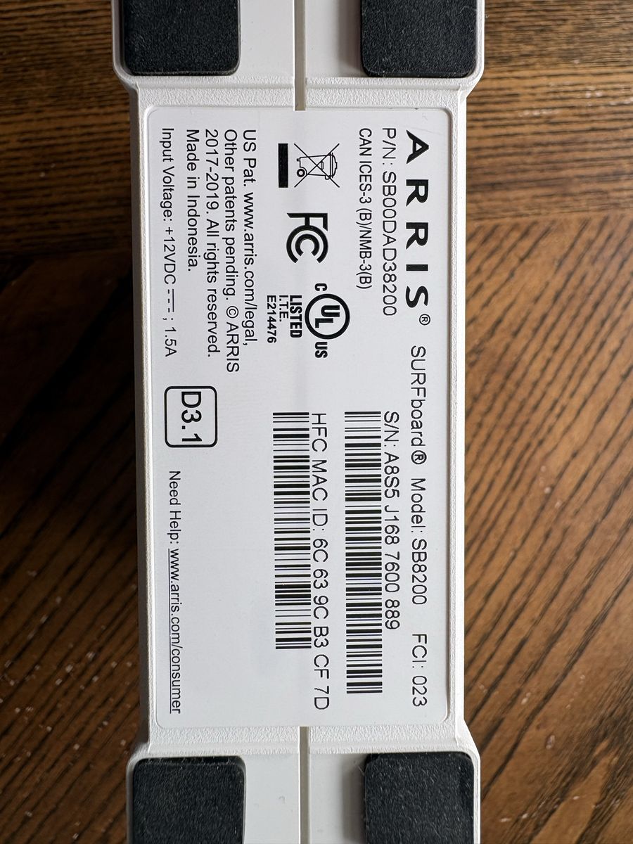 VenmoSelling my Arris SURFboard SB8200 DOCSIS 3.1 Cable Modem in great working condition. This is a high-performance modem that supports gigabit internet speeds and works with major providers like Xfinity, Cox, and Spectrum.