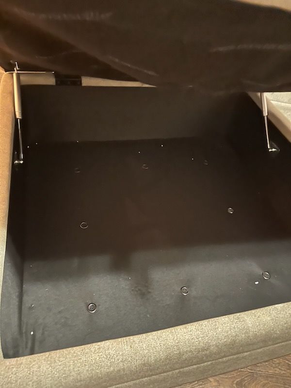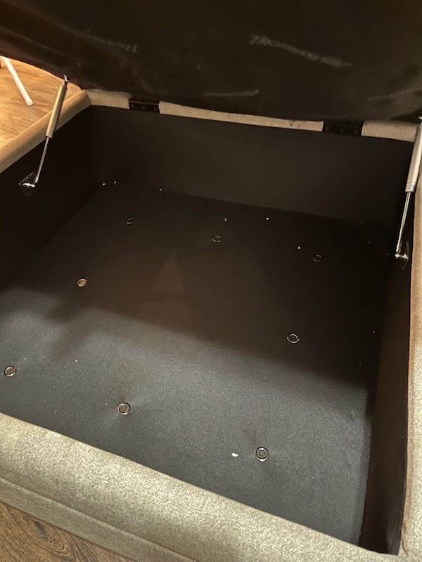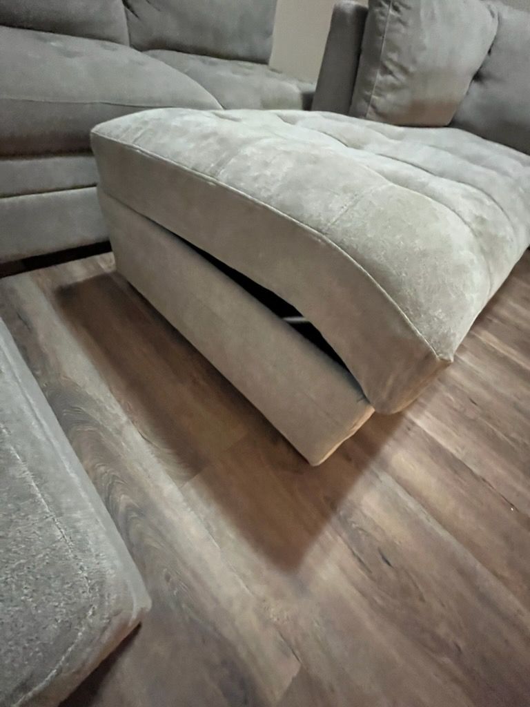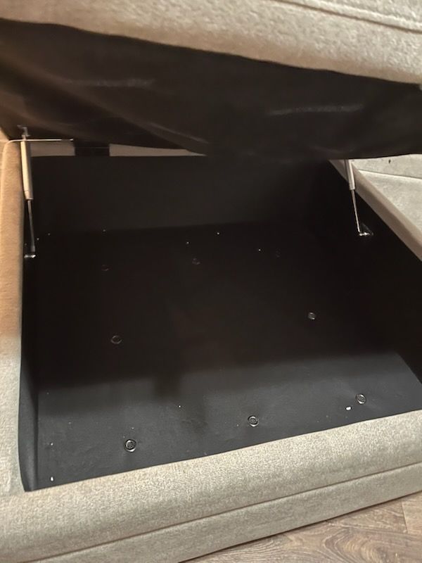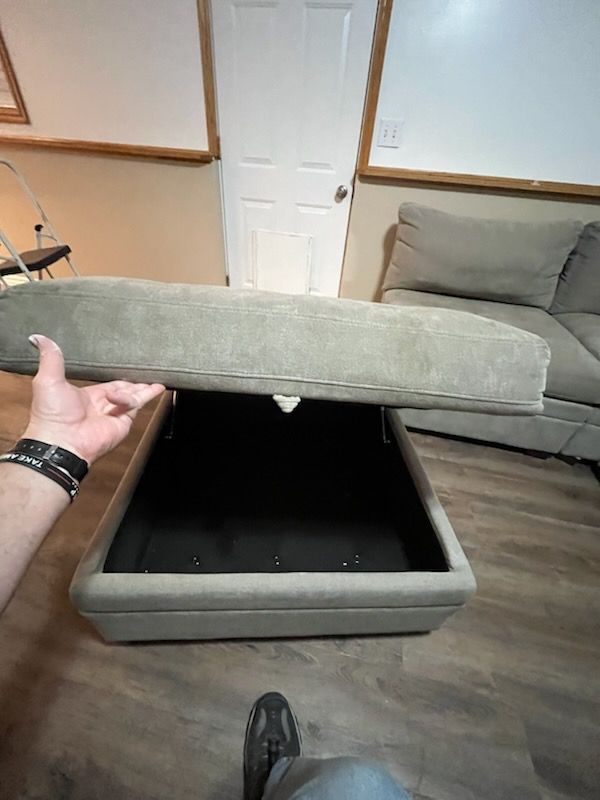 Condition: The sofa cushions and fabric are in great shape. Please note: The hinges on the storage ottoman currently need repair.