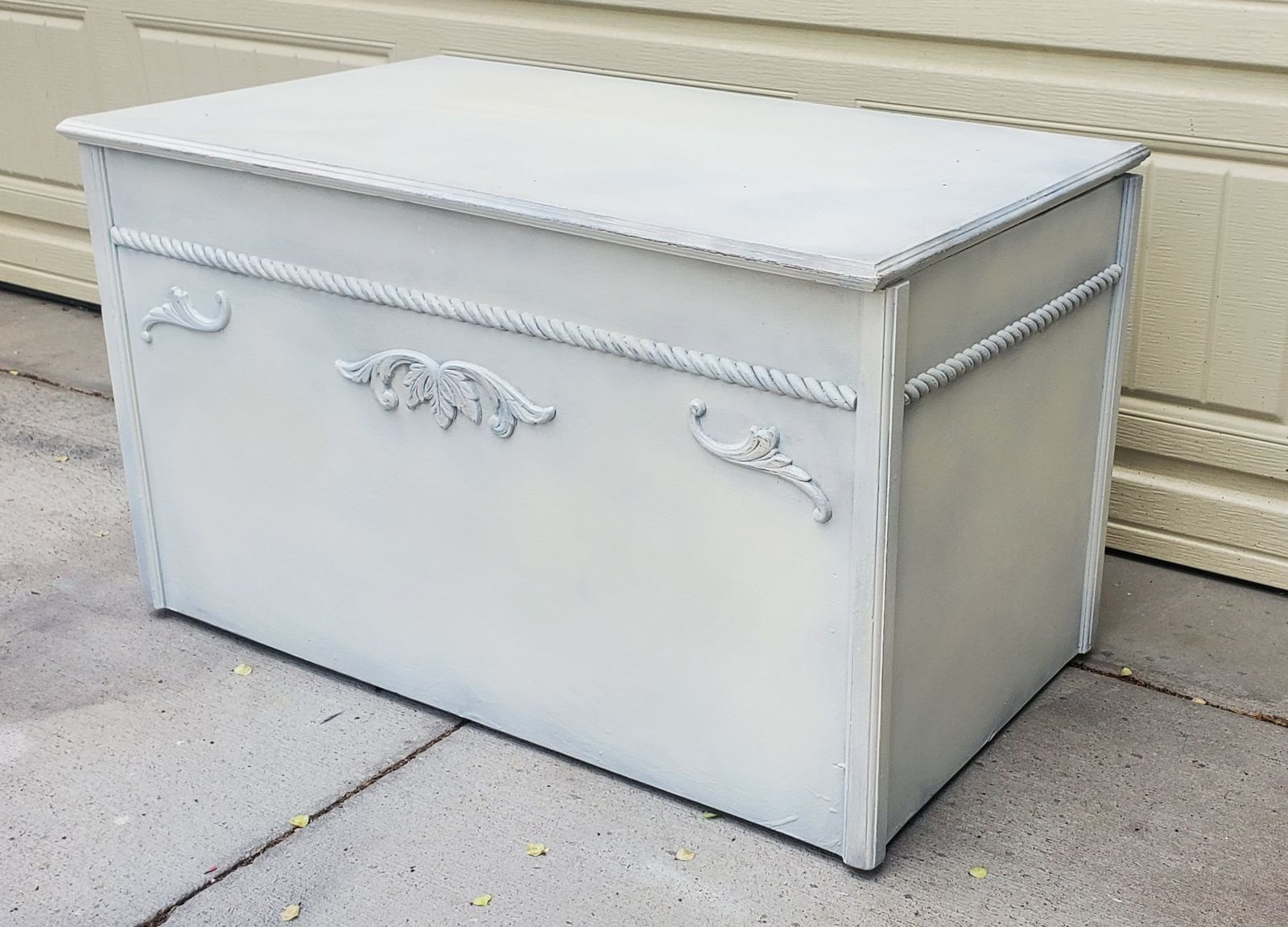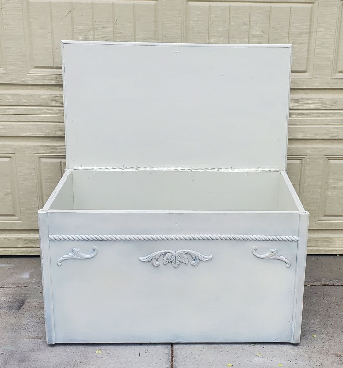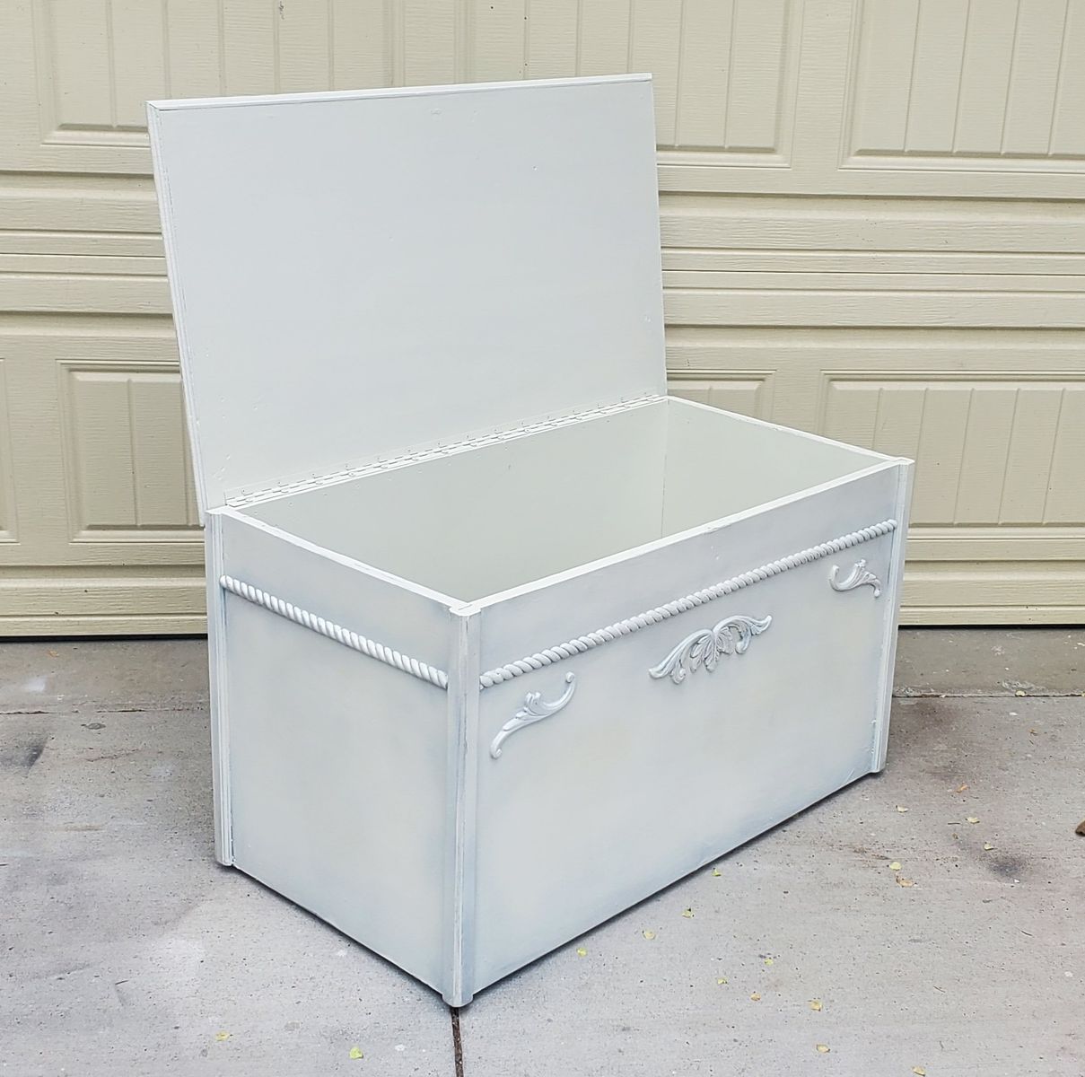 This vintage, handmade, and handpainted solid wood storage / toy box / blanket chest has been enhanced with rope molding, and carved onlays. It has recently been painted a fresh coat of cream enamel, distressed, and lightly antiqued with a pale grey glaze. It has wheels underneath to move easily. Great for storing toys, blankets, etc.