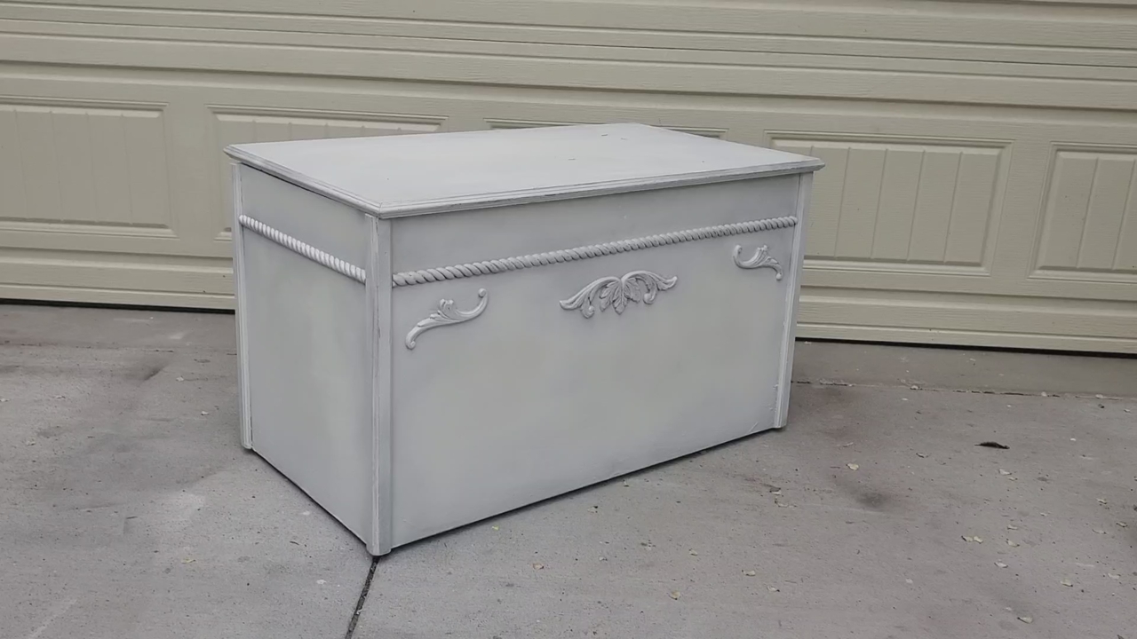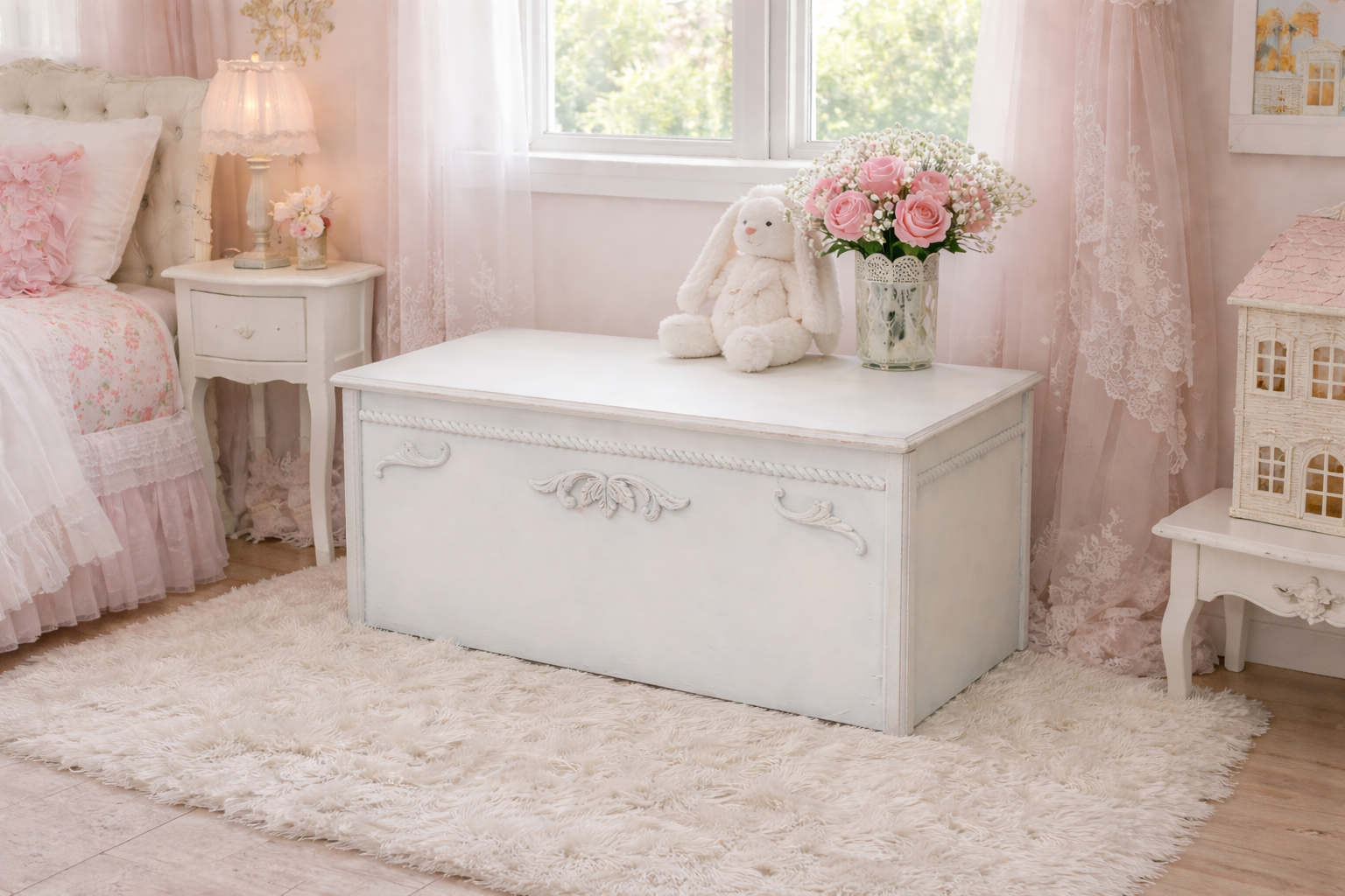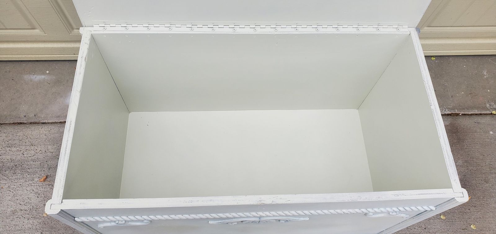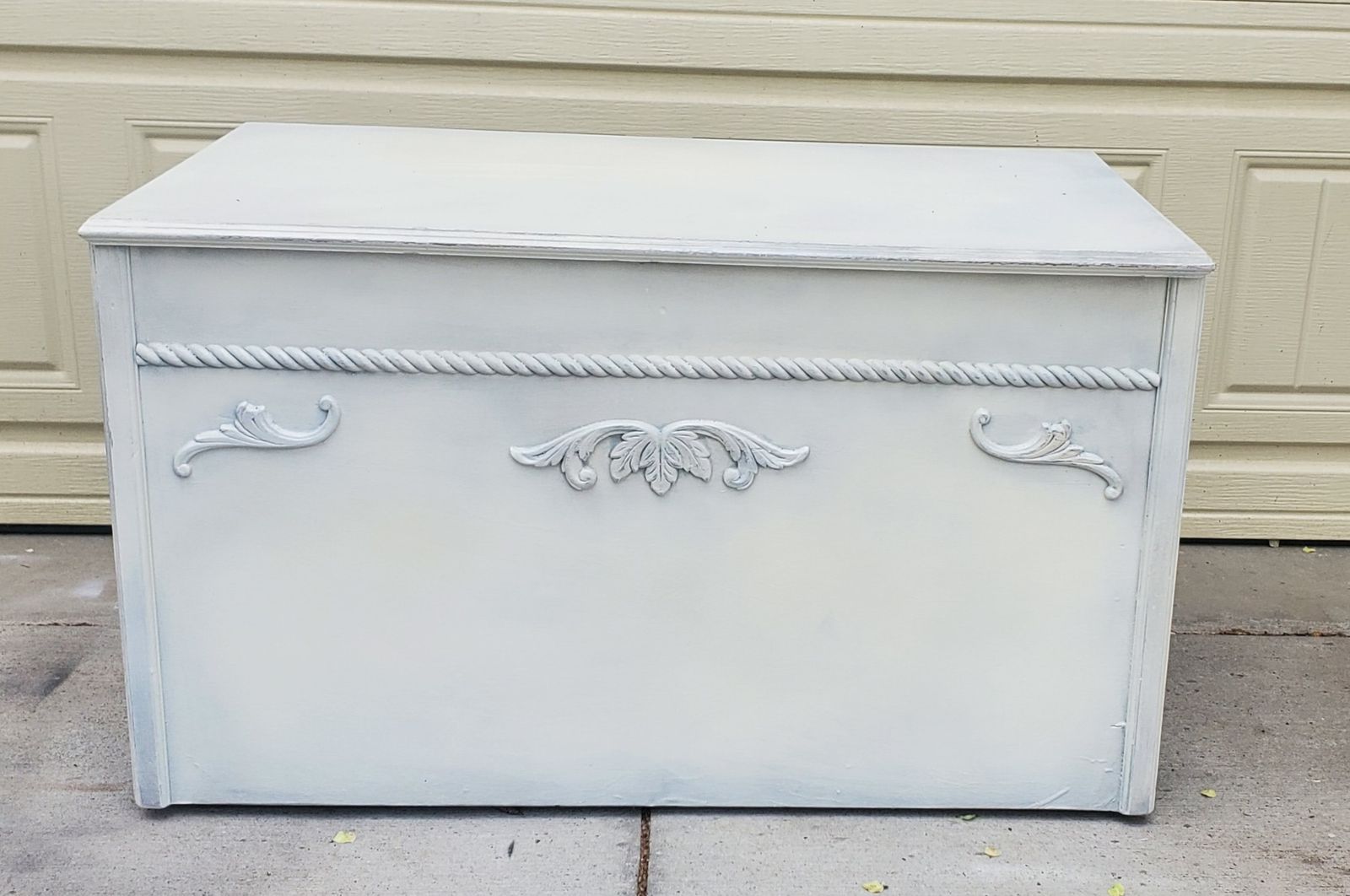 This vintage, handmade, and handpainted solid wood storage / toy box / blanket chest has been enhanced with rope molding, and carved onlays. It has recently been painted a fresh coat of cream enamel, distressed, and lightly antiqued with a pale grey glaze. It has wheels underneath to move easily. Great for storing toys, blankets, etc.