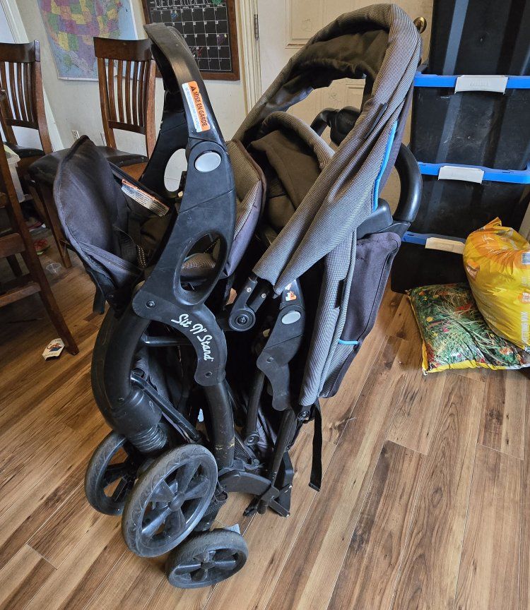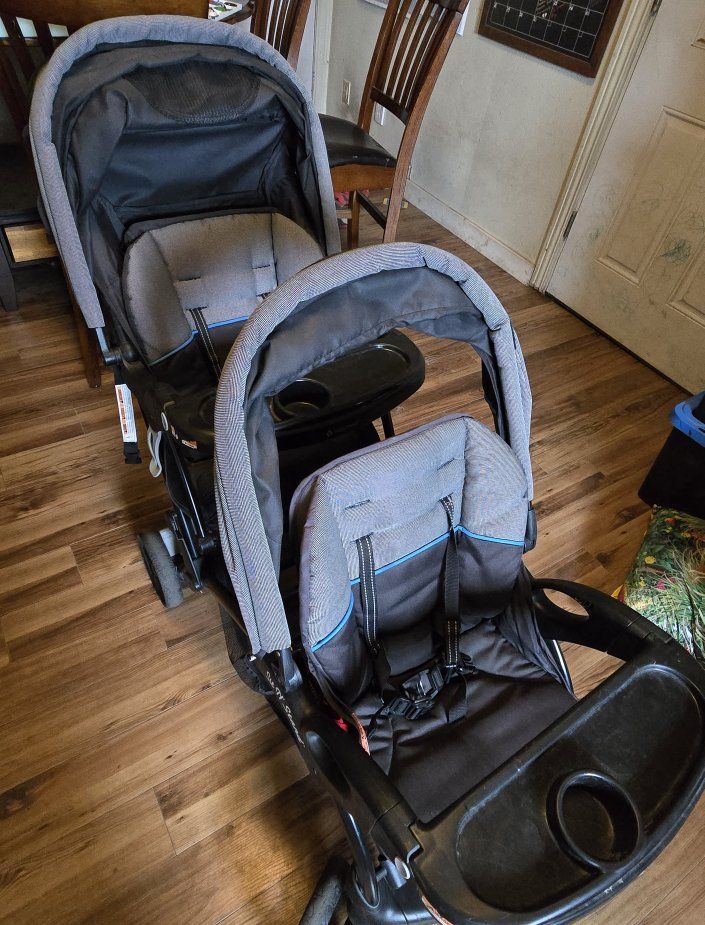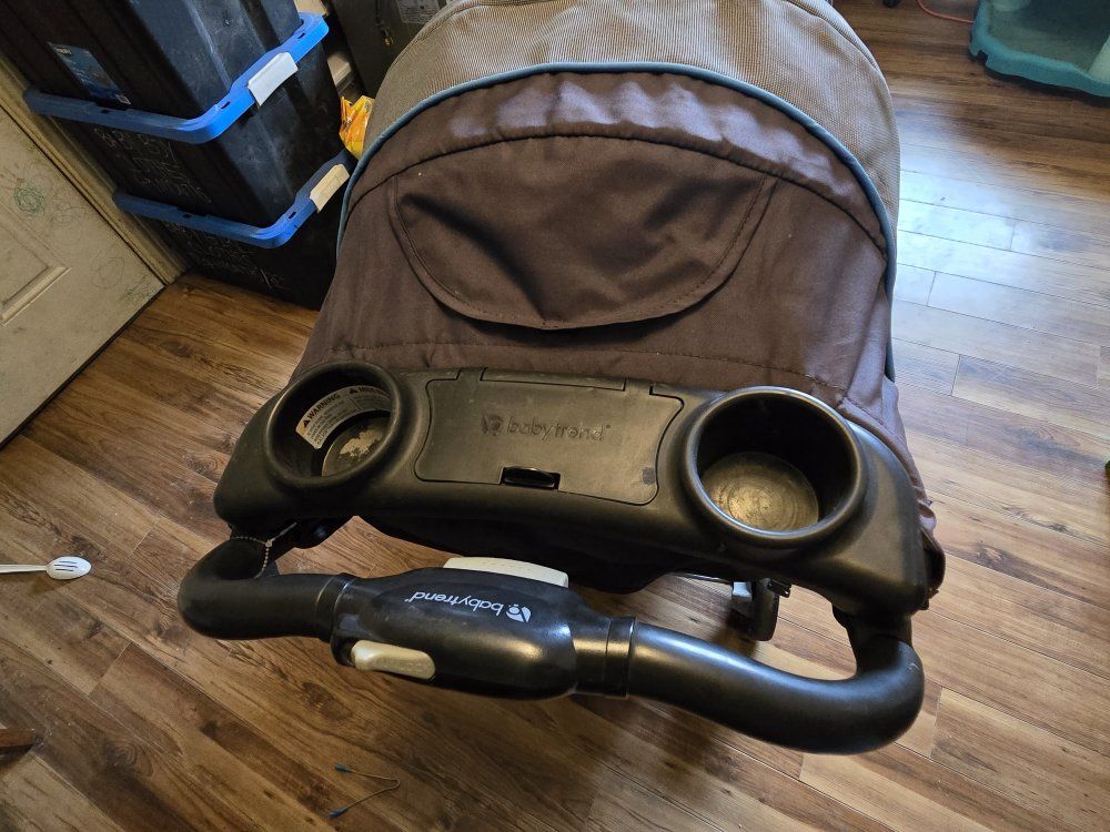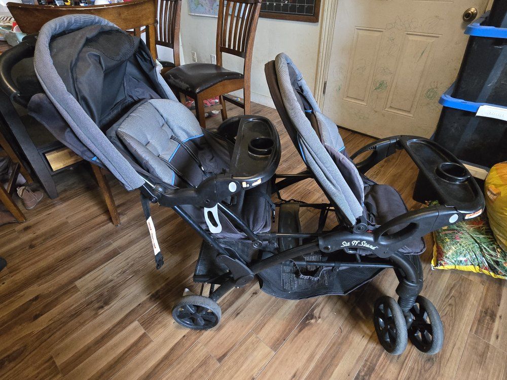 VenmoBaby Trend Sit N' Stand Double Stroller. Both food/drink trays detatch if needed. Has two cup holders up by the handle. Has a small basket for storage under the seats.