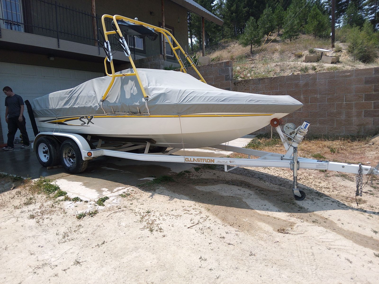 Awesome Glastron SX boat. Has a cool wakeboard tower with speakers. Comes with the trailer too. Great for summer fun on the water. 2004 Glastron SX 195 Ski boat. Fresh high output 350 Chevy. Excellent condition. High end Kicker Stereo with 6 speakers. Boat cover and cockpit cover.