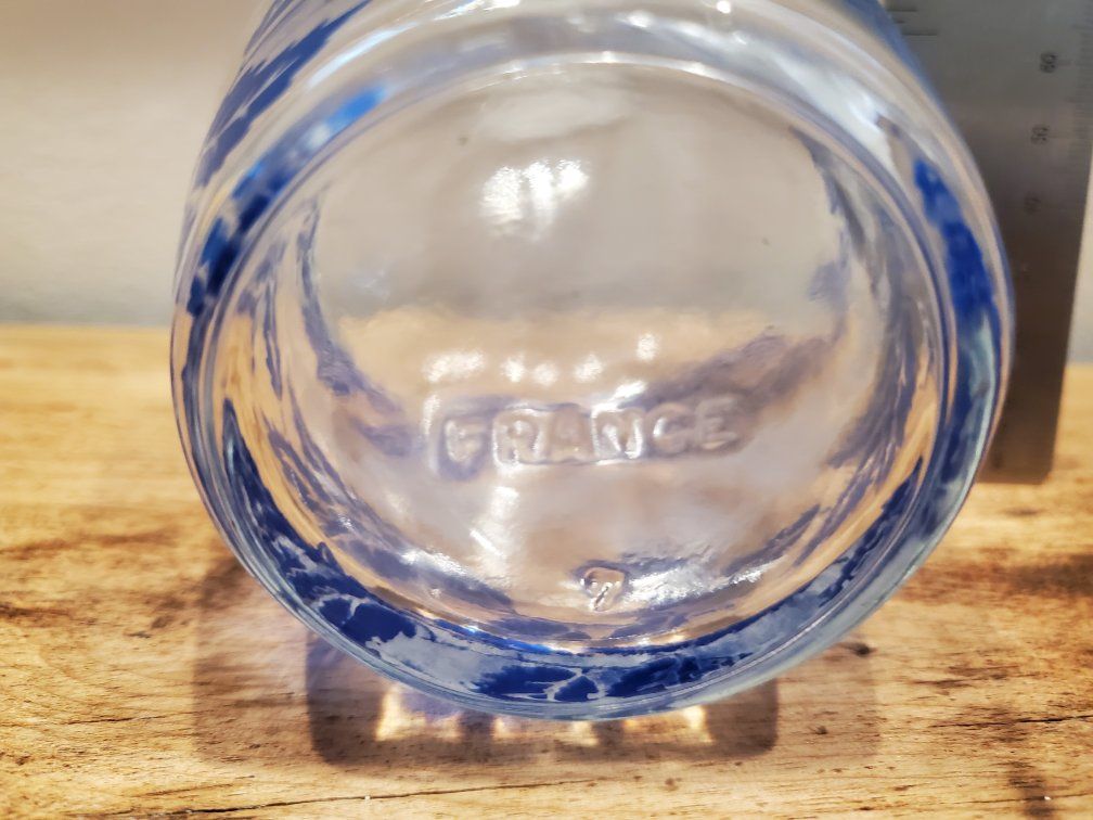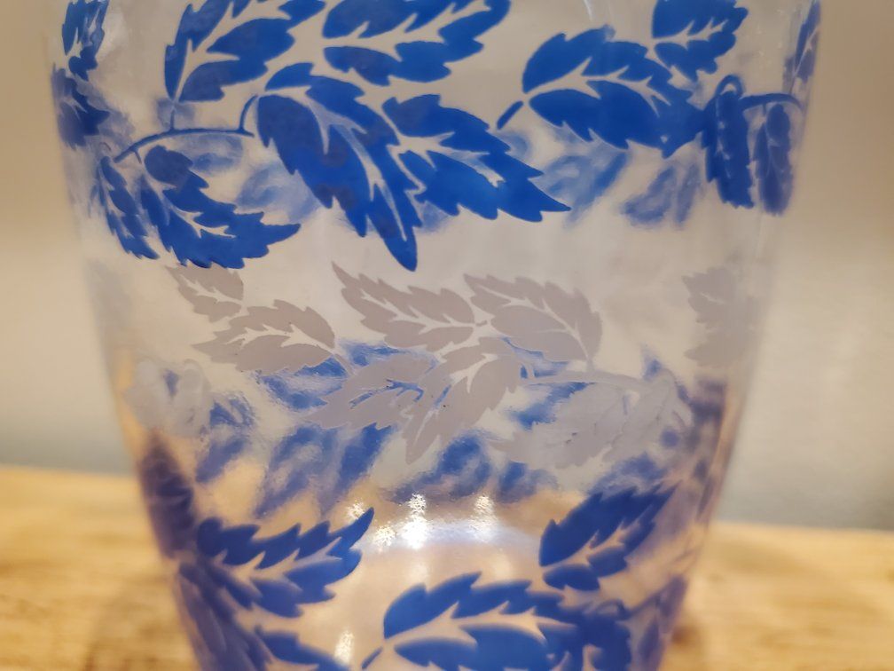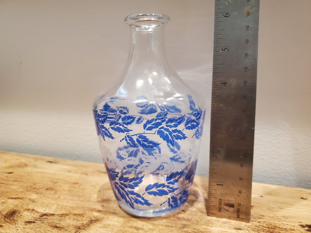 Very pretty Vintage Luminarc Blue & White Leaf design Liqueur Bottle/Decanter, 6" high, 3 1/2 wide (I do not have the glass top, but a cork could be used) or use as a Vase. Made in France. primarily made circa the1960s to 1970s. Often referred to as "Blue & White Feather" or "Blue & Silver Leaf" patterns, Excellent Condition.
