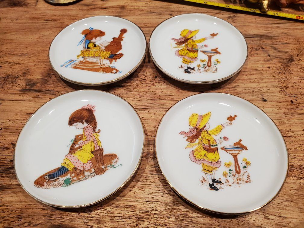 Petticoats and Pantaloons mini decorative dishes 3 1/2 ". Not to be used to serve food. Made in late 70's or early 80's. Copyrighted mcmlxxvirothgreeting cards inc CanogaPark California 91304 USA