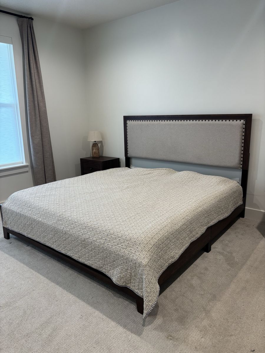 ZelleBrand new upholstered king sized bed frame! We just bought it, no scratches, no issues! Just doesn’t fit the room like we thought.