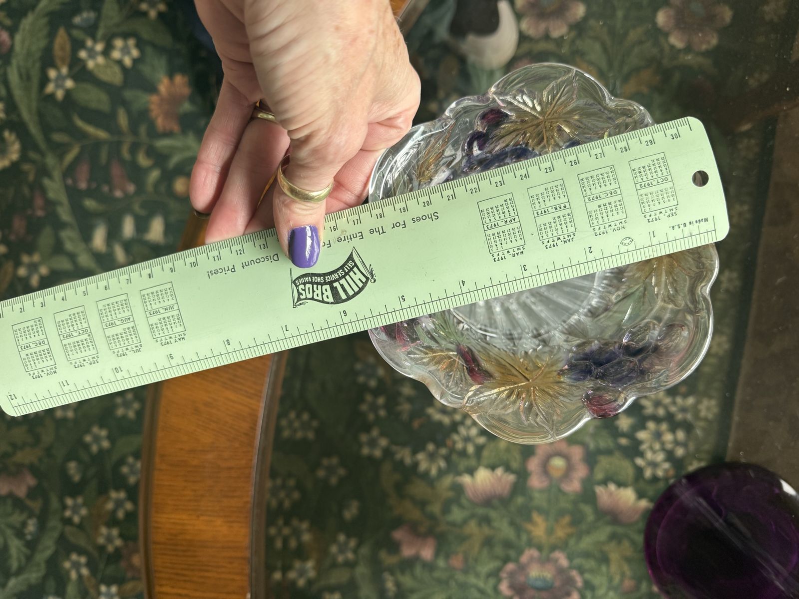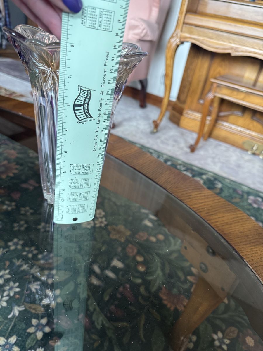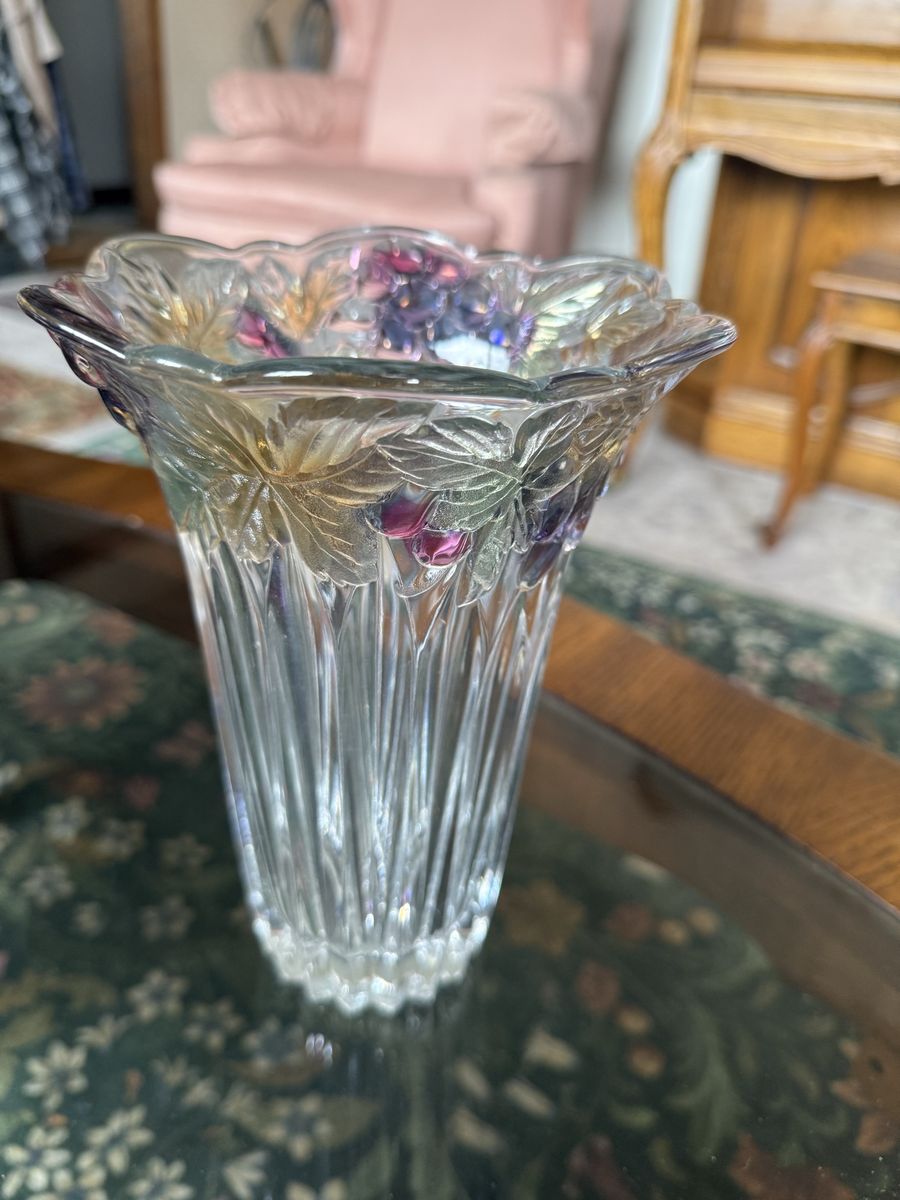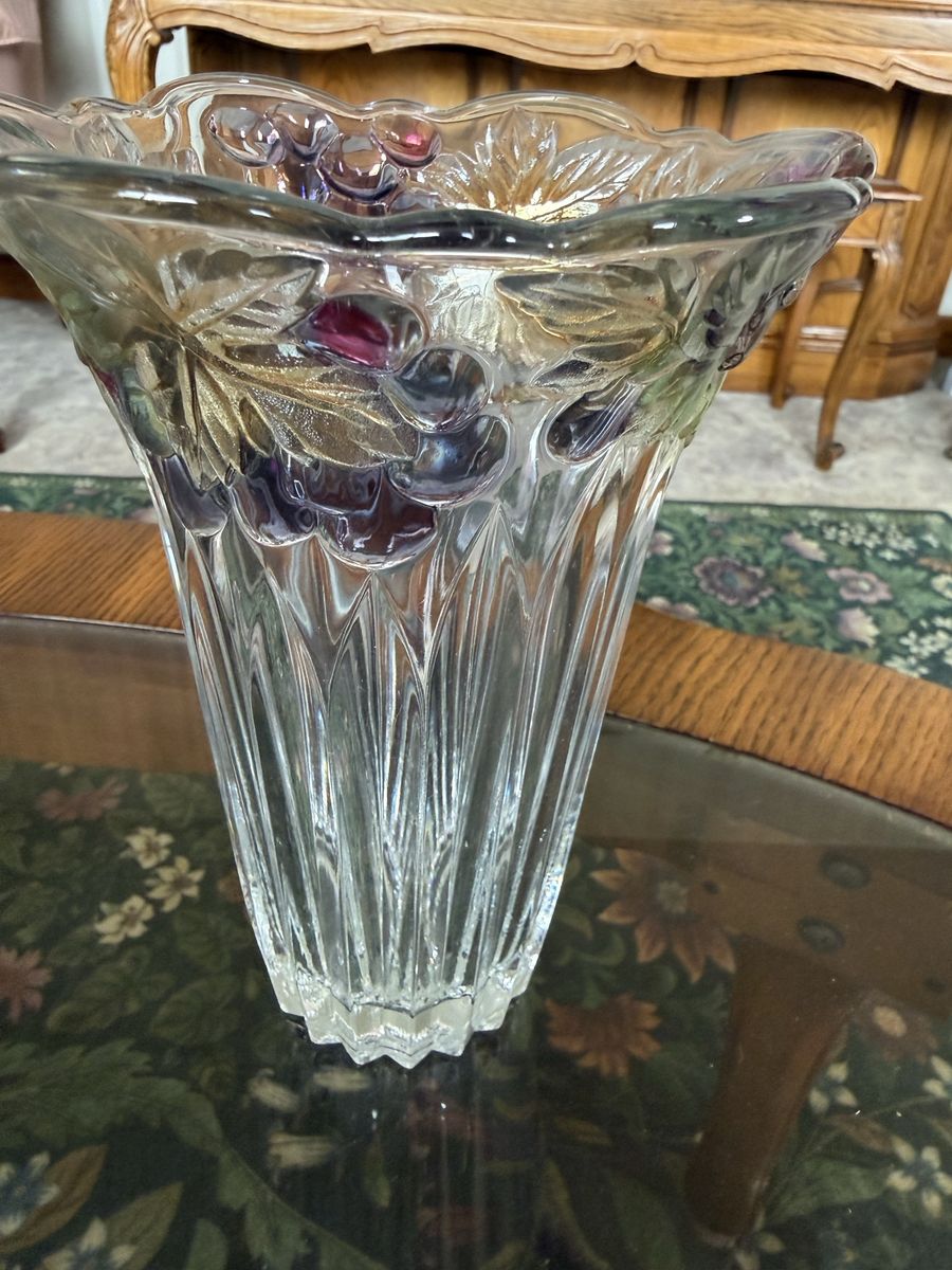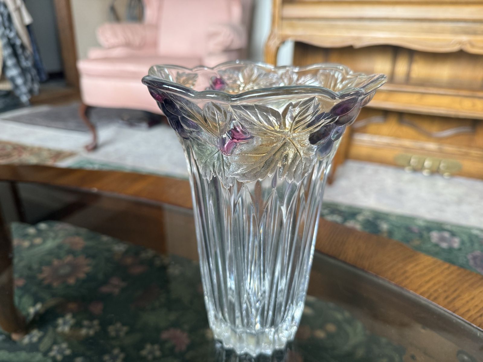 ZelleMedium size flower vase with pretty purple and pink floral pattern on the rim. Great for the summer bouquet. No chips or cracks.