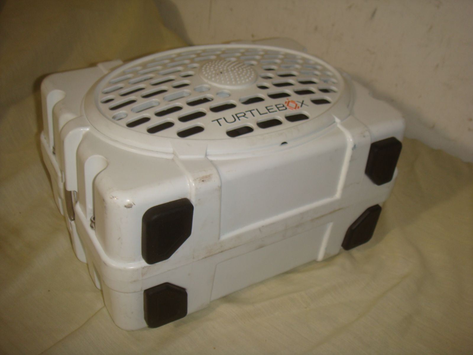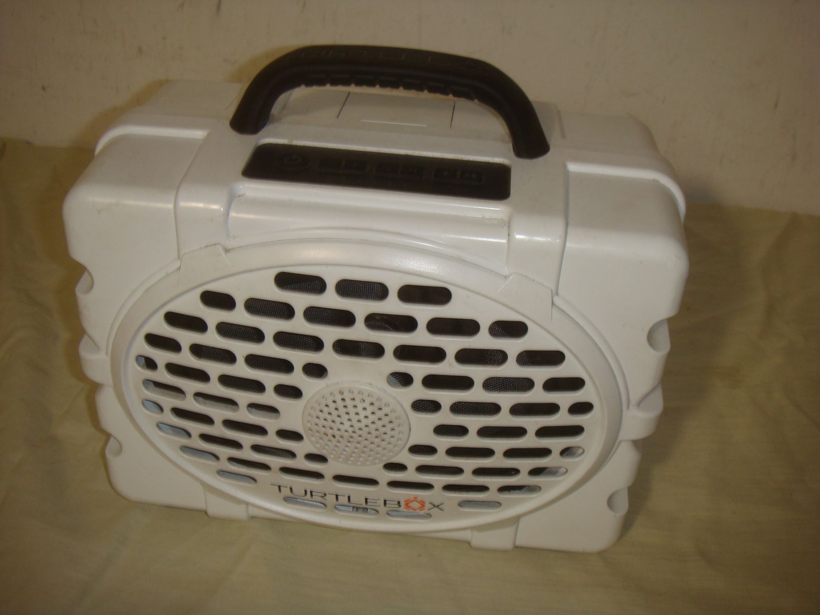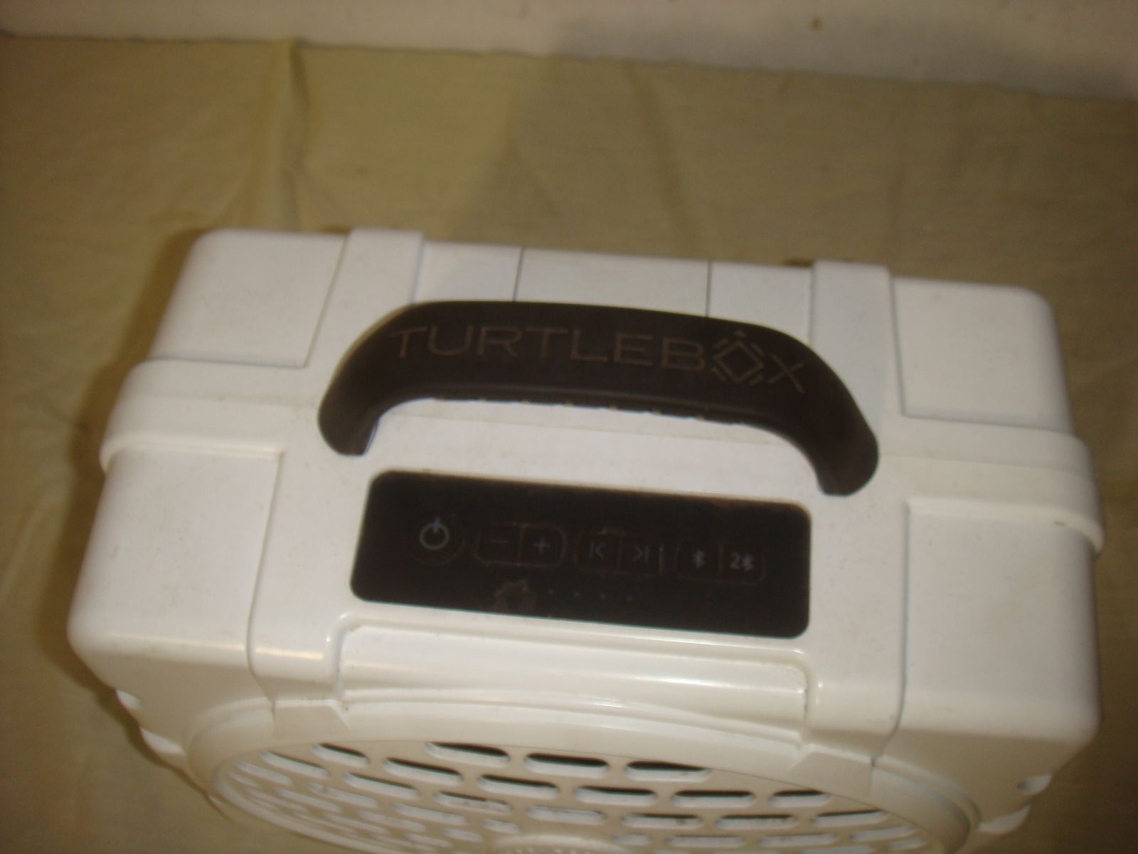 ONE TURTLEBOX GEN 2 RUGGED WATERPROOF WIRELESS BLUETOOTH SPEAKER IN WHITE. This is a used speaker that is a bit dirty with signs of use, but that works perfectly and sounds amazing! It is the speaker only without accessories (you will need to get a 15v 3A power adapter/charger to charge it). It comes with everything shown. This is your chance to save big-time so don't miss out!!