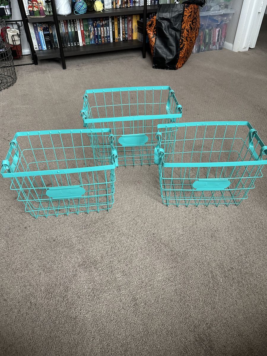 VenmoThree storage baskets. The middle is slightly bigger than the other two. Middle is 14 1/2 inches wide, 10 inches deep, 10 inches tall. The other two are 12 1/2 inches wide, 9 inches deep, 9 inches tall. Cash or Venmo please.