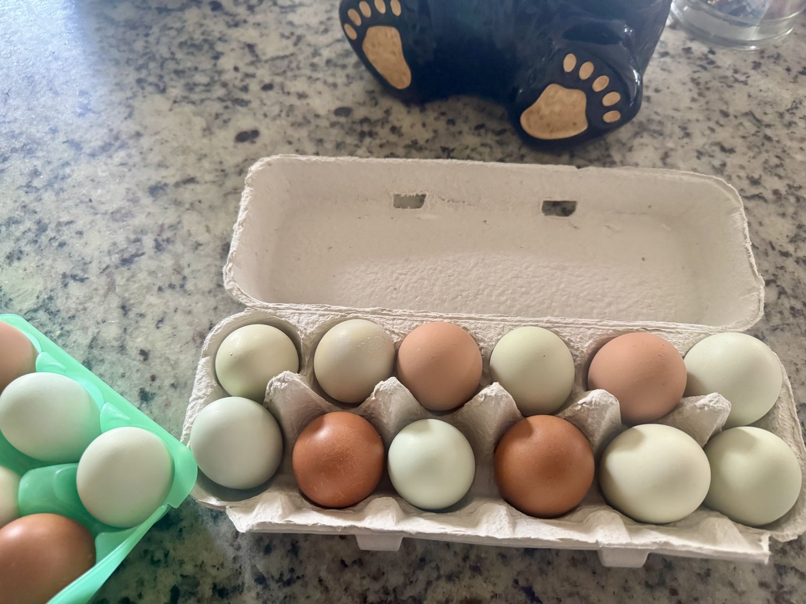 The hens are fed a variety of greens, fruits and a protein rich layer. Eggs are collected daily, and dates at time of laying are written on the carton :)