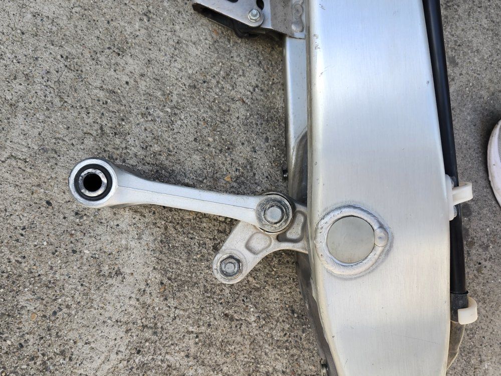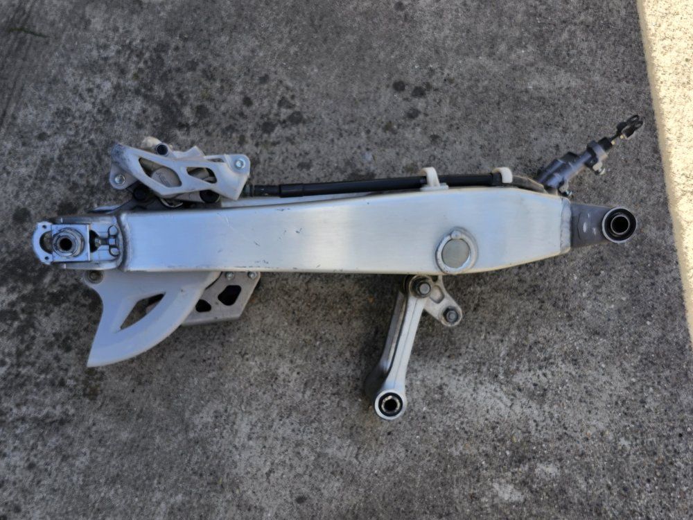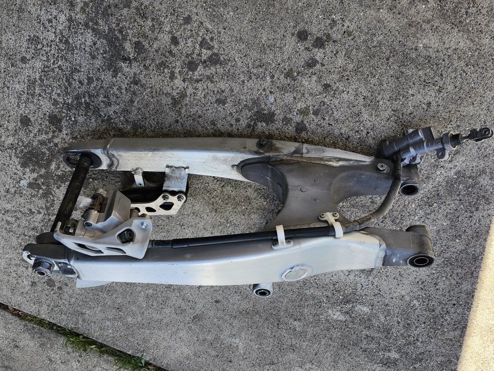stock rear swing arm with linkage and rear brake pads look new.