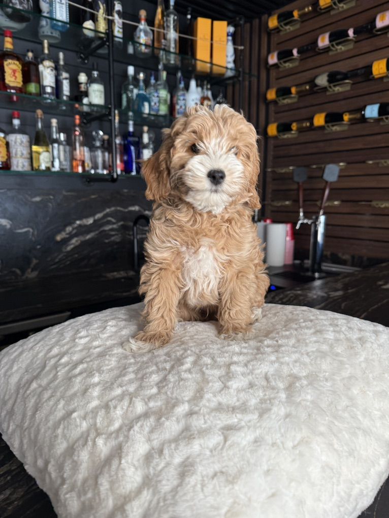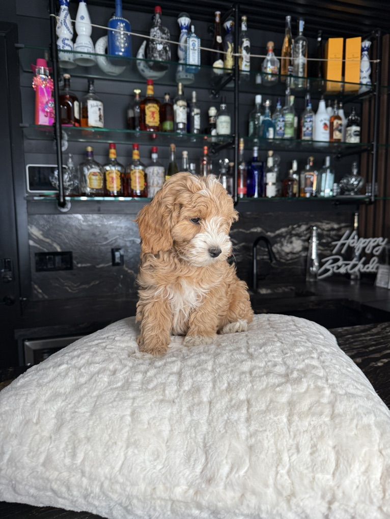 ApplePayThis beautiful mini goldendoodle boy has the perfect wavy hair! No shedding at all! He has gorgeous blocky faces and perfect conformation he is doggy door trained and loves the I be with his people!