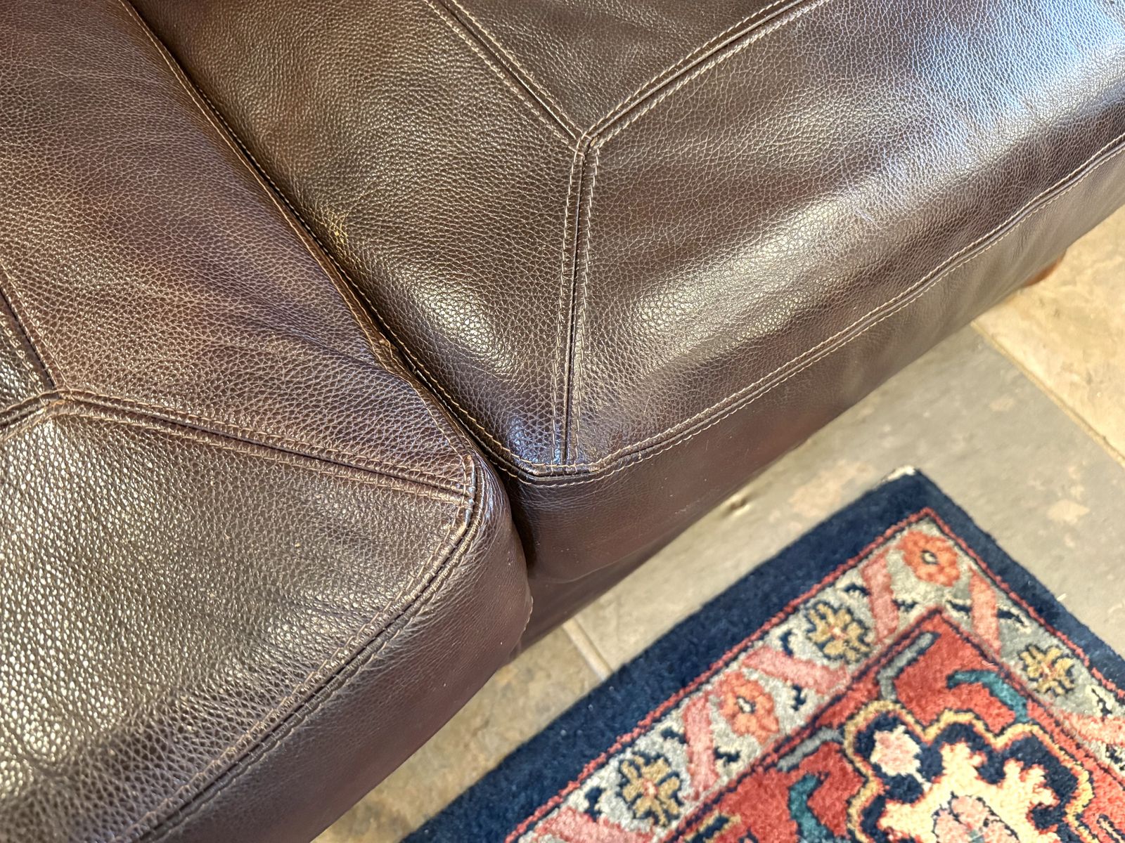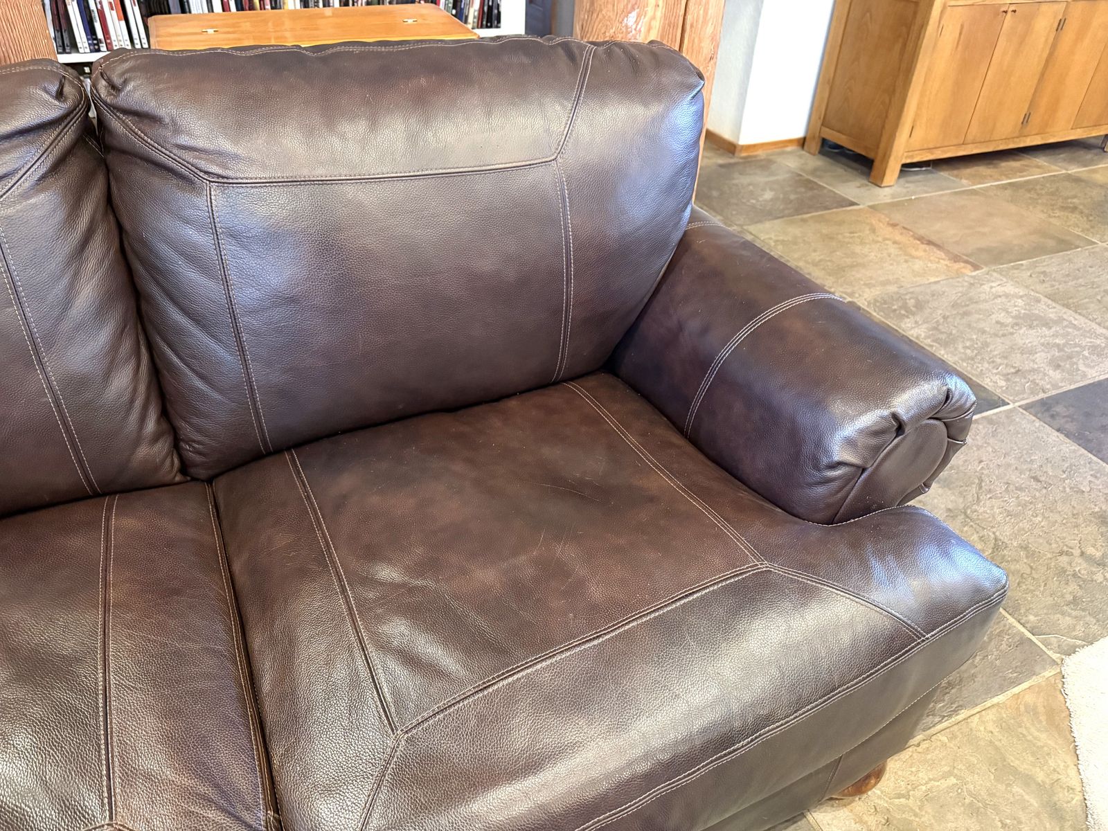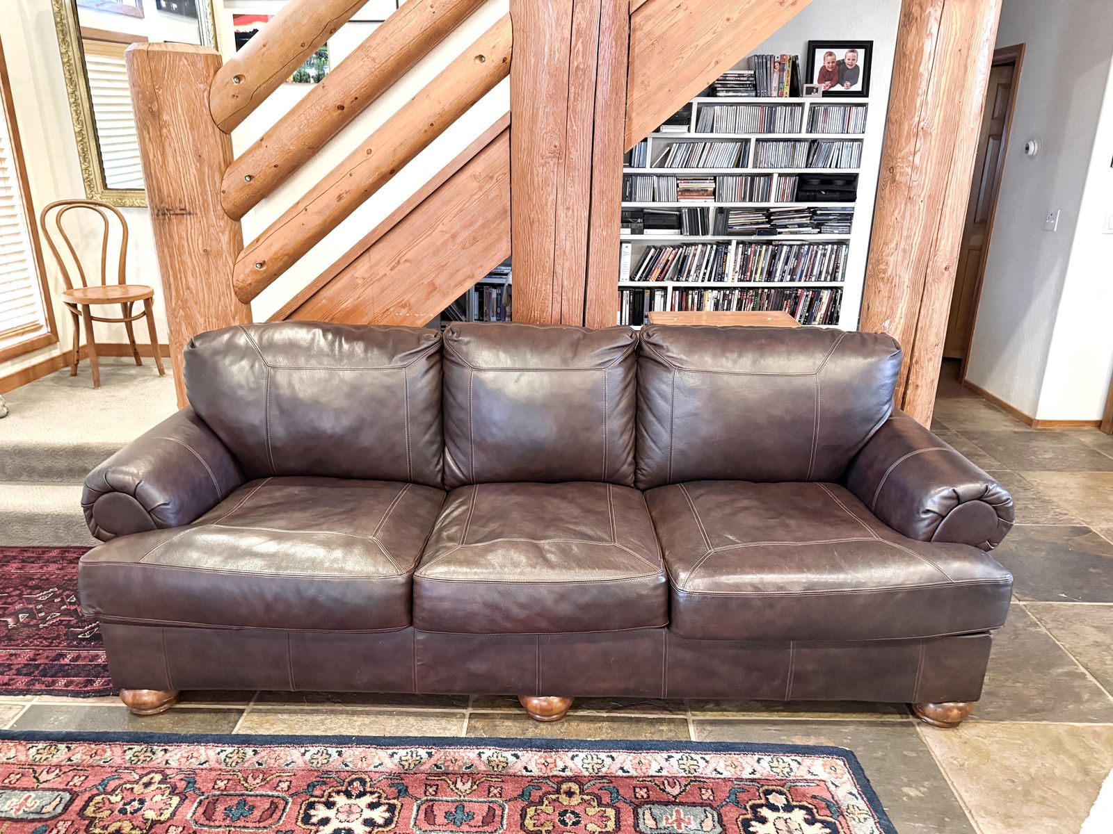 VenmoComfy dark brown couch. Has rolled arms. Three seat cushions. Stitched details on cushions and arms. 8ft wide, 3.3ft deep, 3ft high.