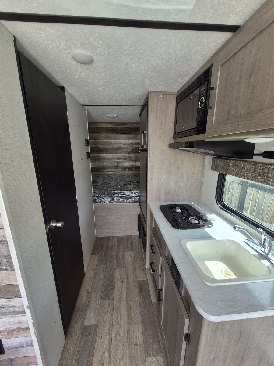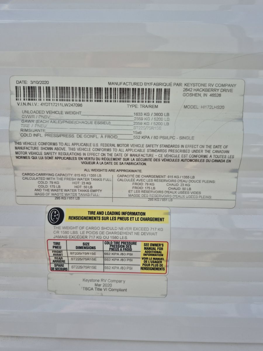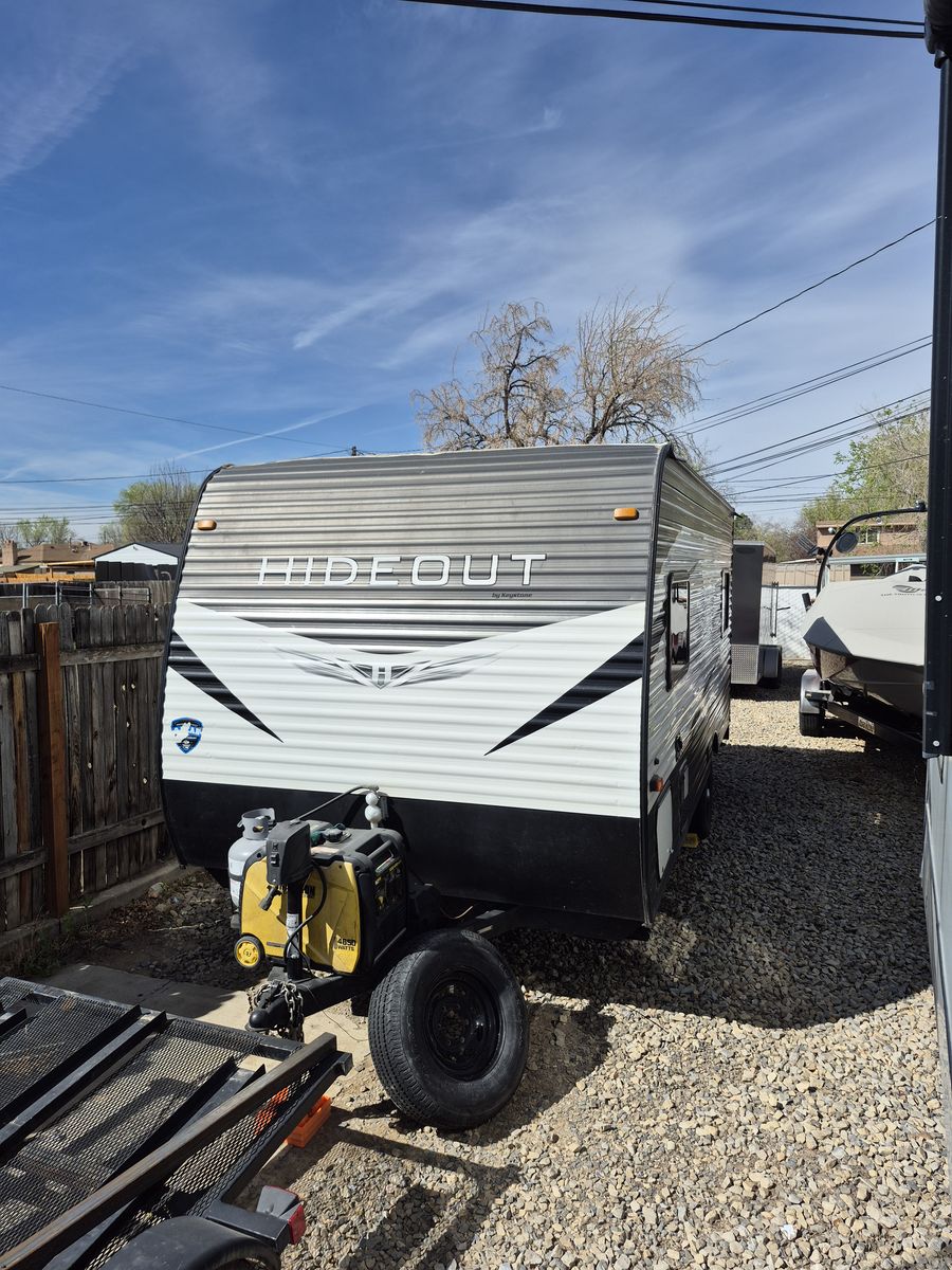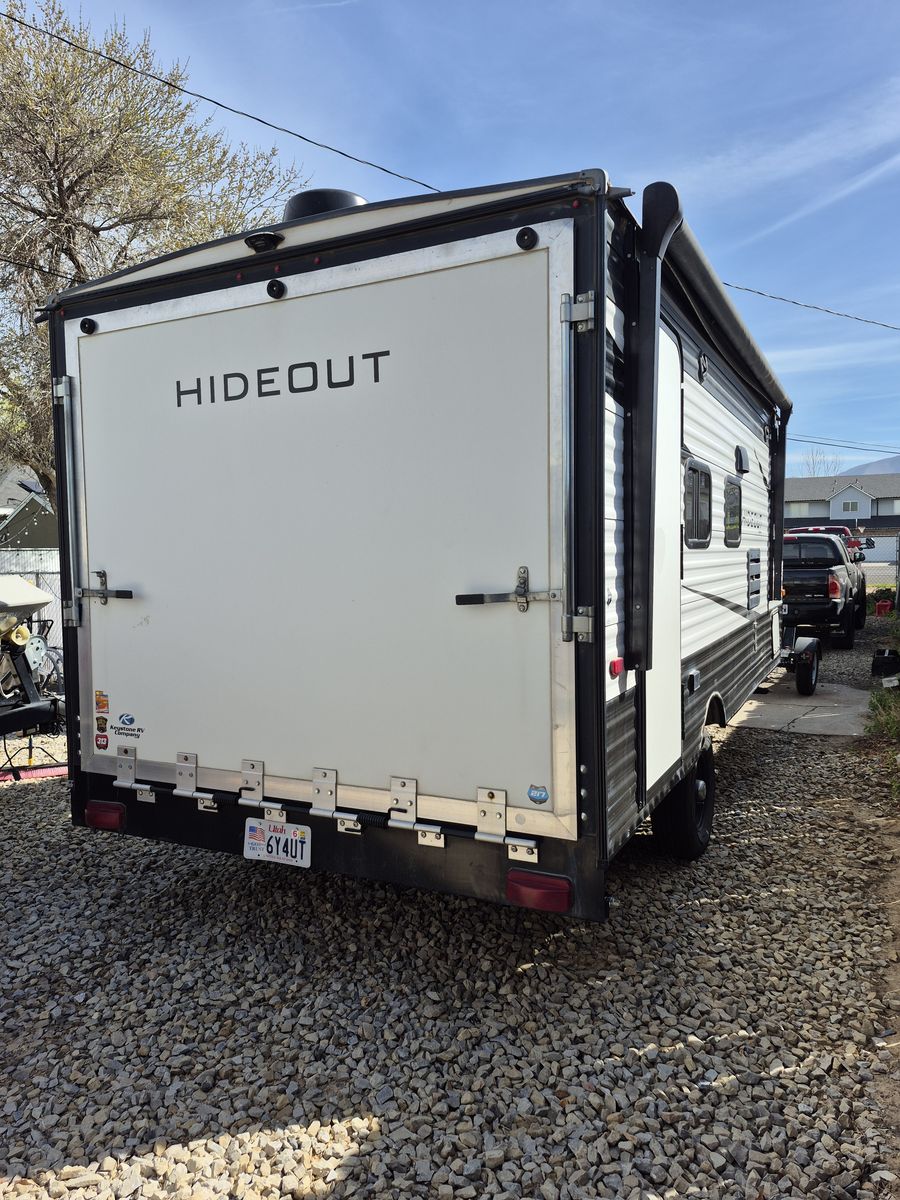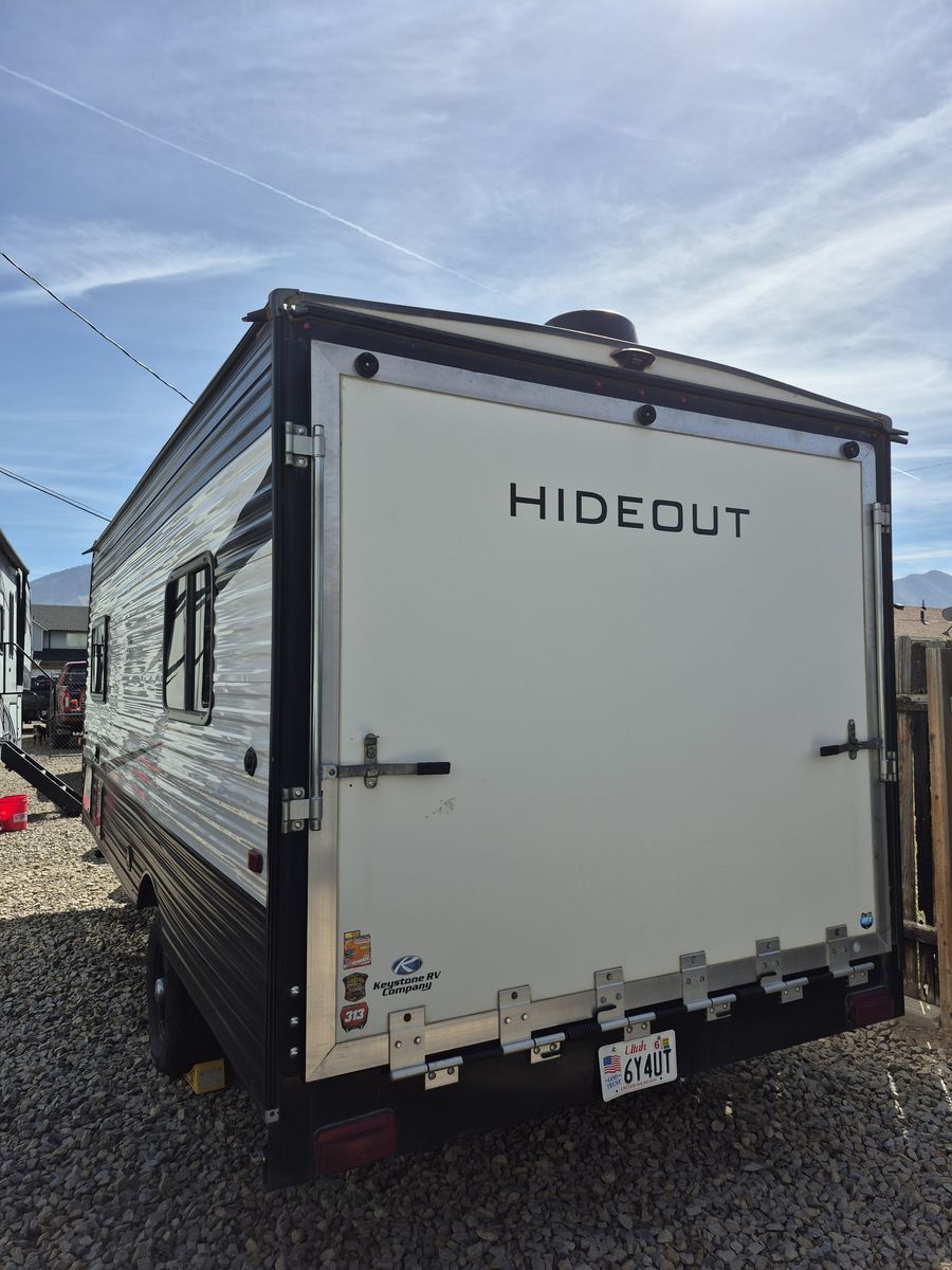 2020 Keystone Hideout 172LHS Toy Hauler Travel Trailer Length: 21 ft Garage: 7.5 ft Dry Weight: ~3,600–3,800 lbs GVWR: 5,200 lbs Sleeps: 4 Layout: Compact toy hauler with rear cargo Bed: Queen bed up front Bath: shower Kitchen: 2-burner stove, fridge, sink Other: Power awning, A/C, furnace, 30-amp service, spare tire