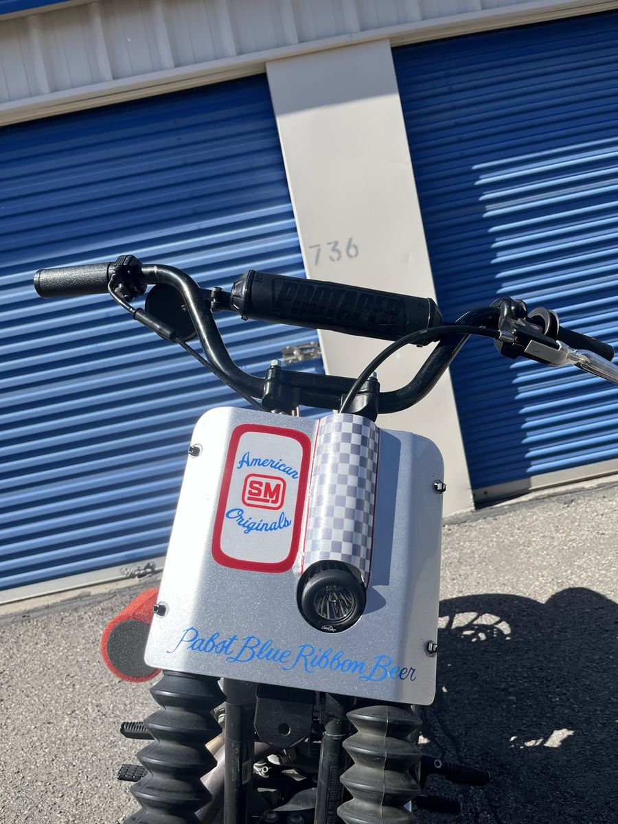 Features!… ️Biltwell moto bars, and throttle! ️Custom number plate headlight, and custom tail and seat! ️Custom paint! ️Custom exhaust! ️Uni air-cleaner! ️Converted to chain! ️ ️New Lithium battery!