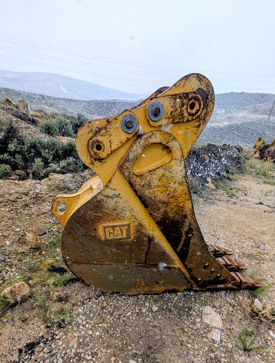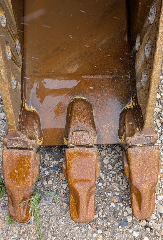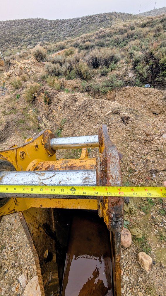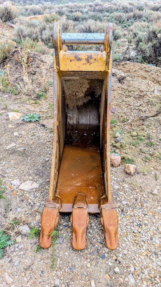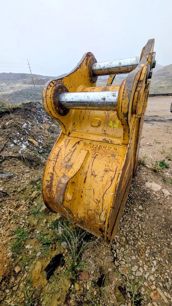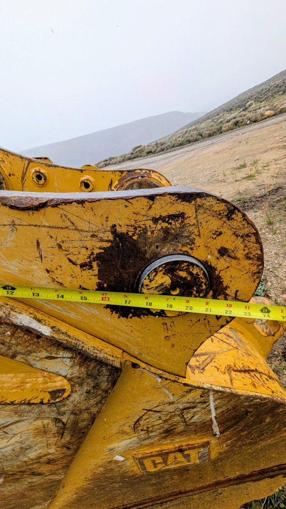 This is a Cat excavator bucket, very light use. This is it's original teeth, 24" wide trenching bucket. 14" wide ear to ear and 19 1/4" pin center to center. It has 90 millimeter pins. It was originally on a Cat 335, should fit a 324, 326, 329, 330 or 335. may fit a 336 if it has a 329 B-series quick coupler. This should also fit 30-40 ton Komatsu, John Deere or Link-Belt excavators. Cash or Cashier's Check