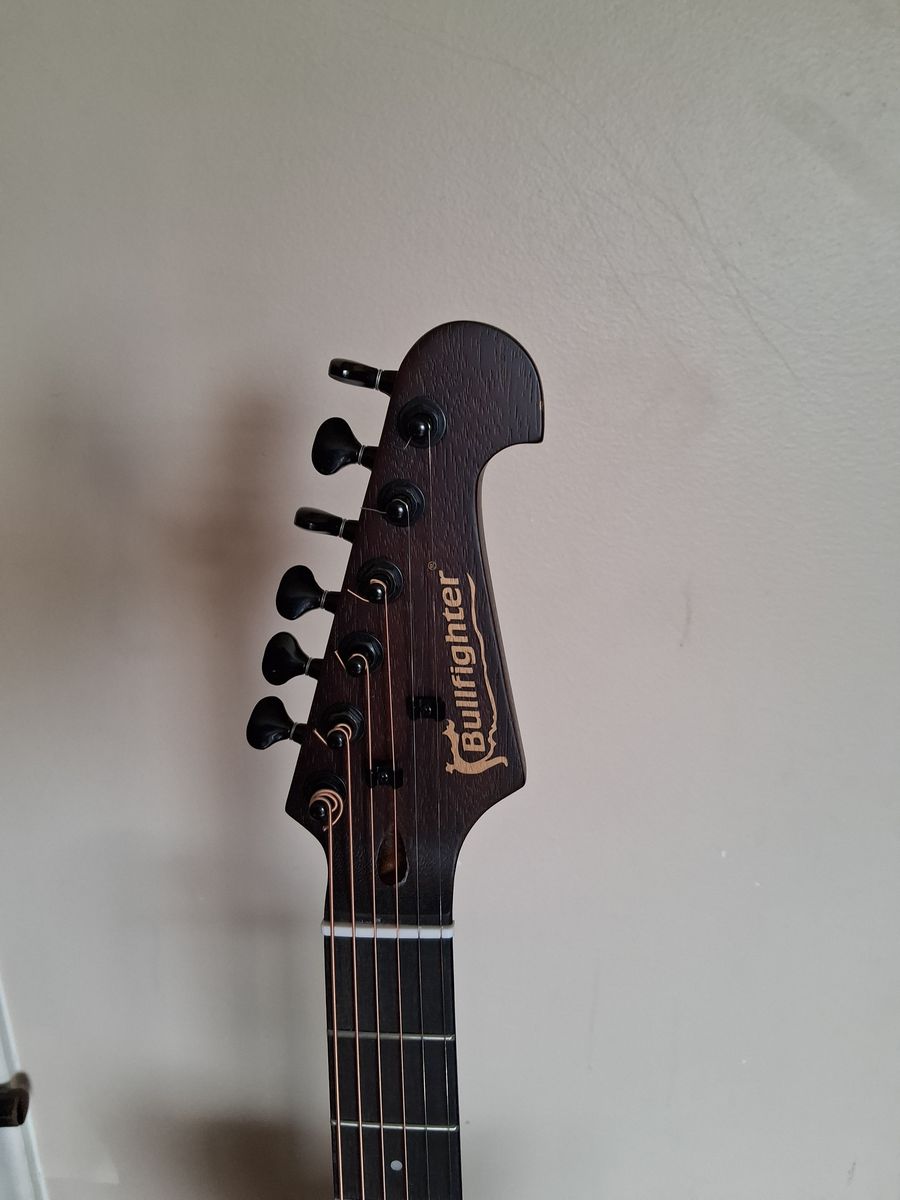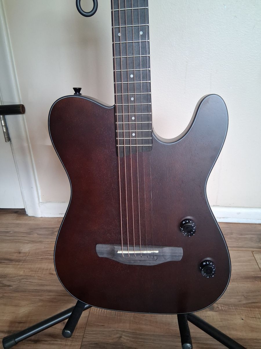 Bullfighter Silent Travel Guitar, mahogany body, rosewood fingerboard, acoustic electric guitar. Plays and sounds great! Here is a review https://www.youtube.com/watch?v=0Gcl4KIBxO0 Text Reed 801-347-7466