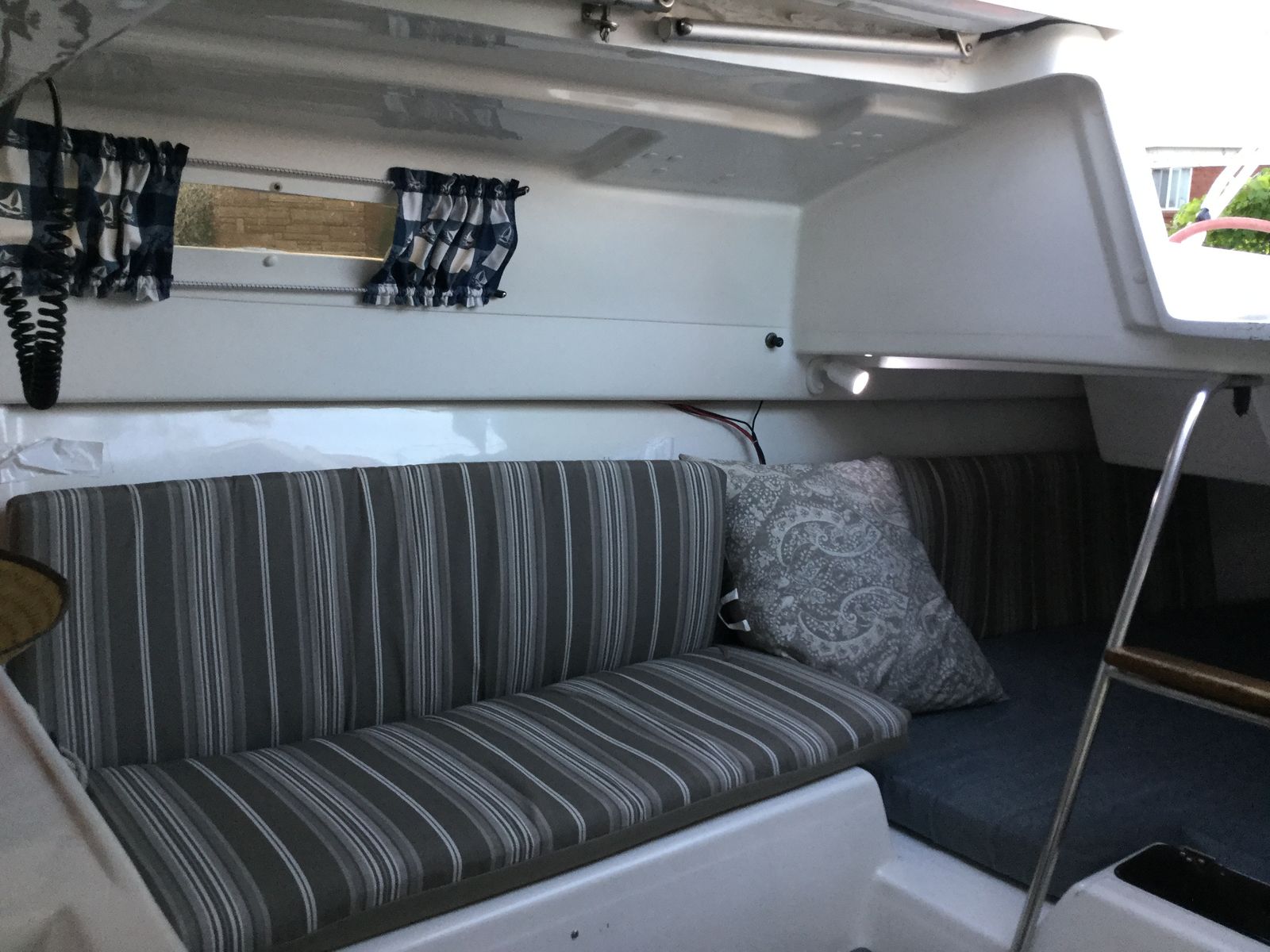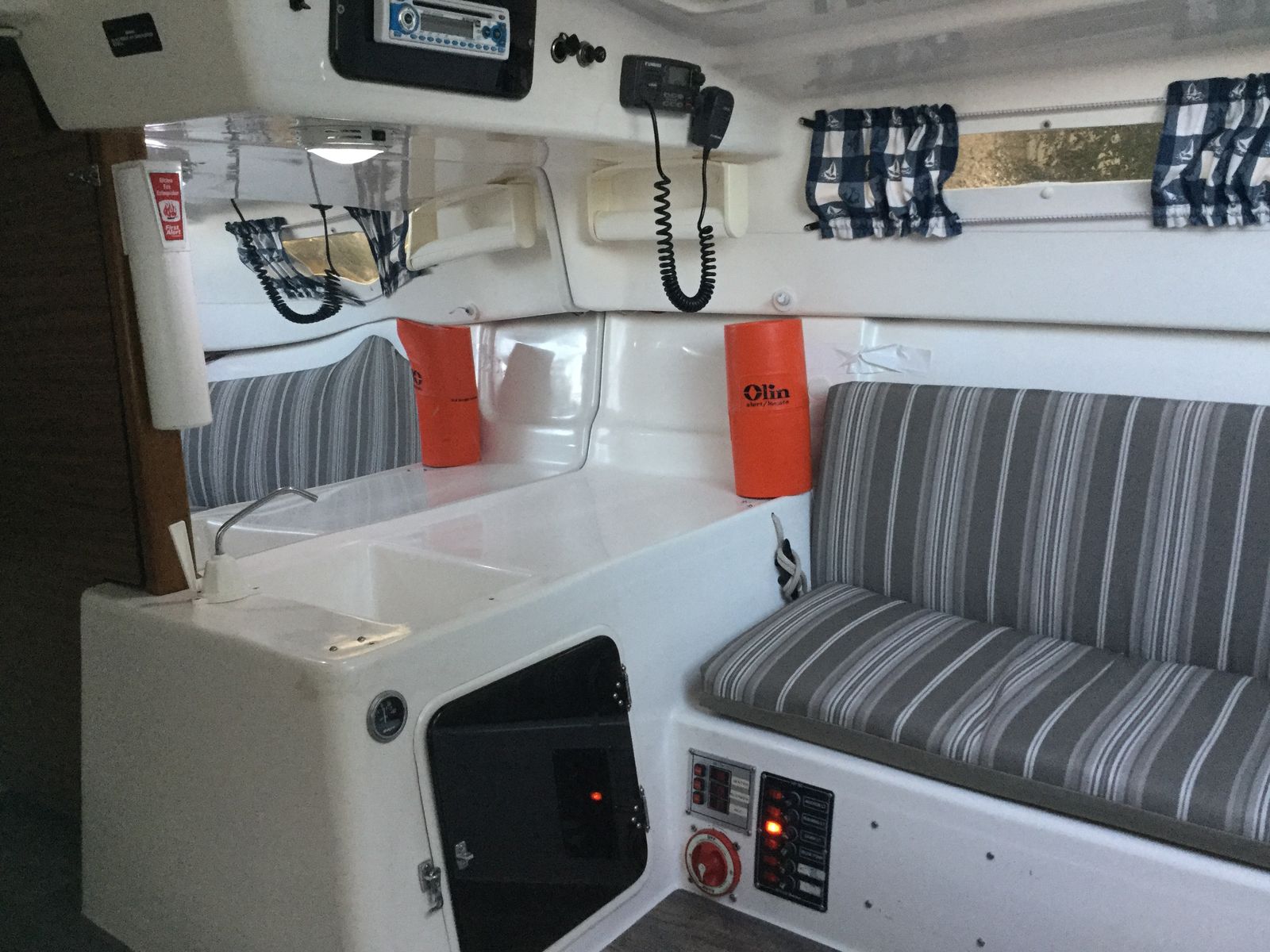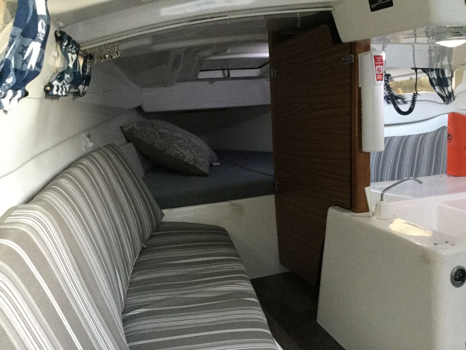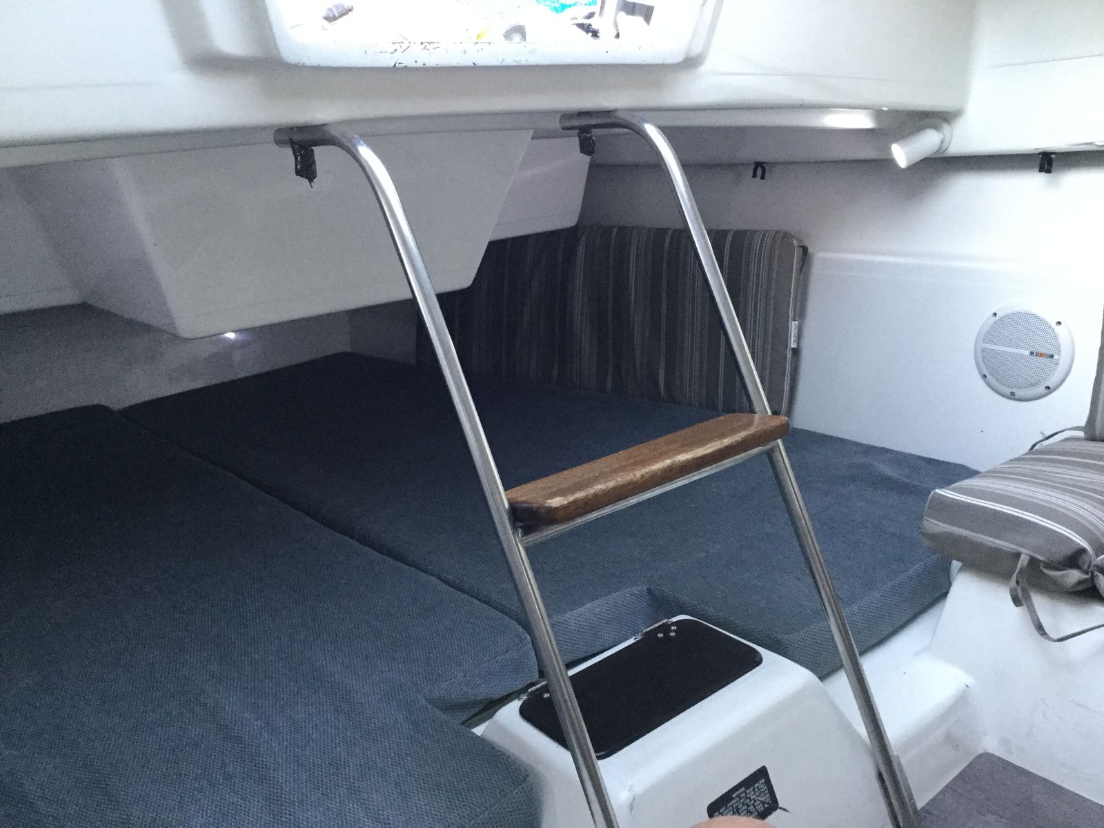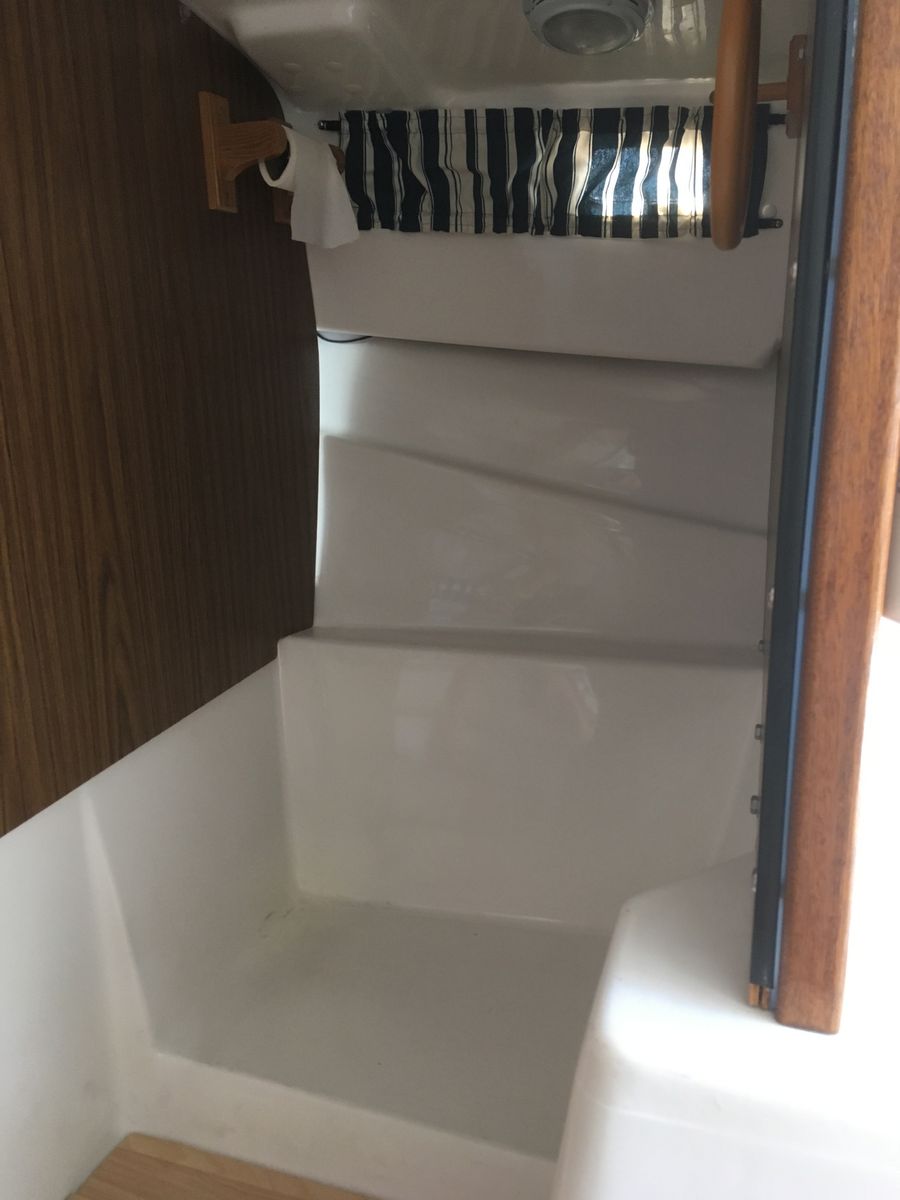 All redone electrical, with led lights, stereo with auxilery jack for music, vhf radio, 3 bilge pumps which have never been needed but are ready to go just in case, spotlight, Swim platform, Bimini top, Pop Top cabin for camping, huge queen berth, V berth up front, seperate enclosed private head with removable porto potty (this boat does not smell like most used boats, no funky odor, no moldy wood, your nose will love it) , Sink in Galley with working water pump (sink drains outside, no storage tank), lots of storage underneath sink, storage under bench seats in galley, storage under both berth beds. Privacy drape for V berth, long single berth. huge queen berth (sleeps 5 people total)