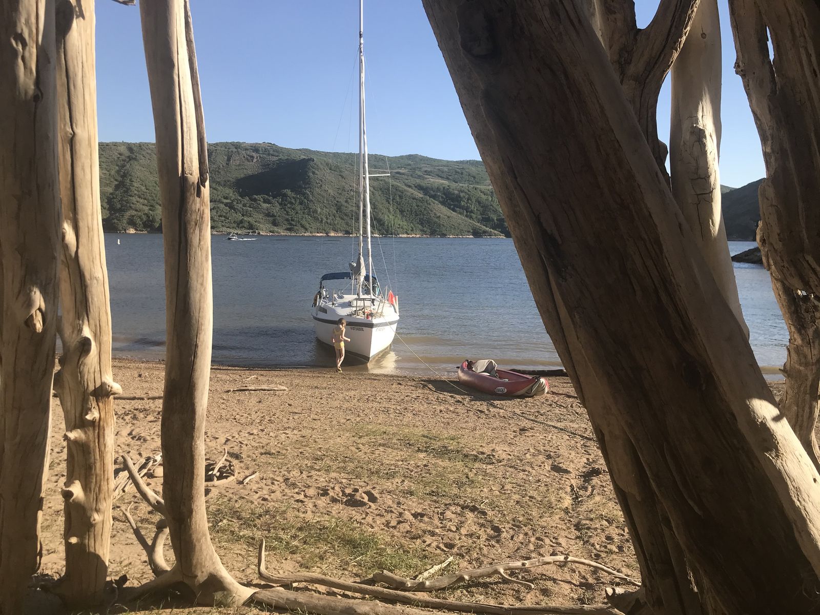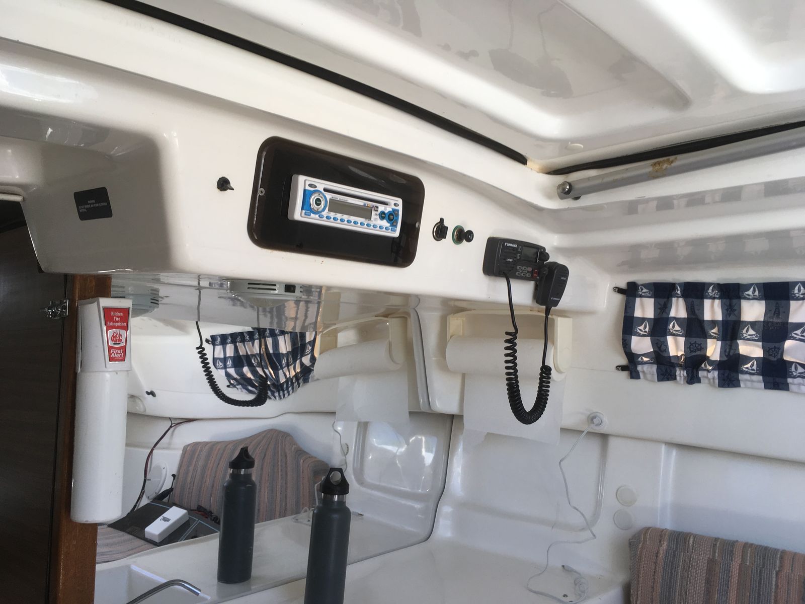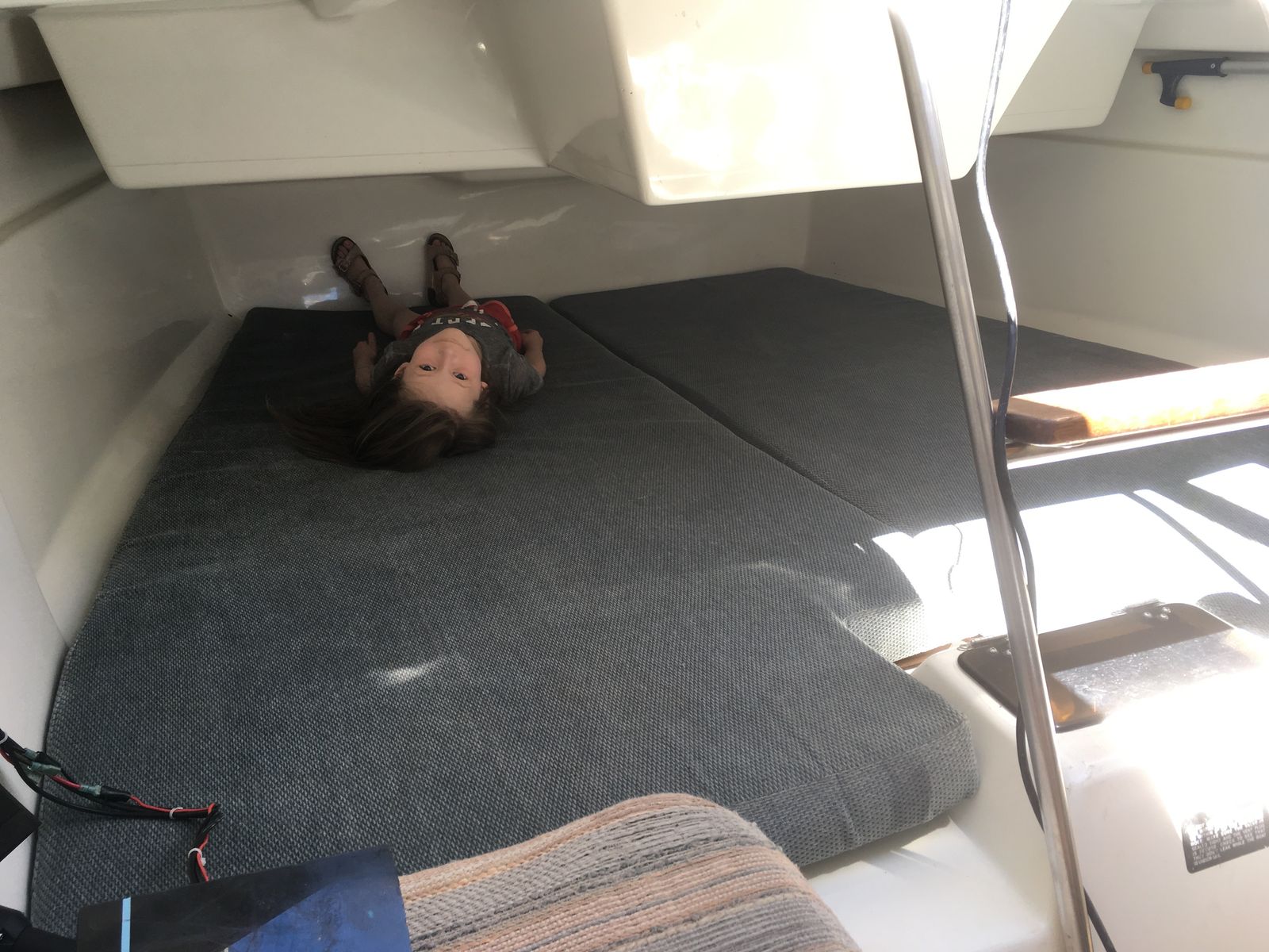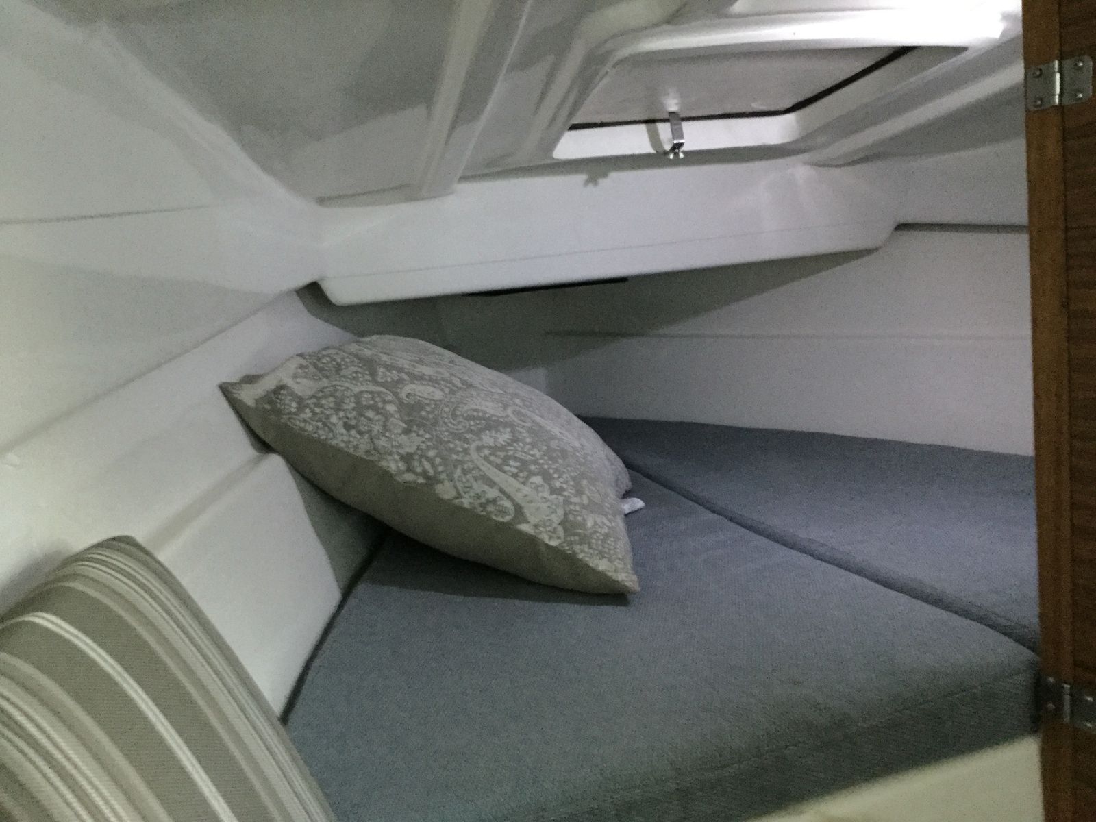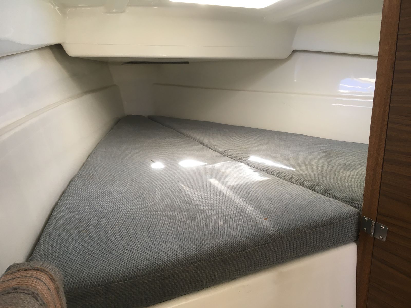 All redone electrical, with led lights, stereo with auxilery jack for music, vhf radio, 3 bilge pumps which have never been needed but are ready to go just in case, spotlight, Swim platform, Bimini top, Pop Top cabin for camping, huge queen berth, V berth up front, seperate enclosed private head with removable porto potty (this boat does not smell like most used boats, no funky odor, no moldy wood, your nose will love it) , Sink in Galley with working water pump (sink drains outside, no storage tank), lots of storage underneath sink, storage under bench seats in galley, storage under both berth beds. Privacy drape for V berth, long single berth. huge queen berth (sleeps 5 people total)