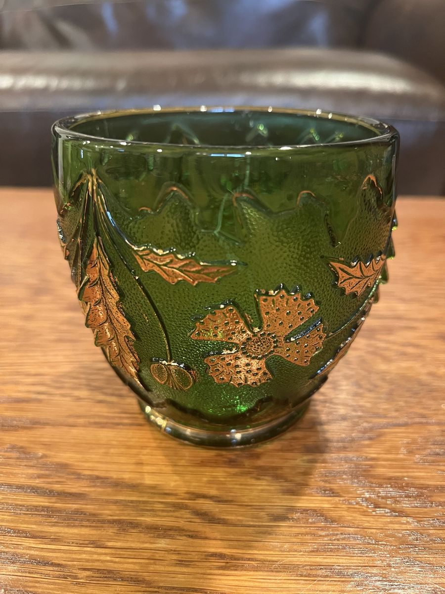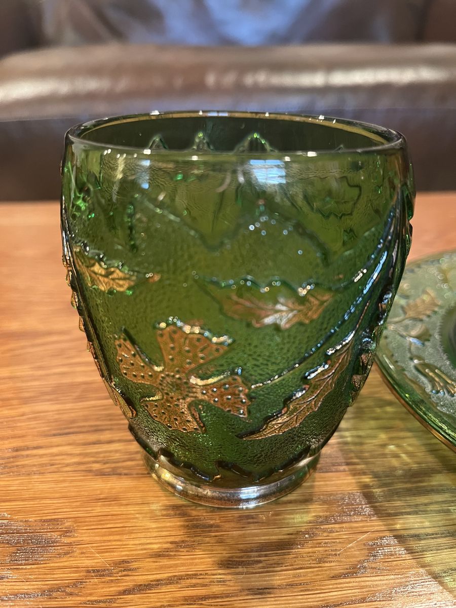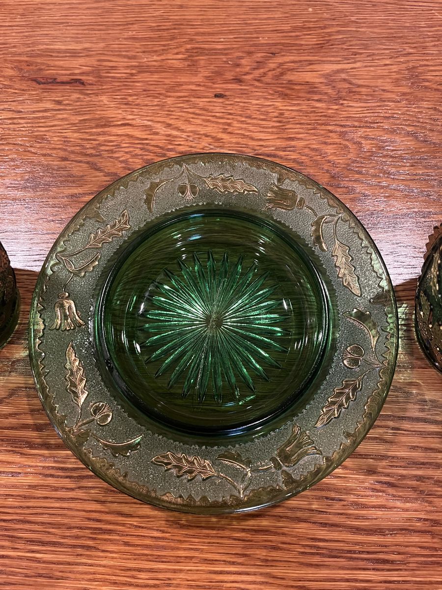 VenmoThis is a set of three. One tumbler, one spooner, and one cheese/butter plate. The tumbler is 3 3/4 inches tall with a 3 inch opening at the top. The spooner is 3 3/4 inches tall with a 3 3/4 inch opening at the top. The cheese butter plate is 7 1/8 inches across x 1 inch tall. These have floral and leaf pattern. The gold trim really adds to the beauty. The glass is a heavier thicker glass. All of these are in excellent condition. Sold as a set. Price is firm.