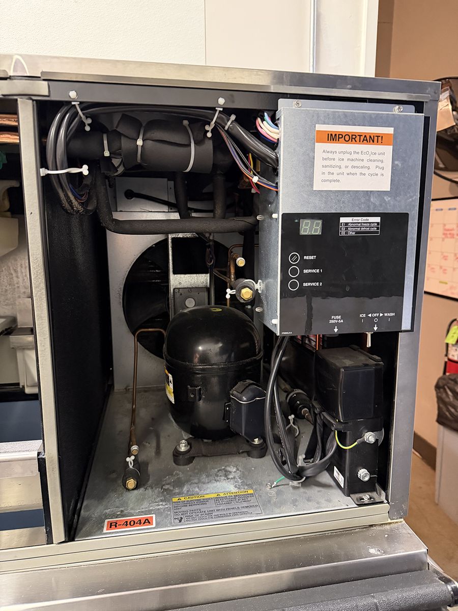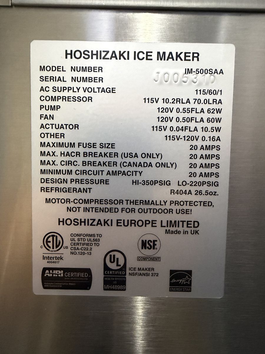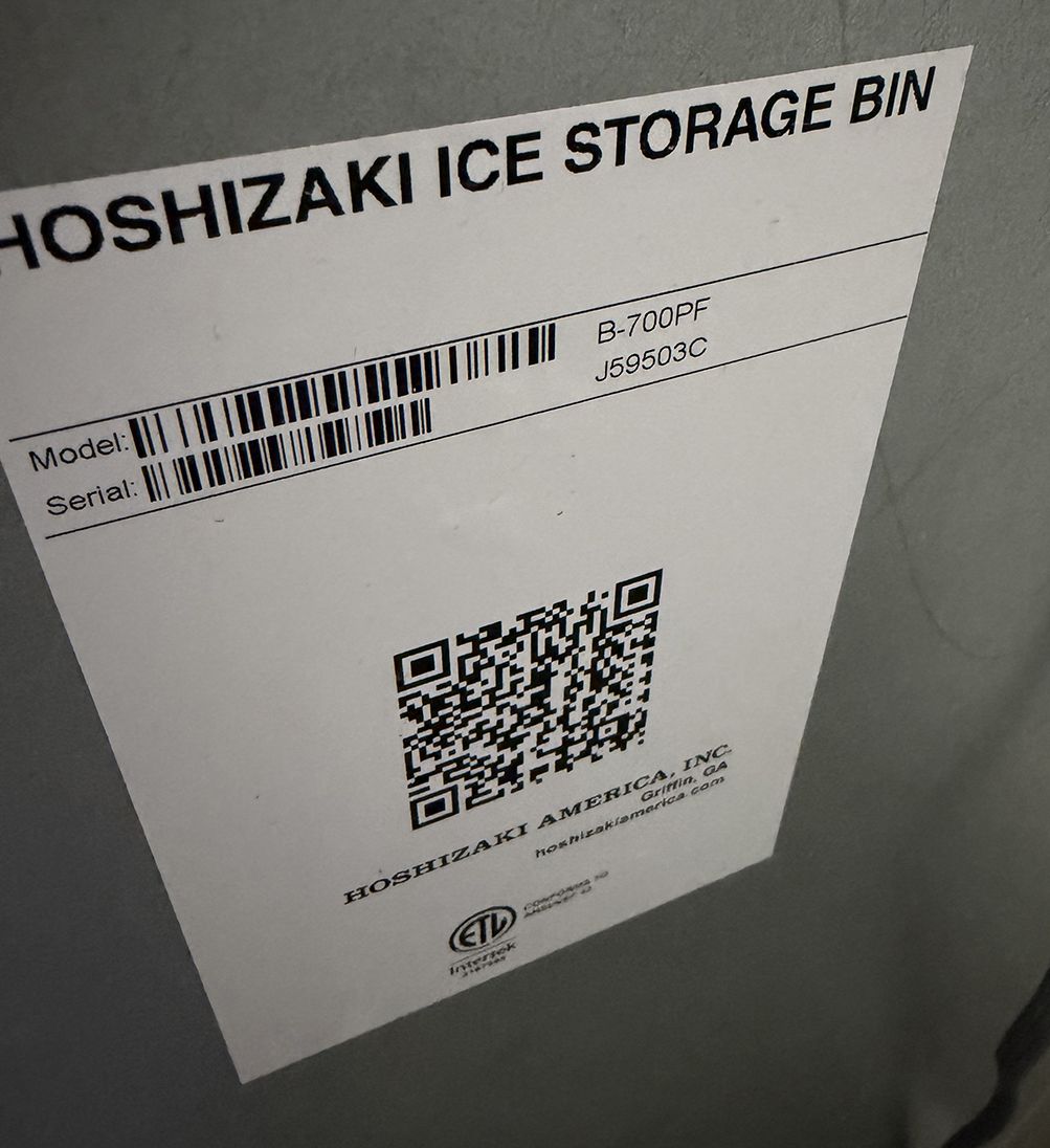 Hoshizaki IM-500SAA air-cooled 1” square-cube ice machine head. Produces-500 lb/24hr. Unit is in excellent condition and was deep cleaned. Unit functions perfectly. Also includes matching Hoshizaki storage bin model B-700PF. Bin is in excellent condition. Local pickup only.