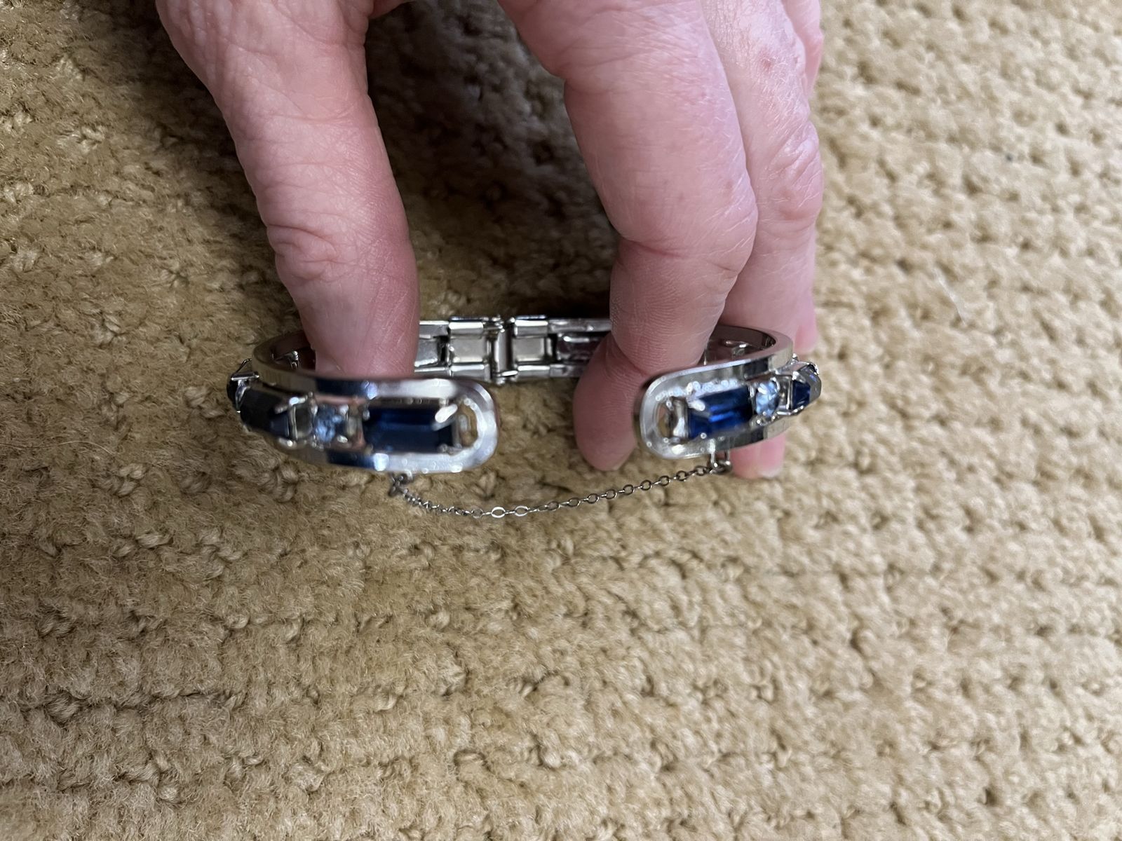 VenmoGorgeous 1950's clamp style bracelet. This has two different colors of blue rhinestones. A light blue like a topaz color, and a darker blue sapphire color. This has a delicate silver safety chain on it. It is very beautiful and it is in excellent condition. No trades. Price is firm.