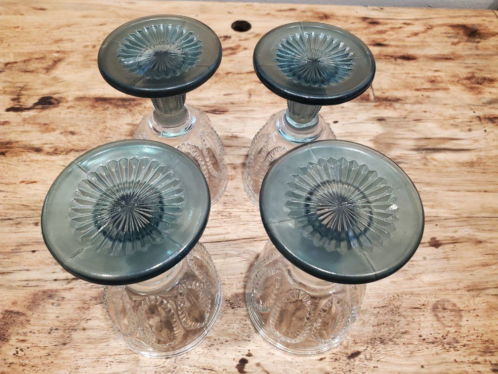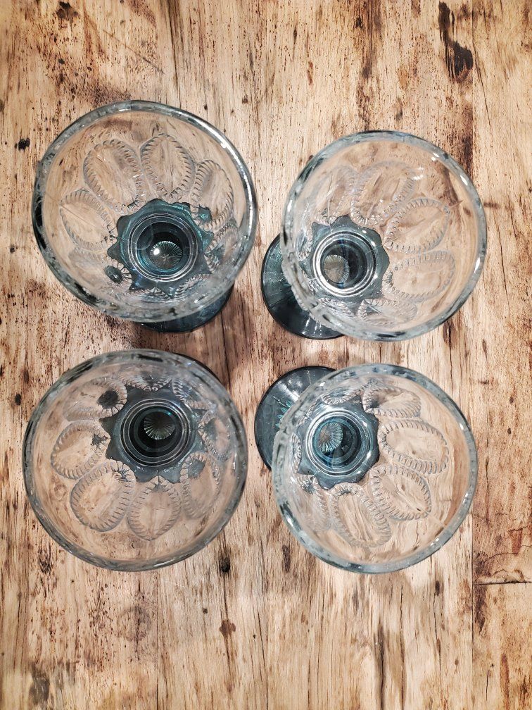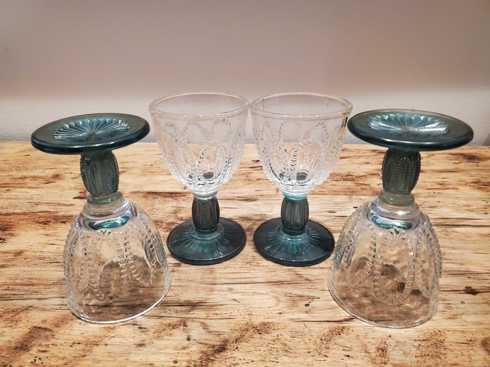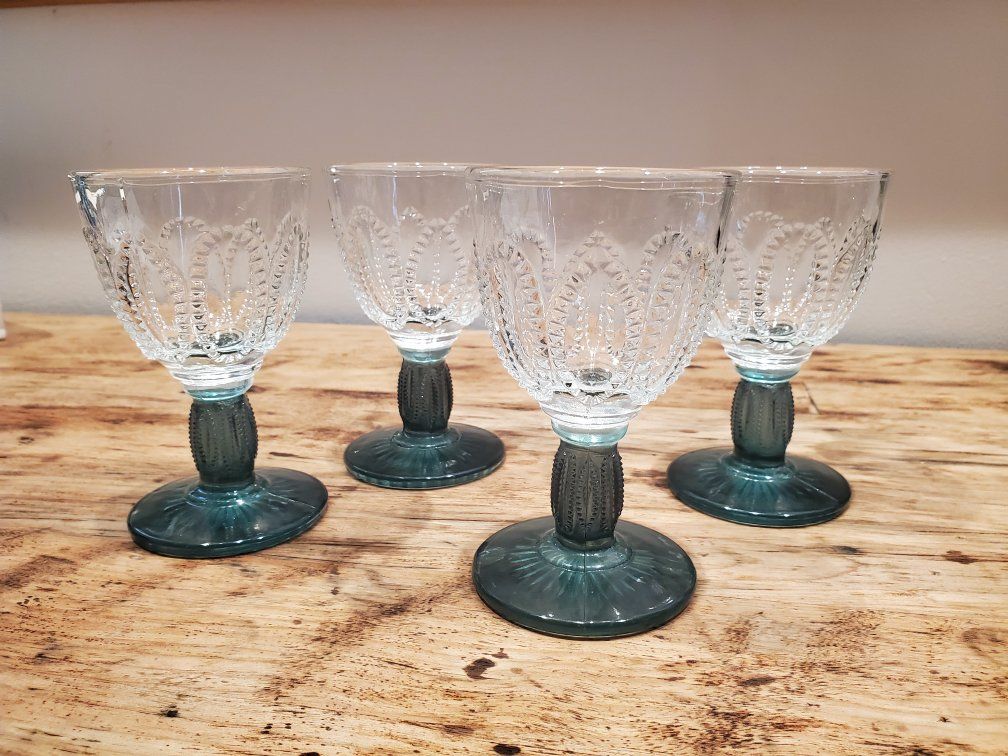 Very pretty Set of 4 Vintage Wine Glasses/Goblets, I believe circa 1940's, pressed glass, the top has a raised Ornate Clear Leaf Pattern with Green Stem and Base. 4 1/2” x 2 3/4" , Approximately 4 oz.
