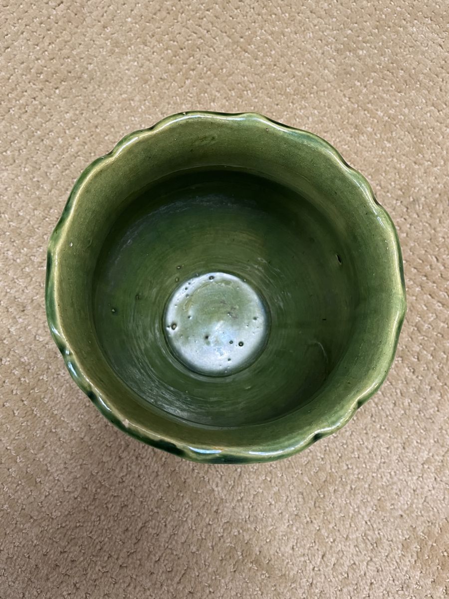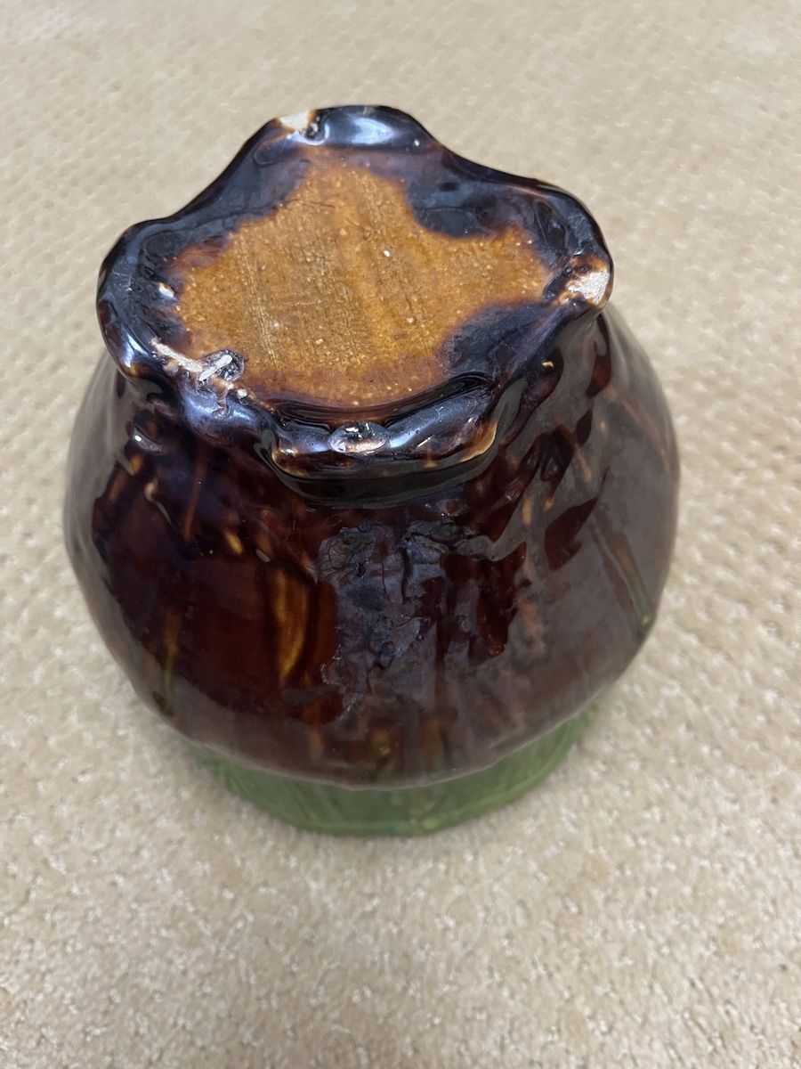 VenmoThis was made in about the 1920's. I believe it is from the Weller Pottery Company. It is a drip glaze design that was all the rage at that time. This has a pretty green on the top that blends into a chocolate brown on the bottom. The glaze is a gloss. This measures 6 1/2 inches tall x 6 3/4 inches across the top, and the base is 4 inches wide. There is a tiny glaze skip under the top rim. Inside the pot there are small flecks of pottery, that are inside the glaze. There is a little bit of hard water inside that I have not tried to remove. There is a tiny spot where the glaze is missing. There are no markings on this planter. It has a classic design that any pottery lover would love. It is about 100 years old and the wear is consistant to the age and use. It is a beautiful anitque planter or pot. Must see. Price is firm.