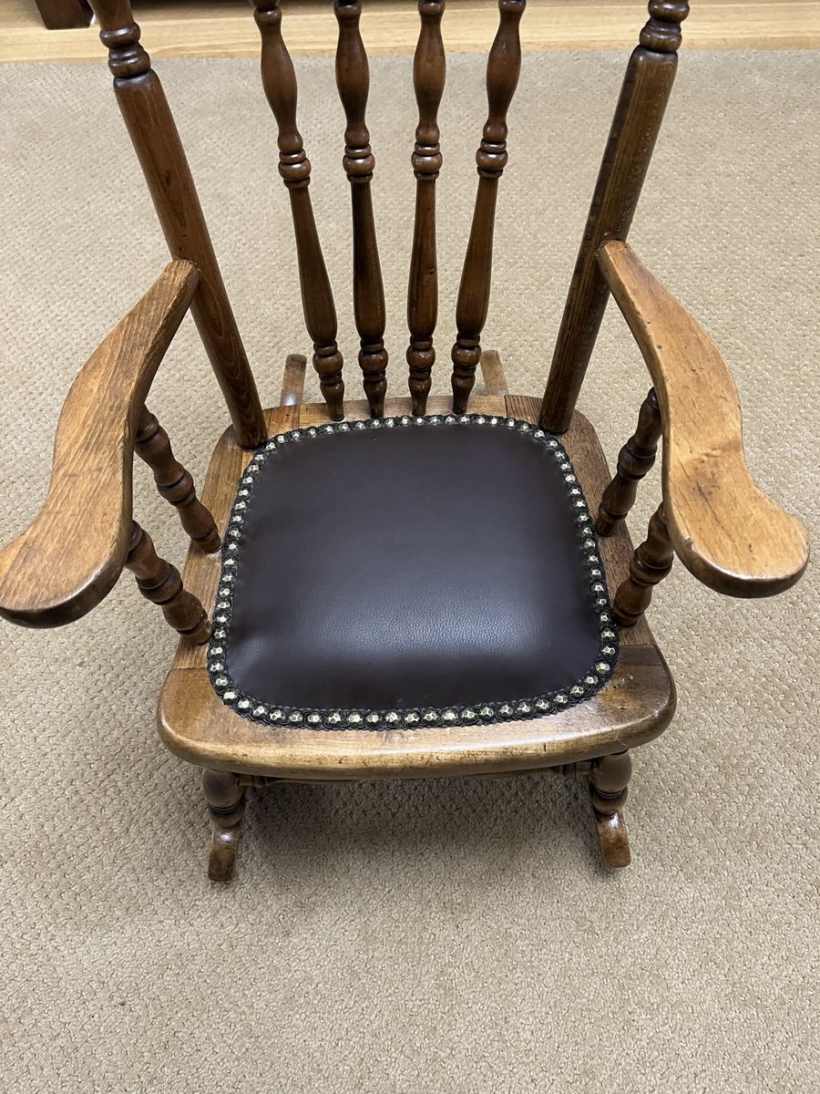VenmoThis is a very nice solid wood child's rocker. I believe the wood is maple. The leather seat is a chocolate brown color. It is 26 inches tall x 15 1/2 inches wide. The seat is 10 1 /2 inches x 11 inches deep. The chair rockers are 22 inches long. This is a well built rocker. A real must see in excellent condition. Price is firm.
