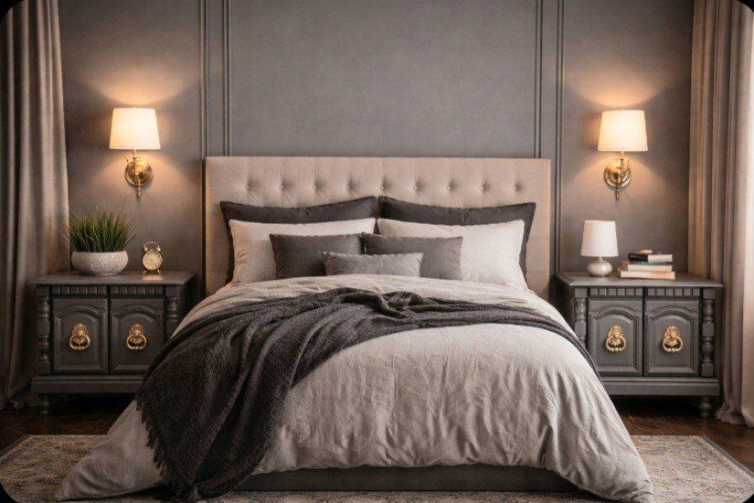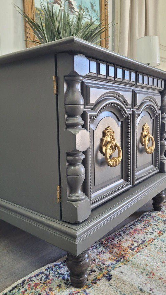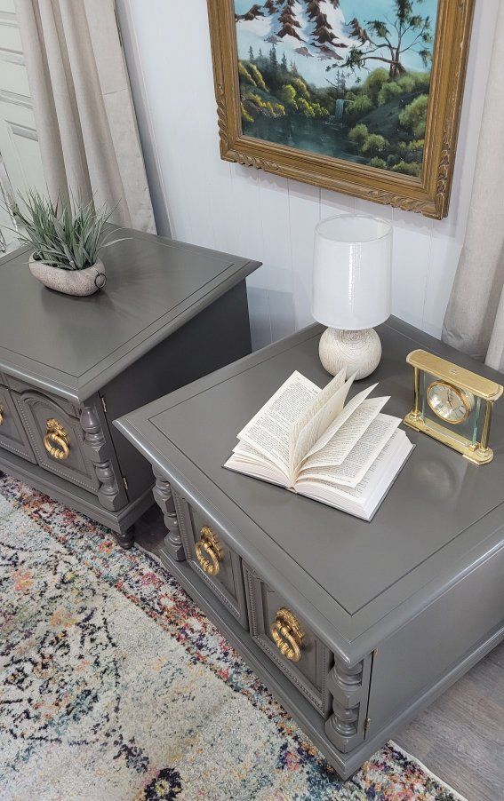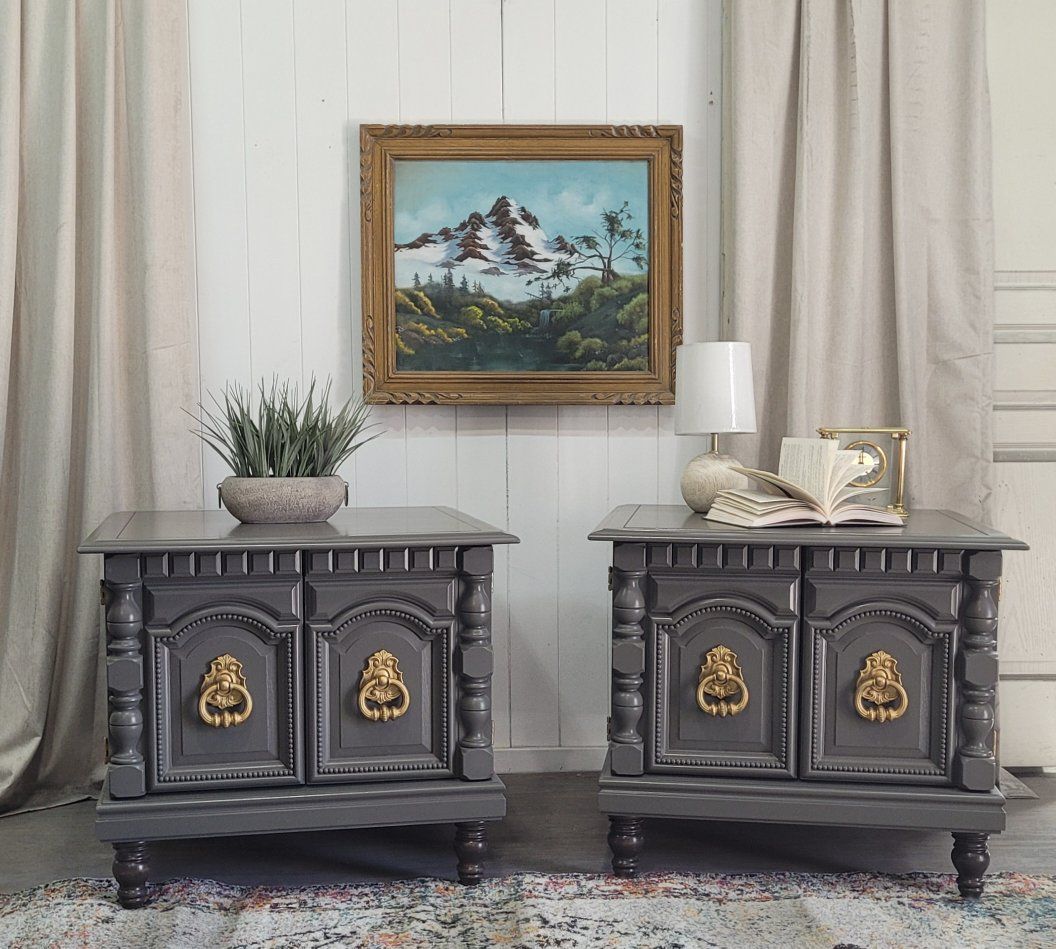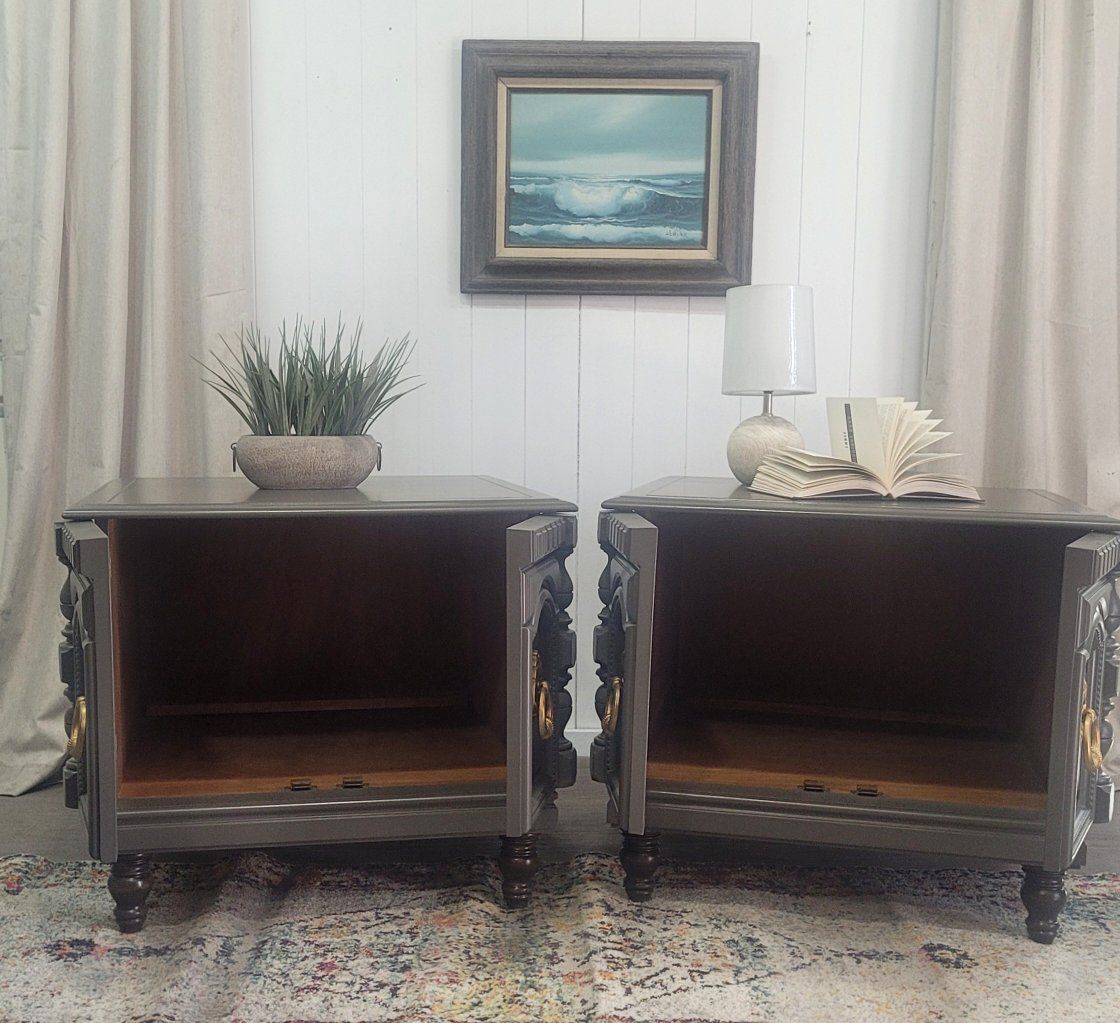 This vintage set has a date stamp of Jan 1973! I finished these in Sherwin Williams color Urban Bronze. I added dark stained wood legs to add height to this set. It has the original chunky hardware that I cleaned and added gold to for a nice pop off the paint. 28" square x 24.5h Delivery is available. Depending on distance there may be a fee.