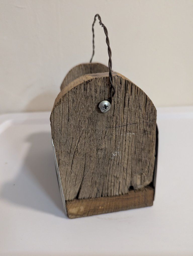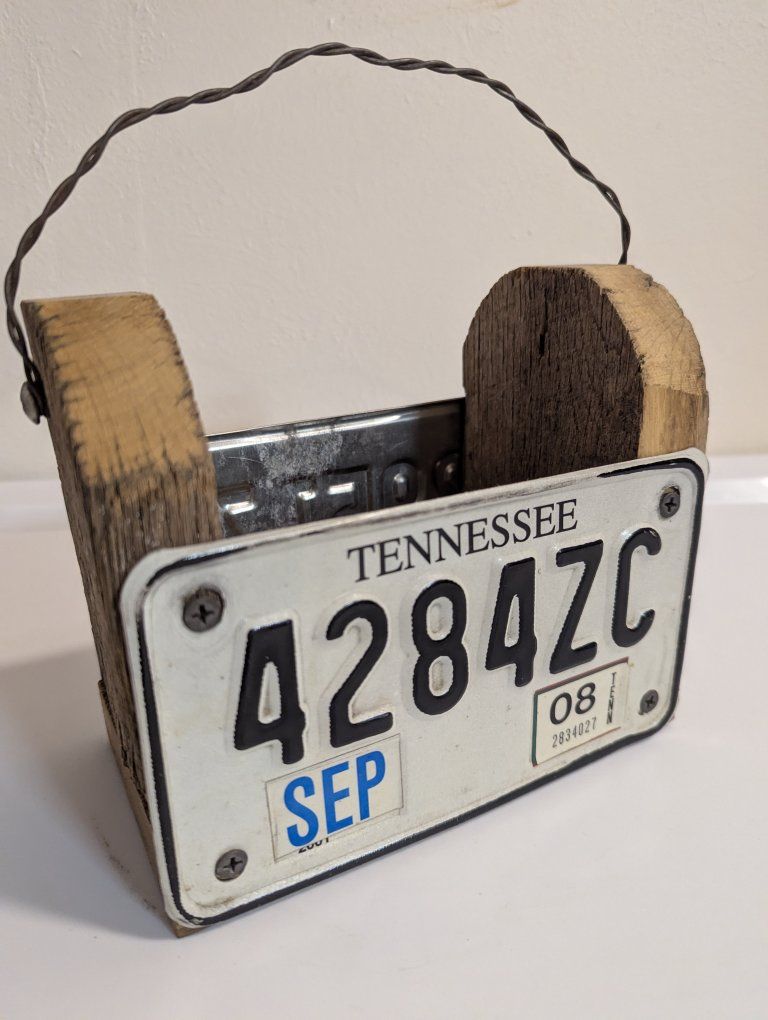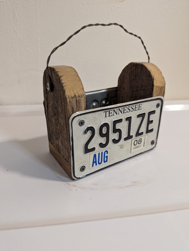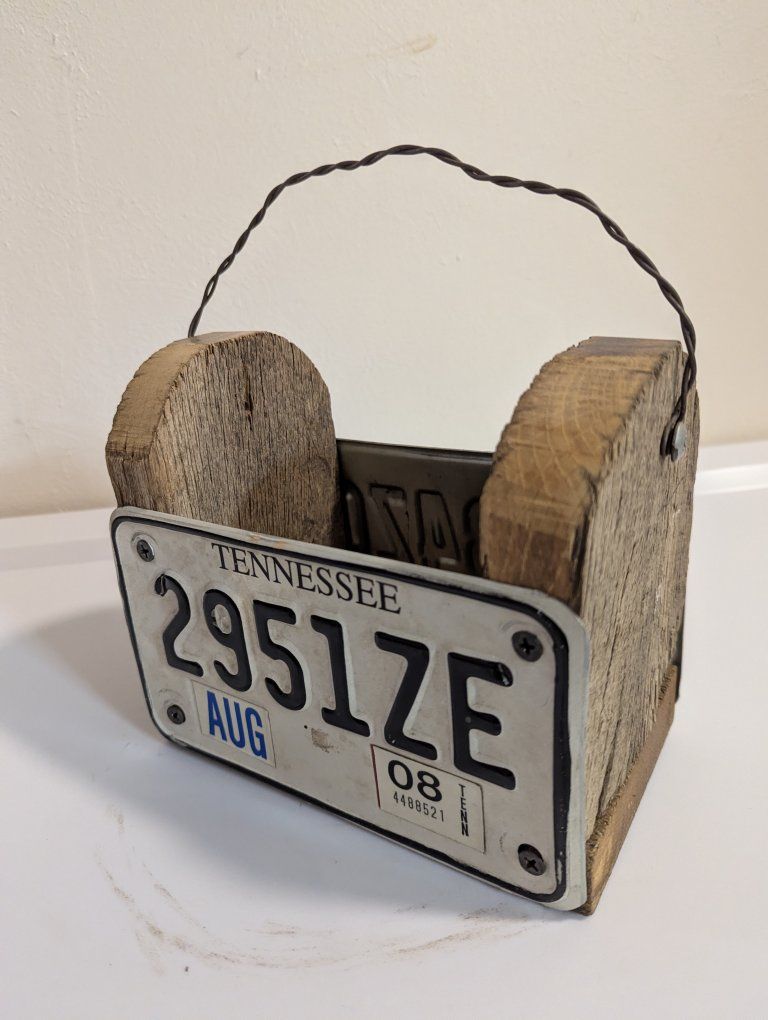 Venmomeasures 7 x 6.5" and 4.25 deep real motorcycle license plates? on both sides. old barn wood wire handle could make a cute planter