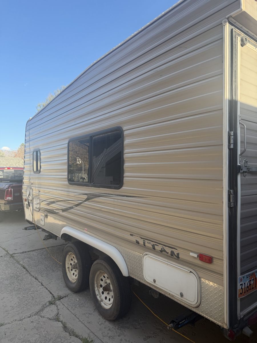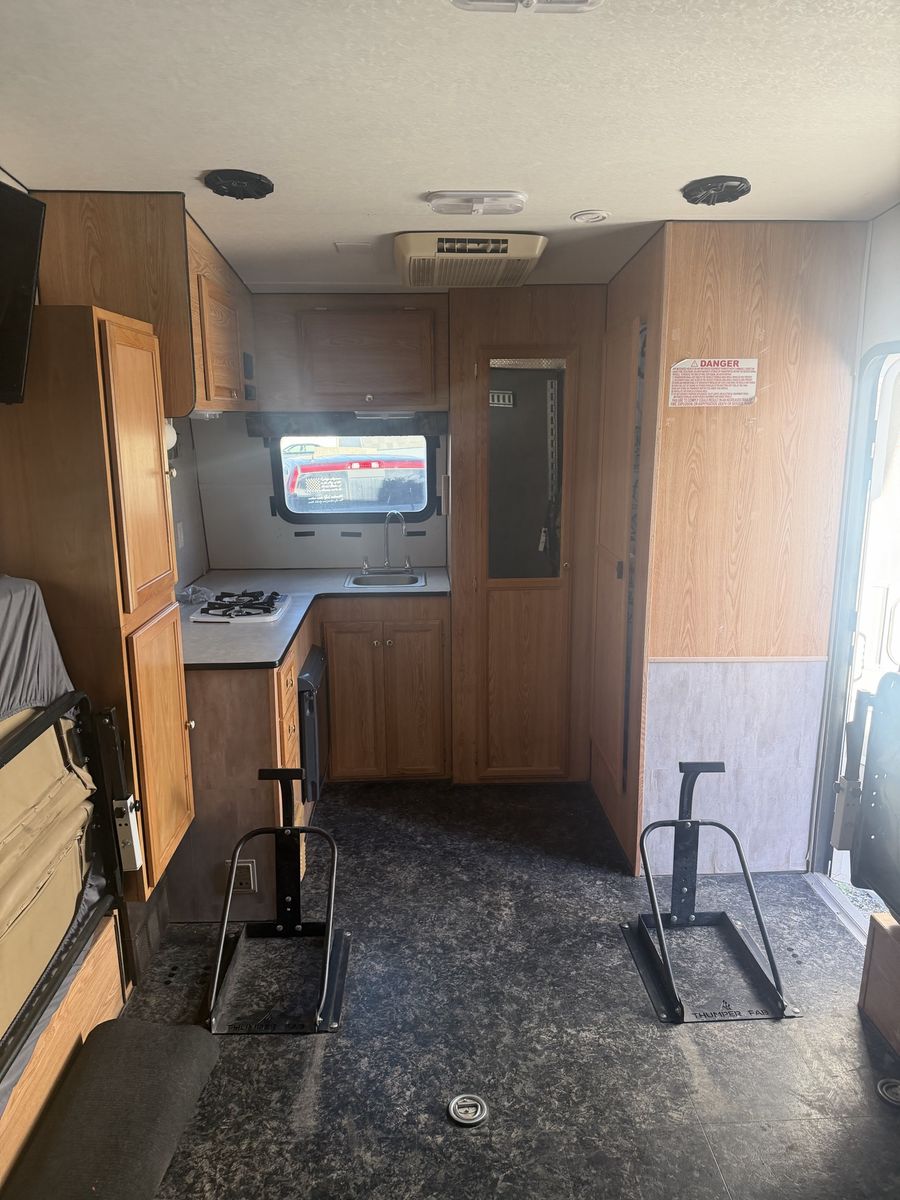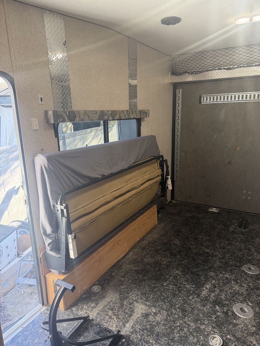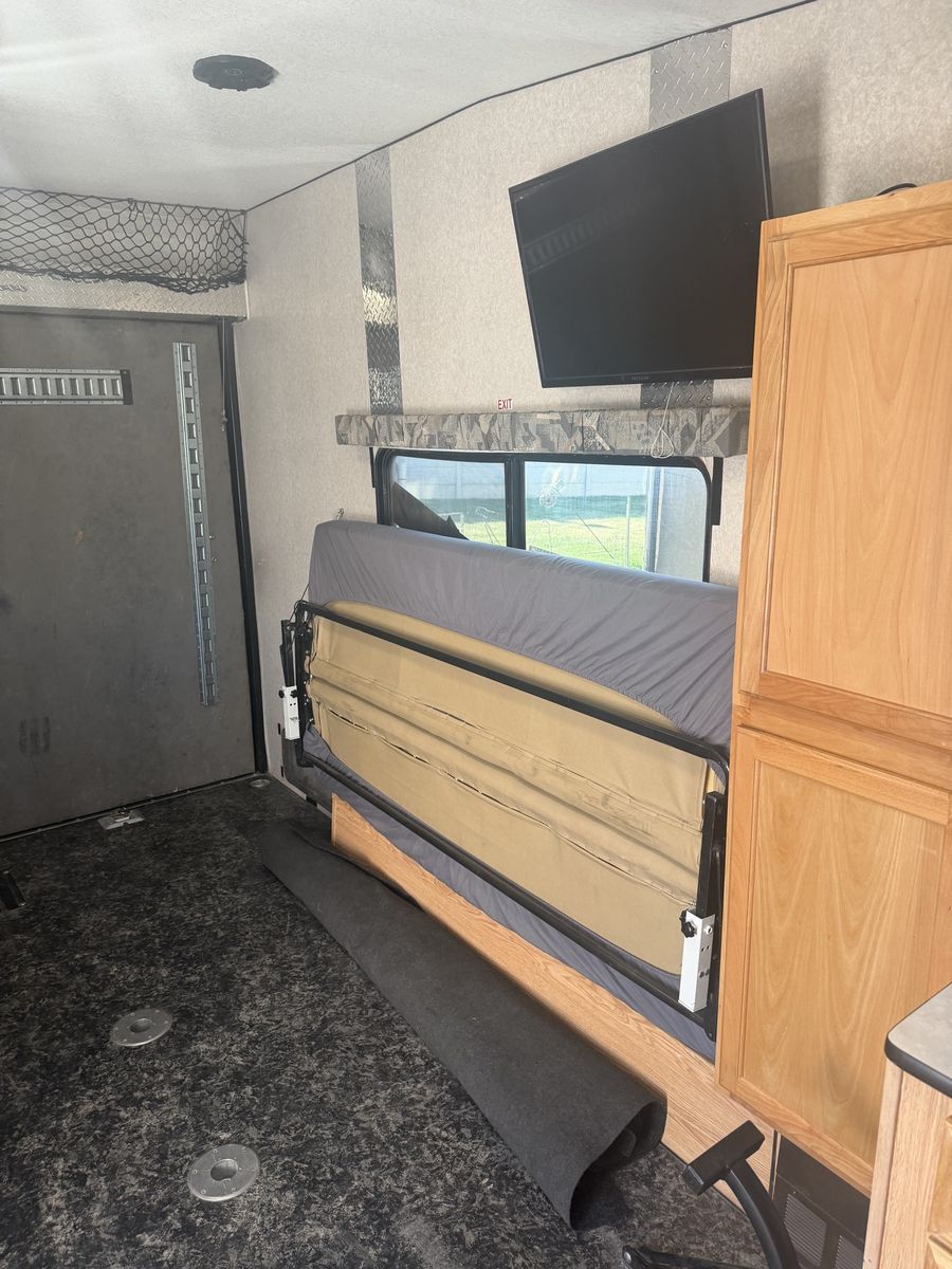 Smaller toy hauler will for a 2 seat zforce950 sxs smaller trailer in great shape has been upgraded with a lithium battery, solar 440 watts a thumper fab sxs toe down system makes securing a sxs very easy axles have been flipped and 9k jacks installed on all 4 corners makes leveling quick and easy we have had the trailer for about 6 years never had any issues family has just outgrown