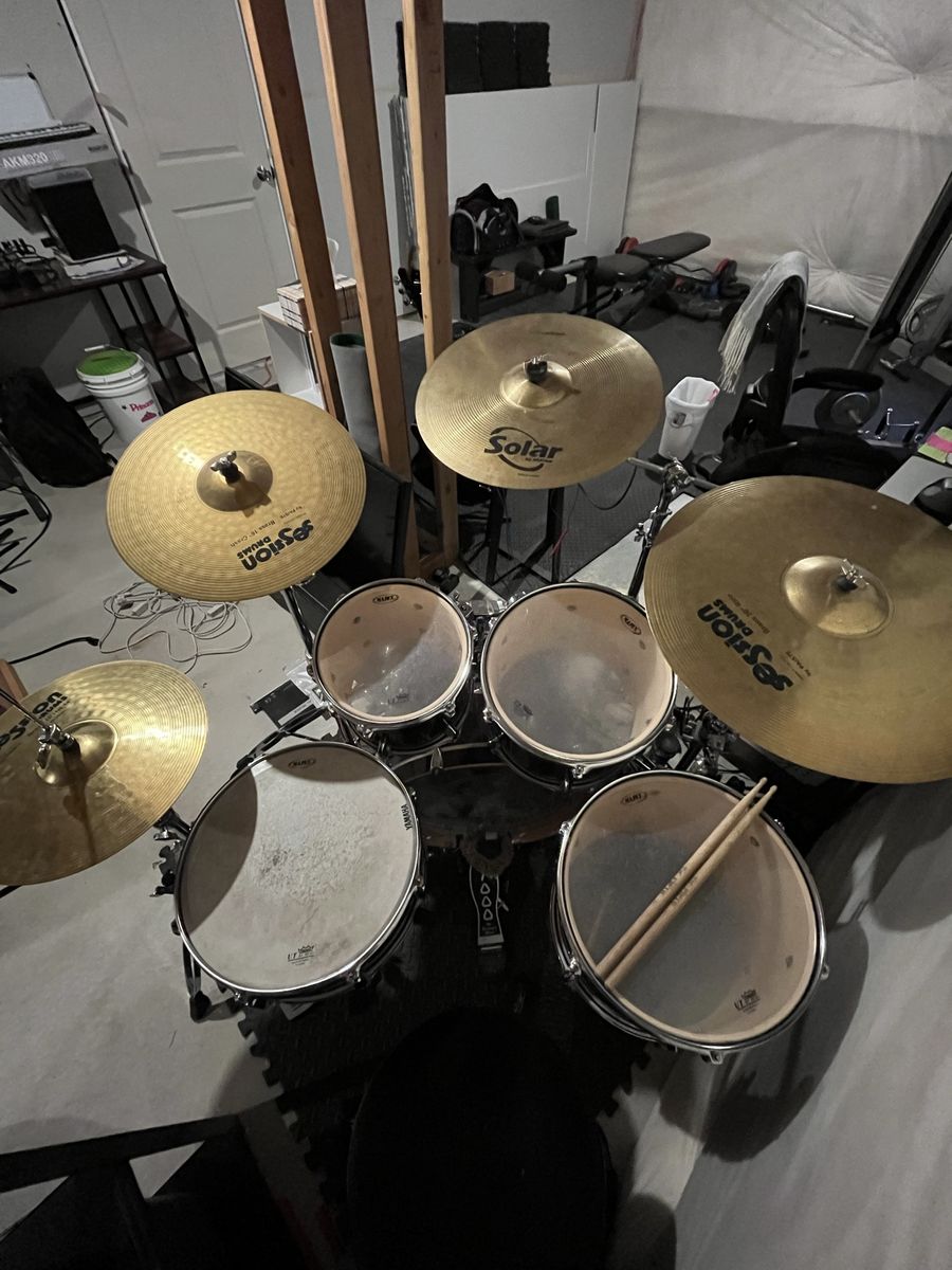 -14” Session by Paiste hi hat, top and bottom with Mapex stand -16” session by Paiste crash with Mapex stand -16” Solar by Sabian crash with Dixon boom stand -20” session by Paiste ride with Mapex boom stand -14” snare with stand -10” tom -12” tom -14” floating tom -20” bass drum -dw7000 bass pedal -7 sticks(lost one) -stick bag -Vic Firth drum headphones (not in great condition but still work\