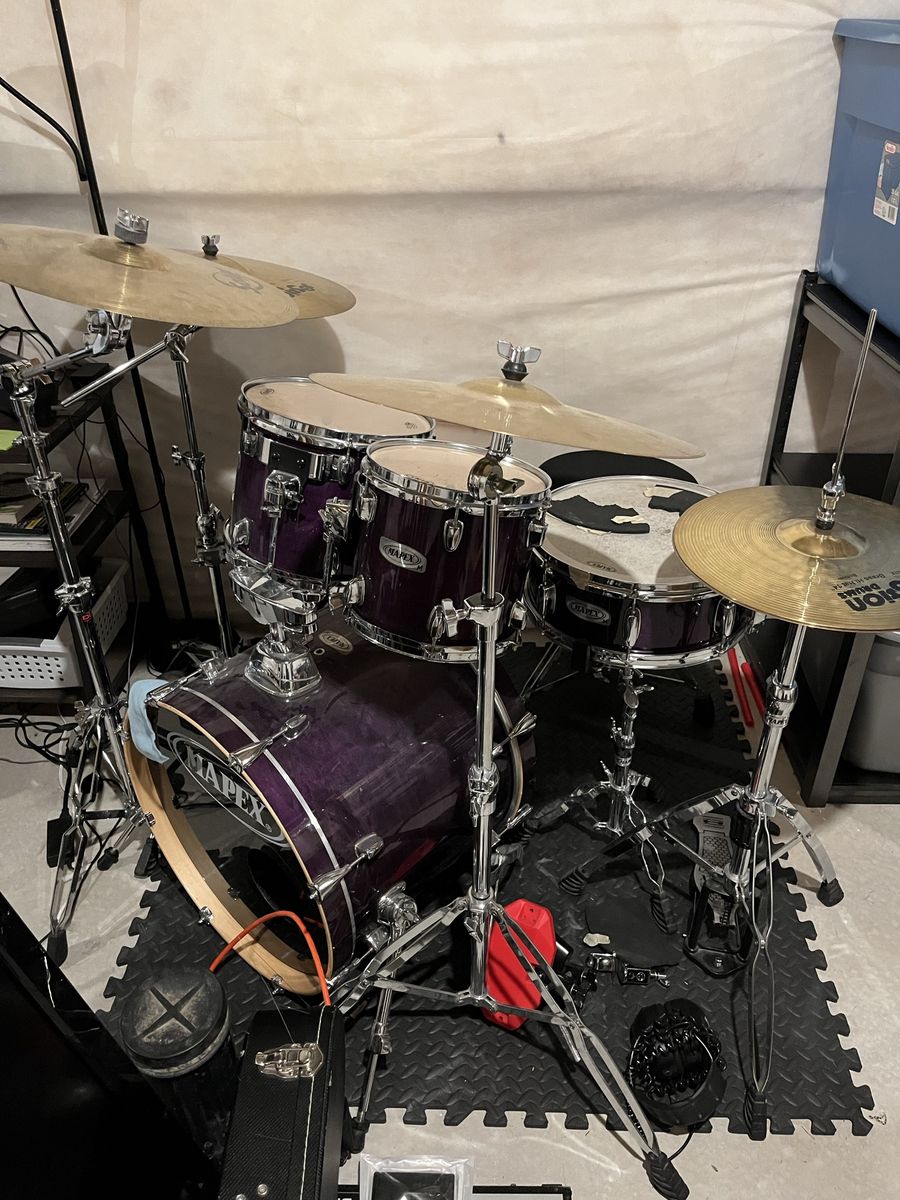 VenmoDeep purple Mapex drum set cymbals and hardware included. Ready to play. Drum heads are old so they may need to be replaced. Little dusty but otherwise in great condition! Here is what is included: