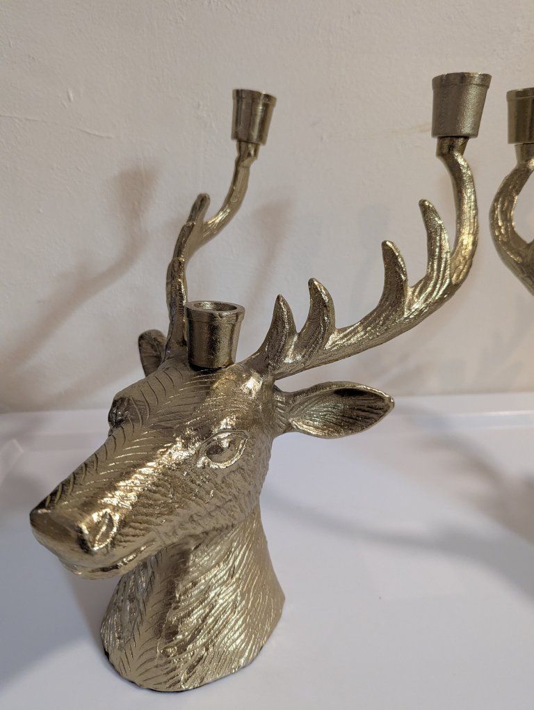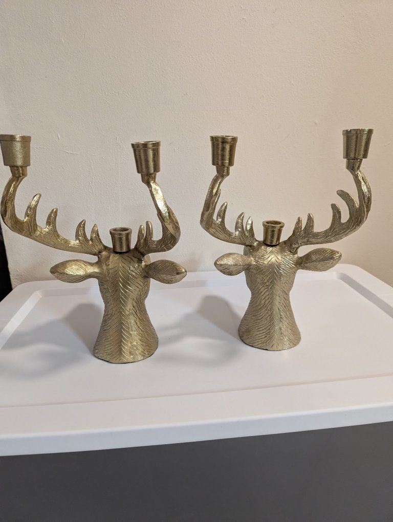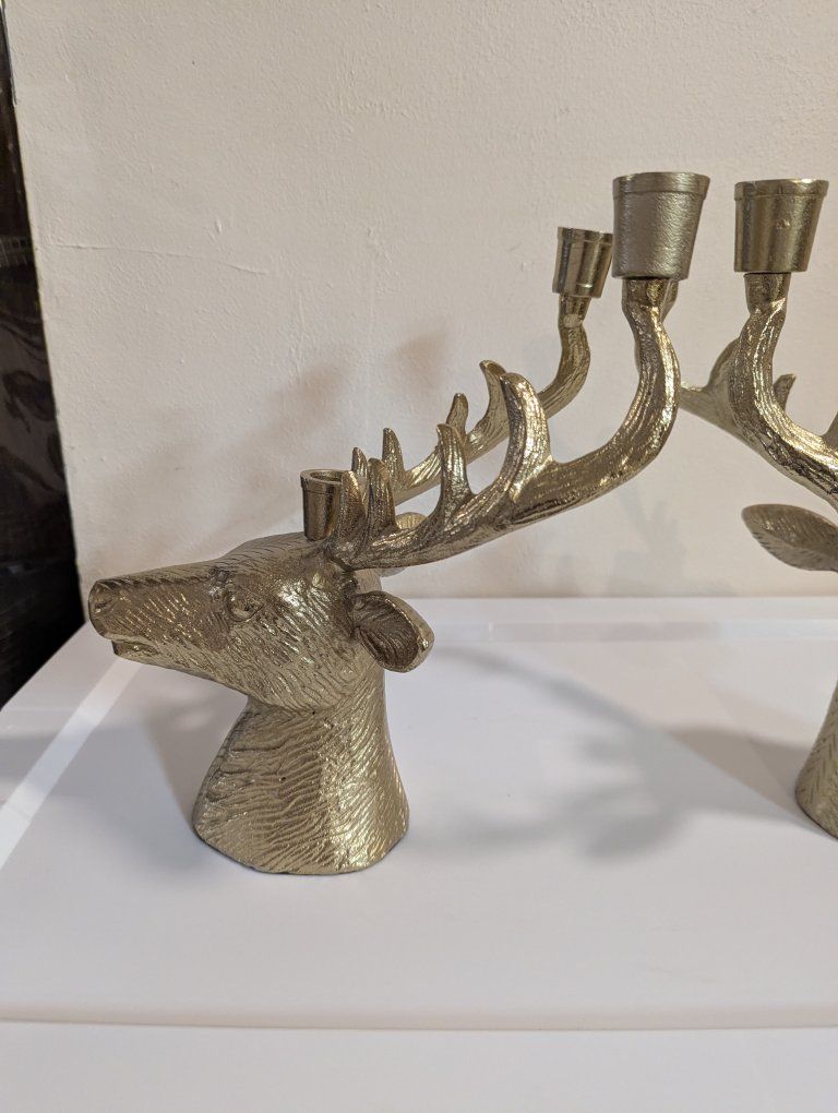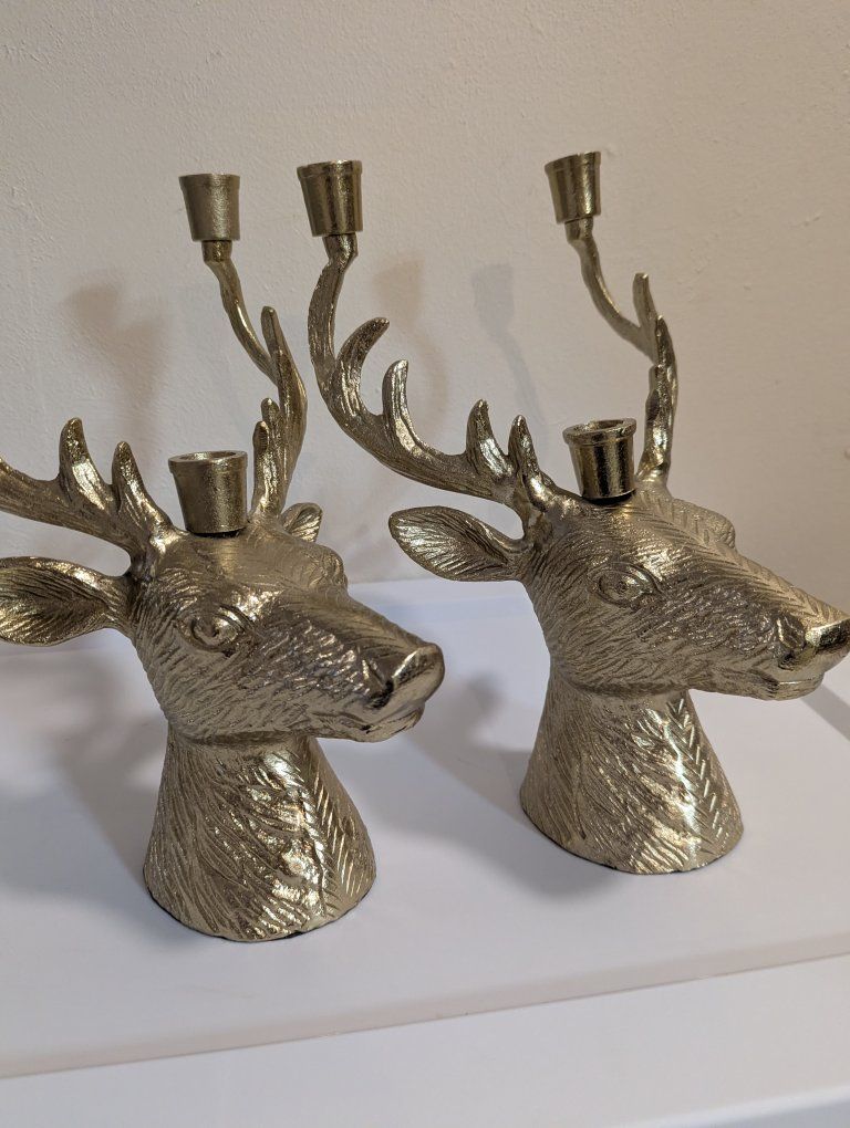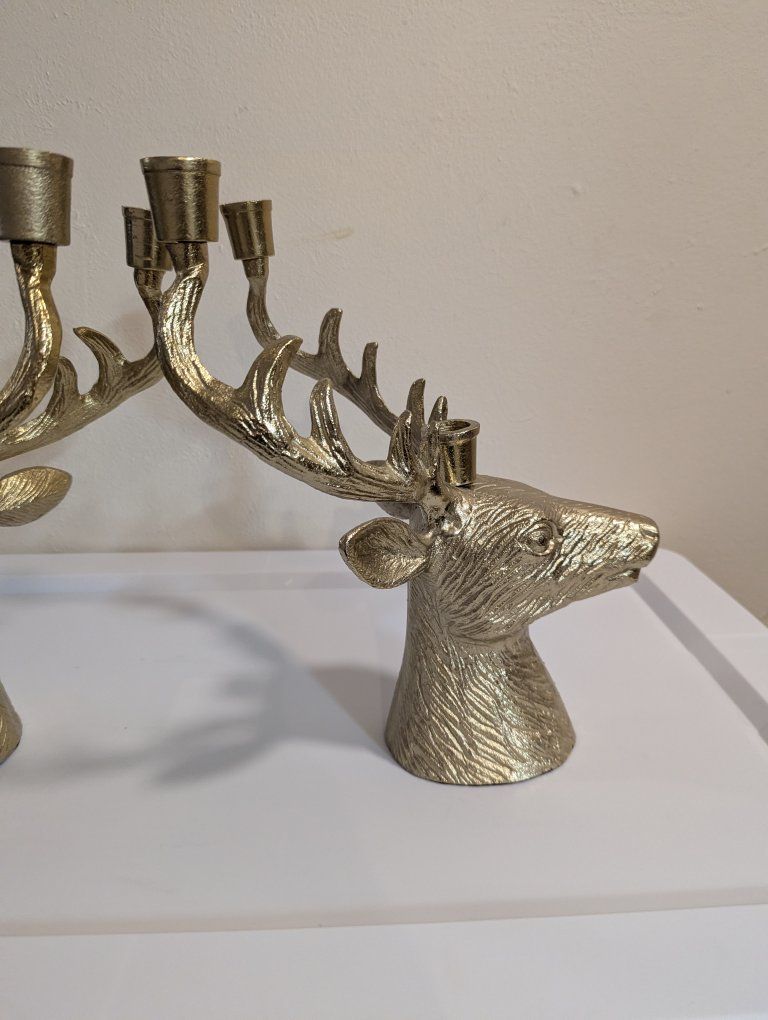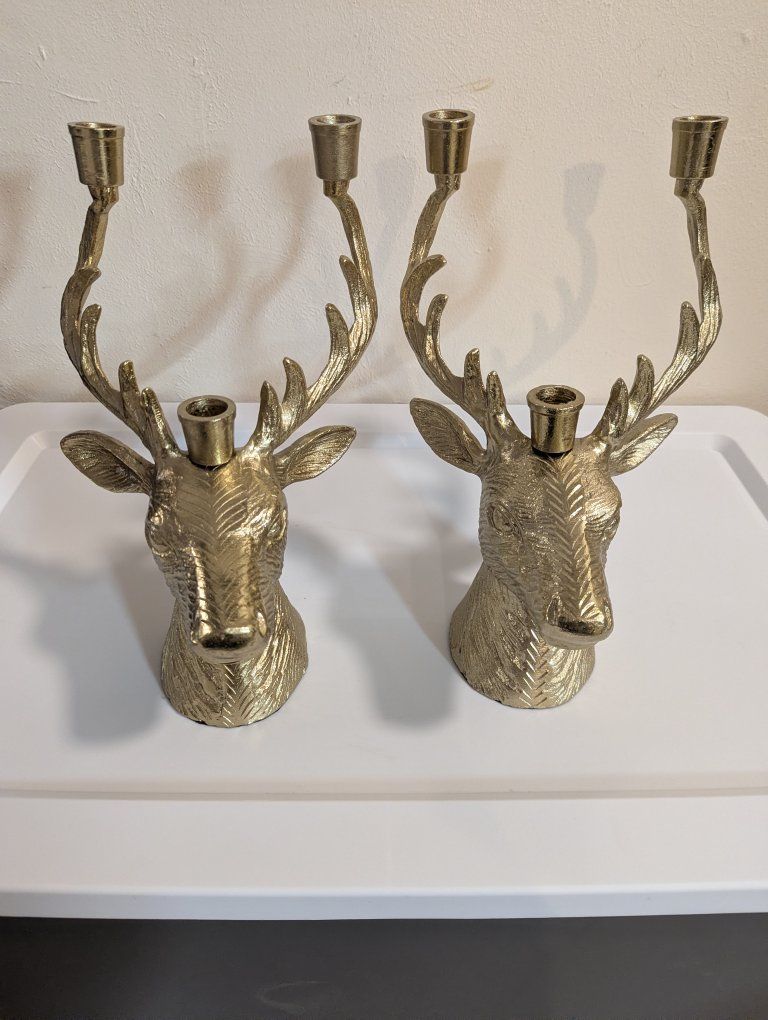 Venmothese heavy metal brass colored candelabras have room for three candles each. It measures 12 in tall, 8 in across, and 10 in from front to back. sold as a set Great for Christmas or anytime