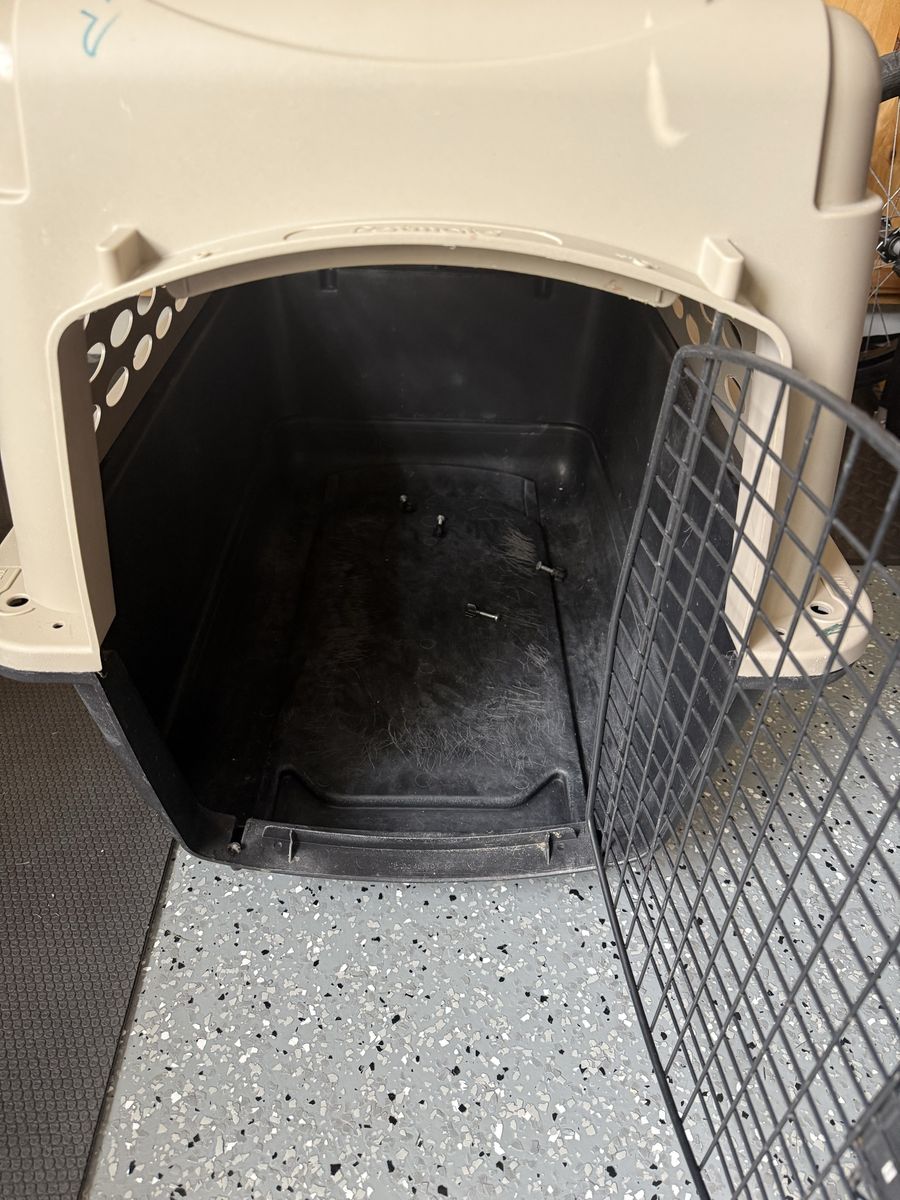 PayPalPetmate medium or large dog crate. It is approximately 30x22x25. It is in pretty good condition. See pictures for more details.