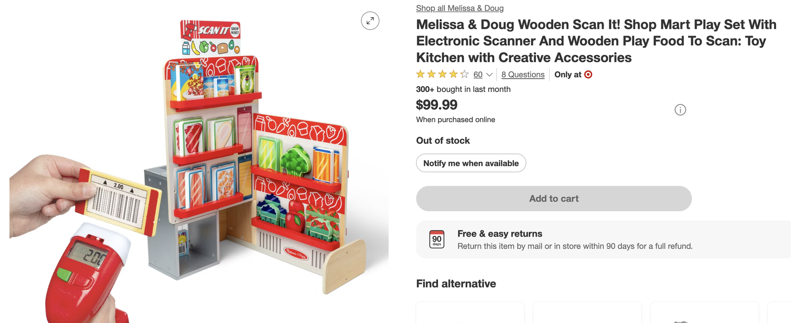 Includes beeping hand-held scanner, 22 wooden chunky grocery items with barcodes to scan, bankcard for making playful purchases, reusable double-sided grocery checklist, and shopping tote