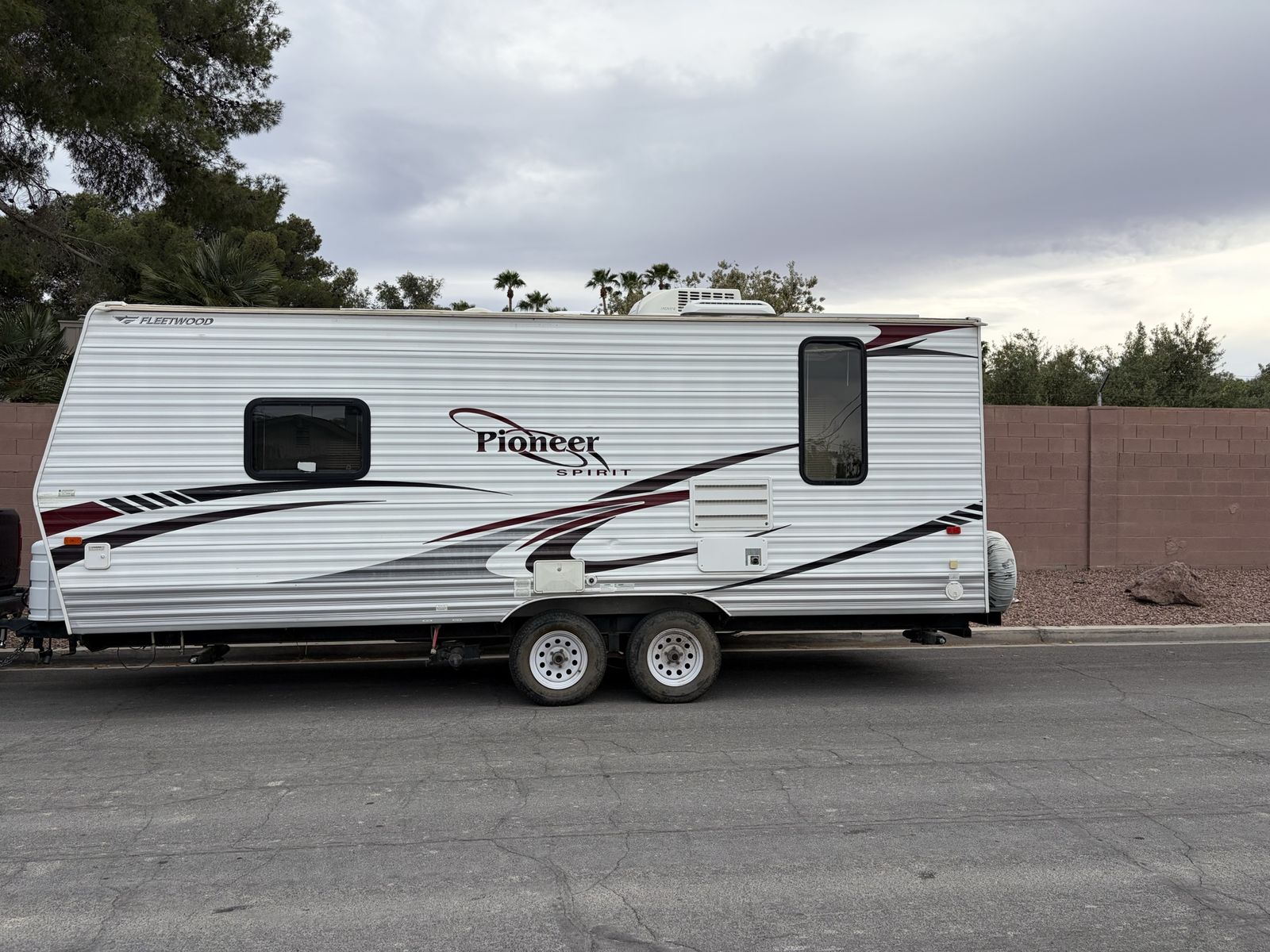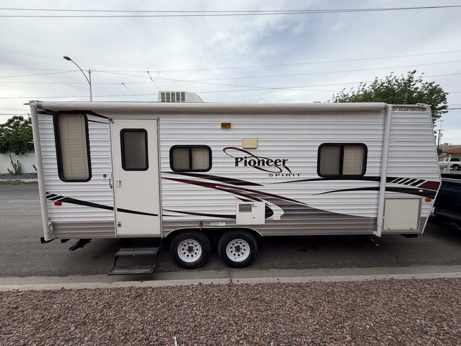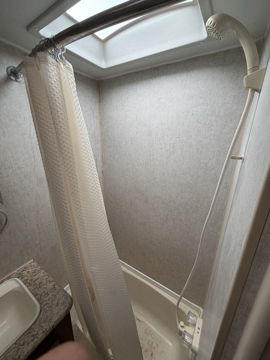 • Dry weight approx. 4,000 lbs • Sleeps 4 (front queen bed + dinette) • Full kitchen (stove, oven, fridge, microwave) • Bathroom with shower and toilet • A/C and heat both working • Electric awning – working • Plenty of storage