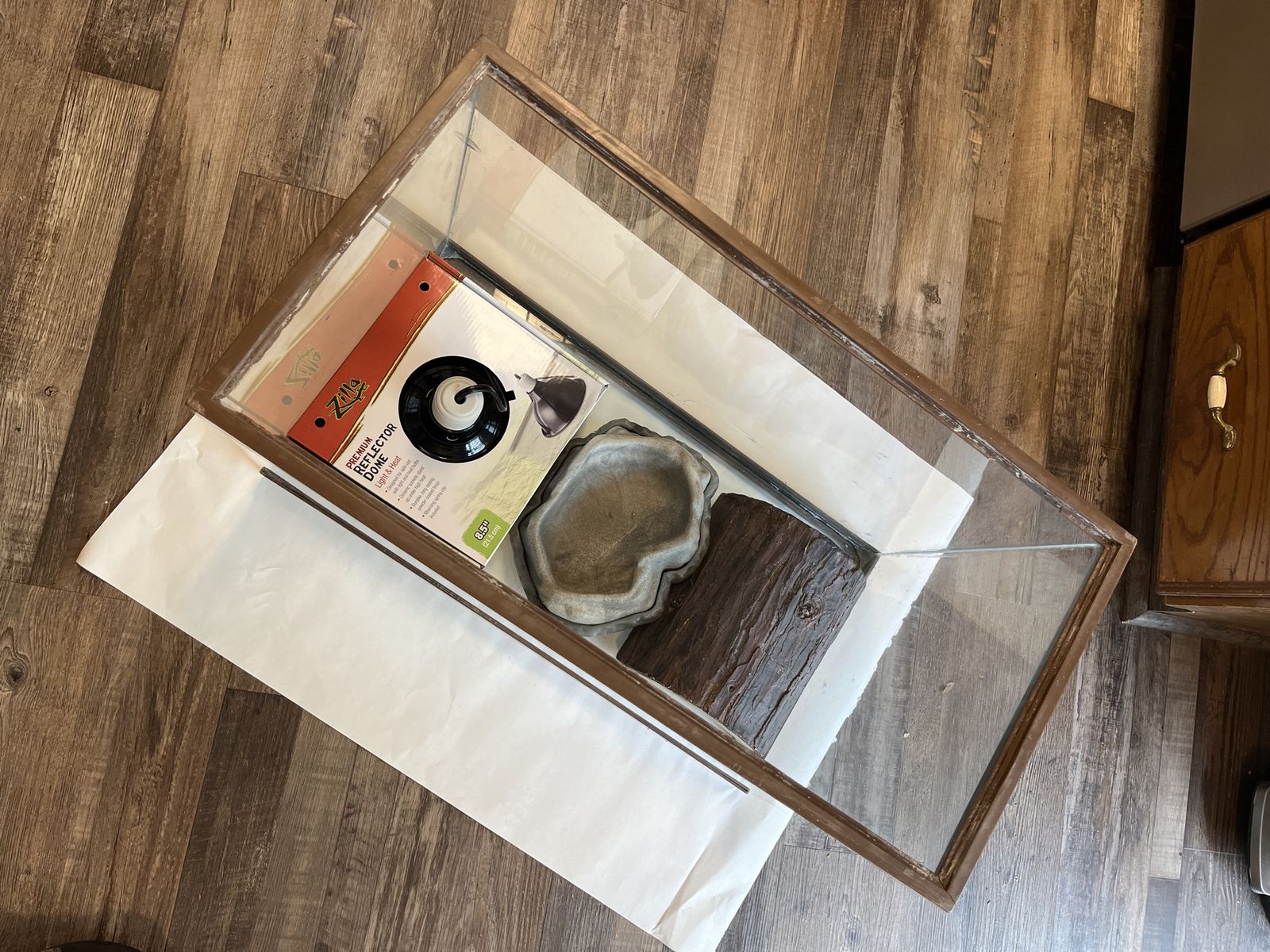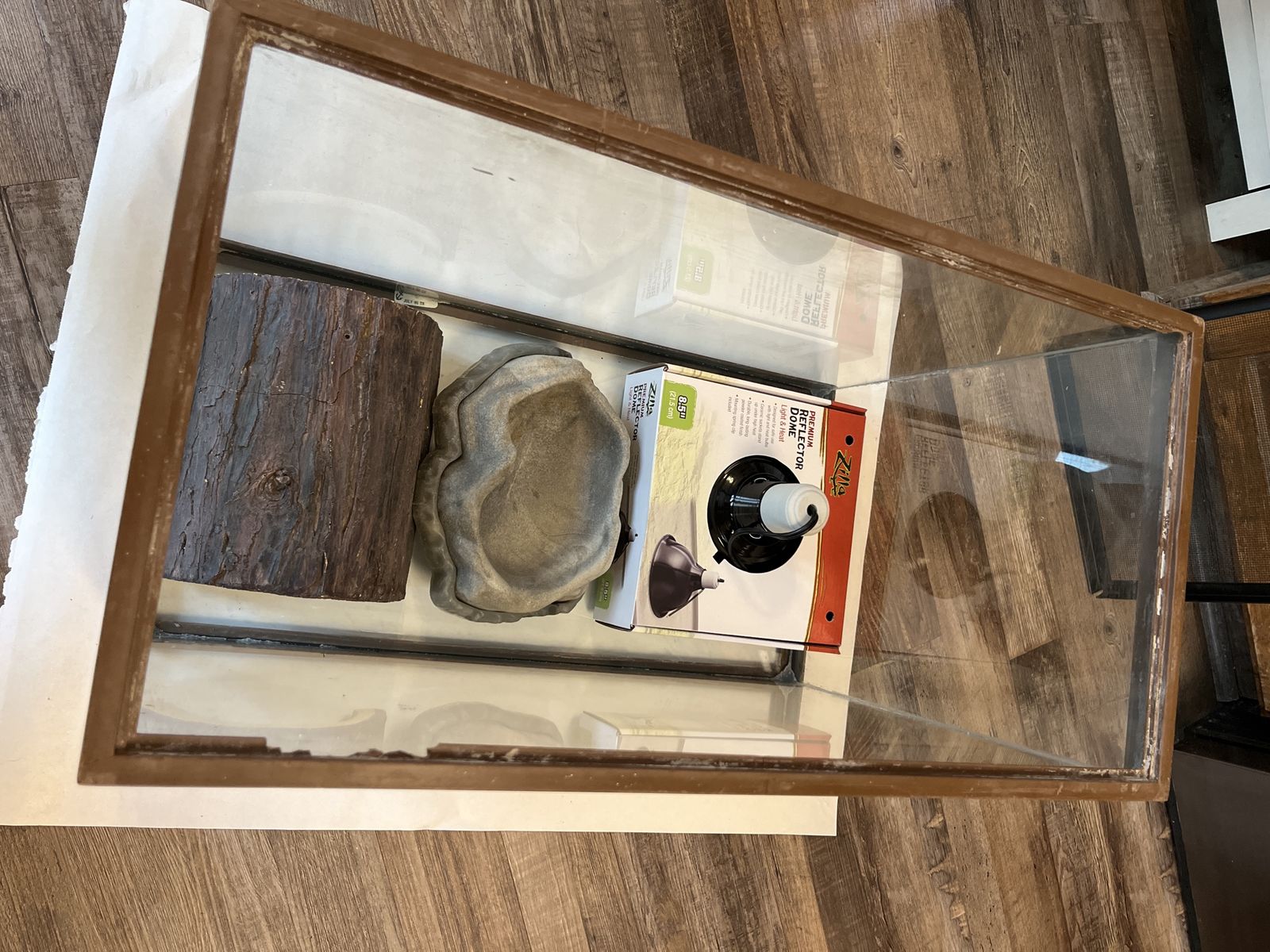 20 gal high reptile set up includes: tank(24”L x 12.5”W x 16.75”H) water bowl, new dome light, log hide and screen lid. Cash. Don 801 247-7091