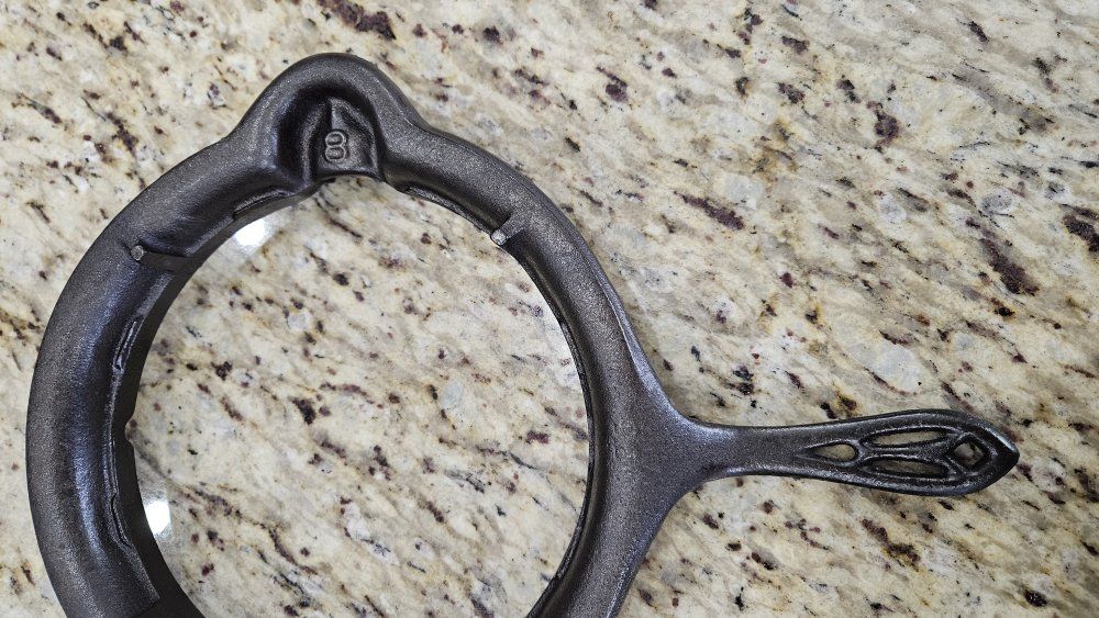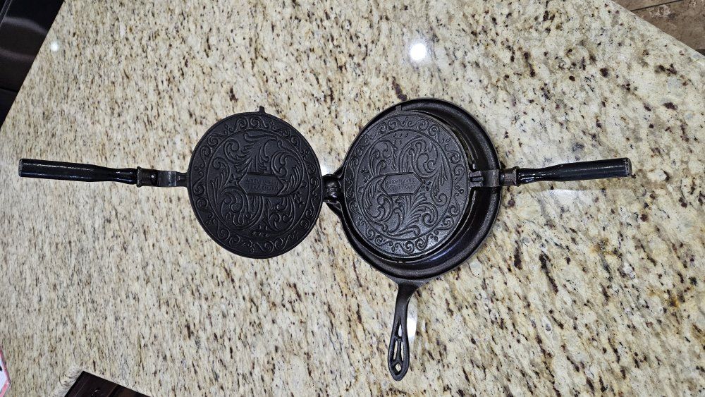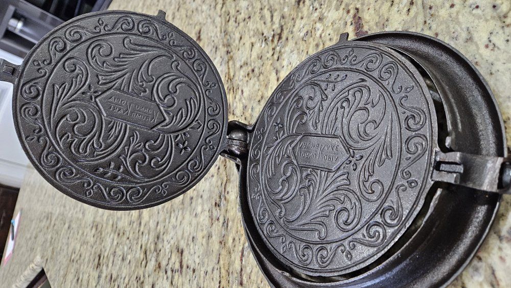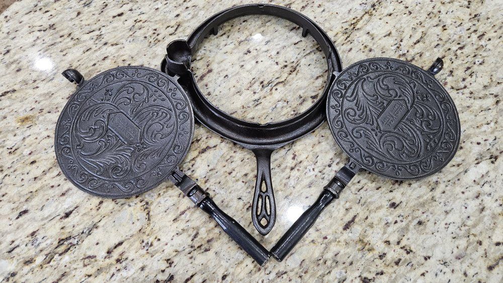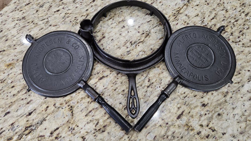 Stripped via electrolysis. Seasoned 3 times with grapeseed/canola oil blend. Paddles sit perfectly flat. Very crisp patterns. Matching 975 base and original wood handles. Handles are loose due to wood shrinkage, but I secured them with a small nail. Base has a tiny tick on glass when lifted on handle.. 1 sheet of printer paper.