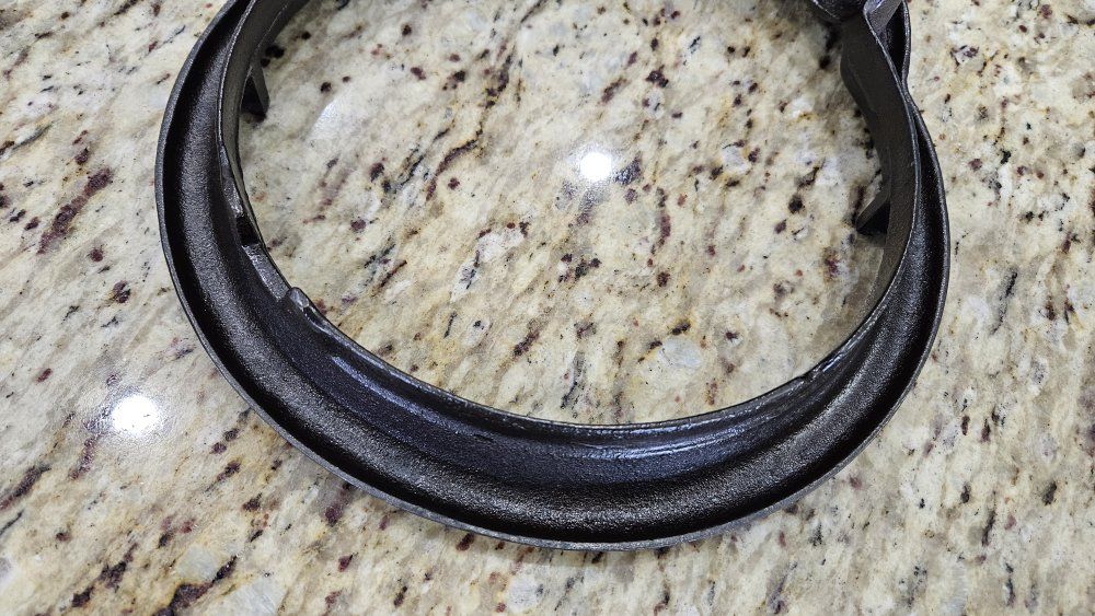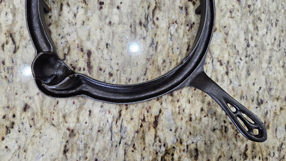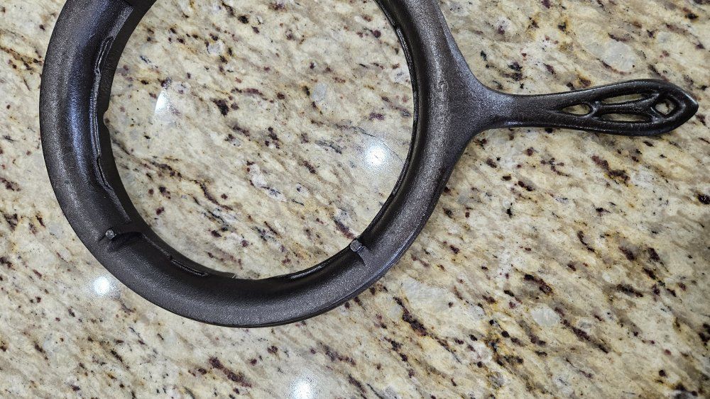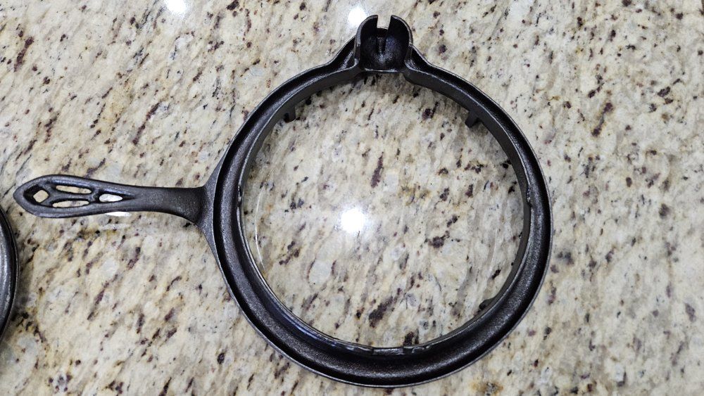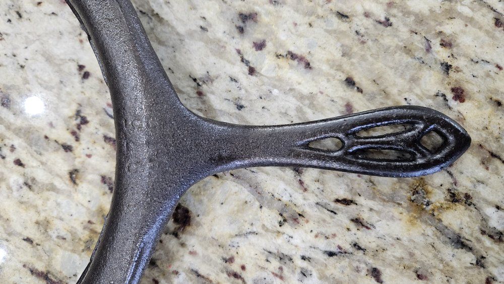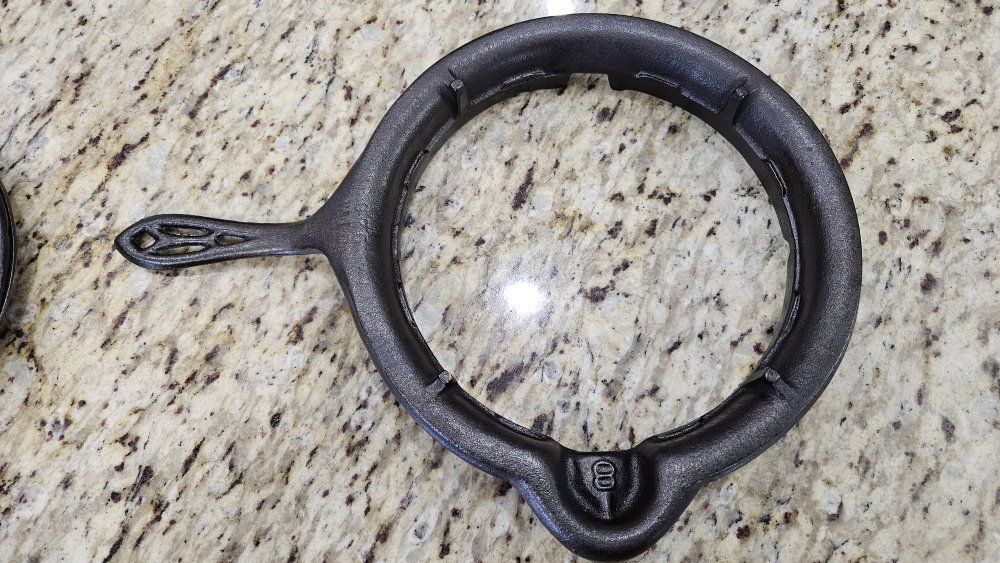 Stripped via electrolysis. Seasoned 3 times with grapeseed/canola oil blend. Paddles sit perfectly flat. Very crisp patterns. Matching 975 base and original wood handles. Handles are loose due to wood shrinkage, but I secured them with a small nail. Base has a tiny tick on glass when lifted on handle.. 1 sheet of printer paper.