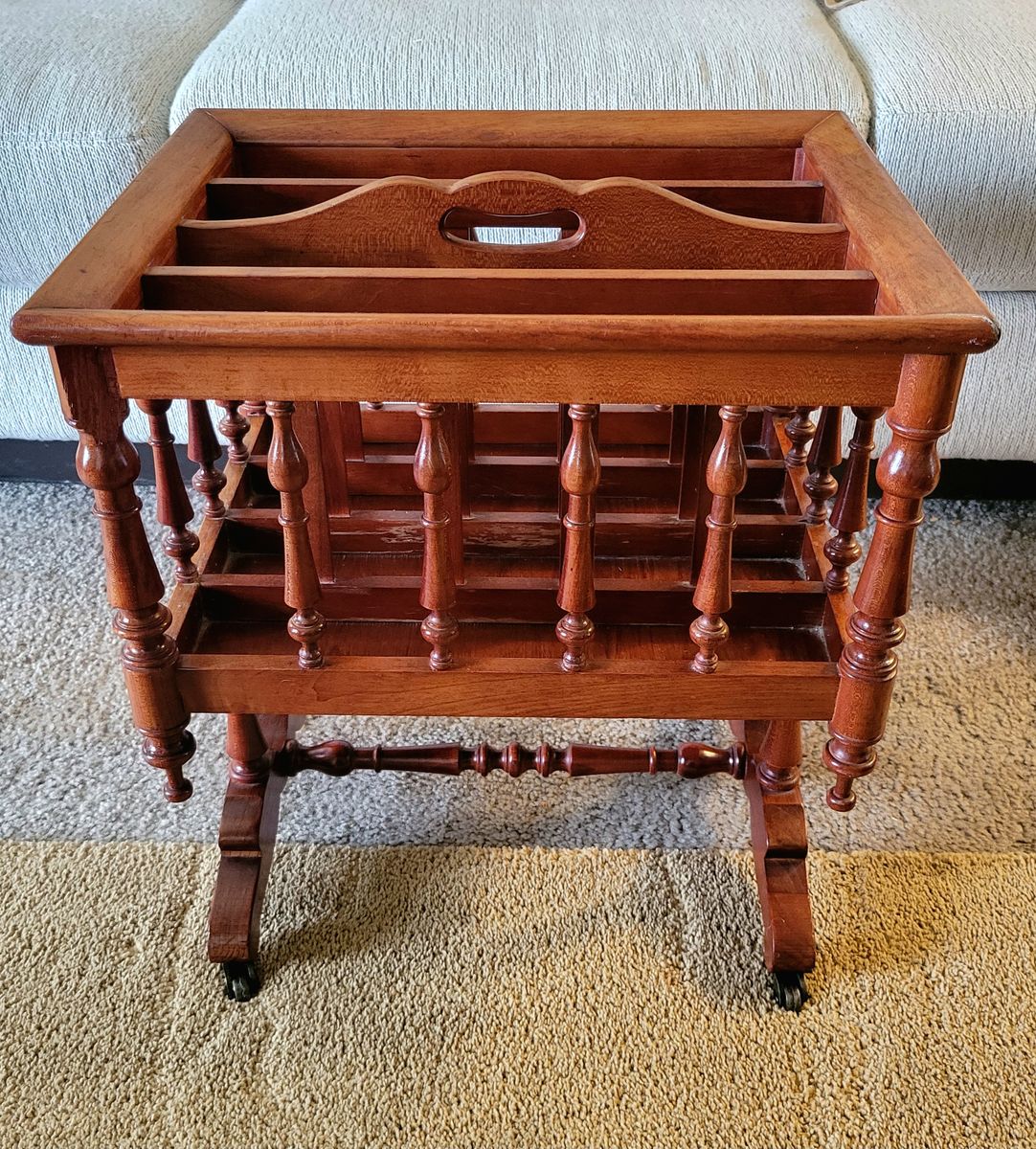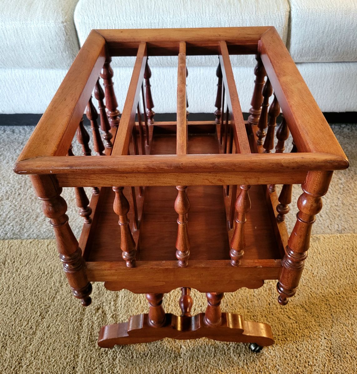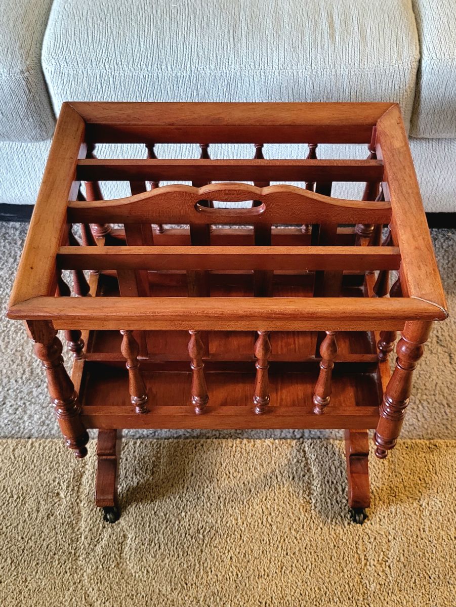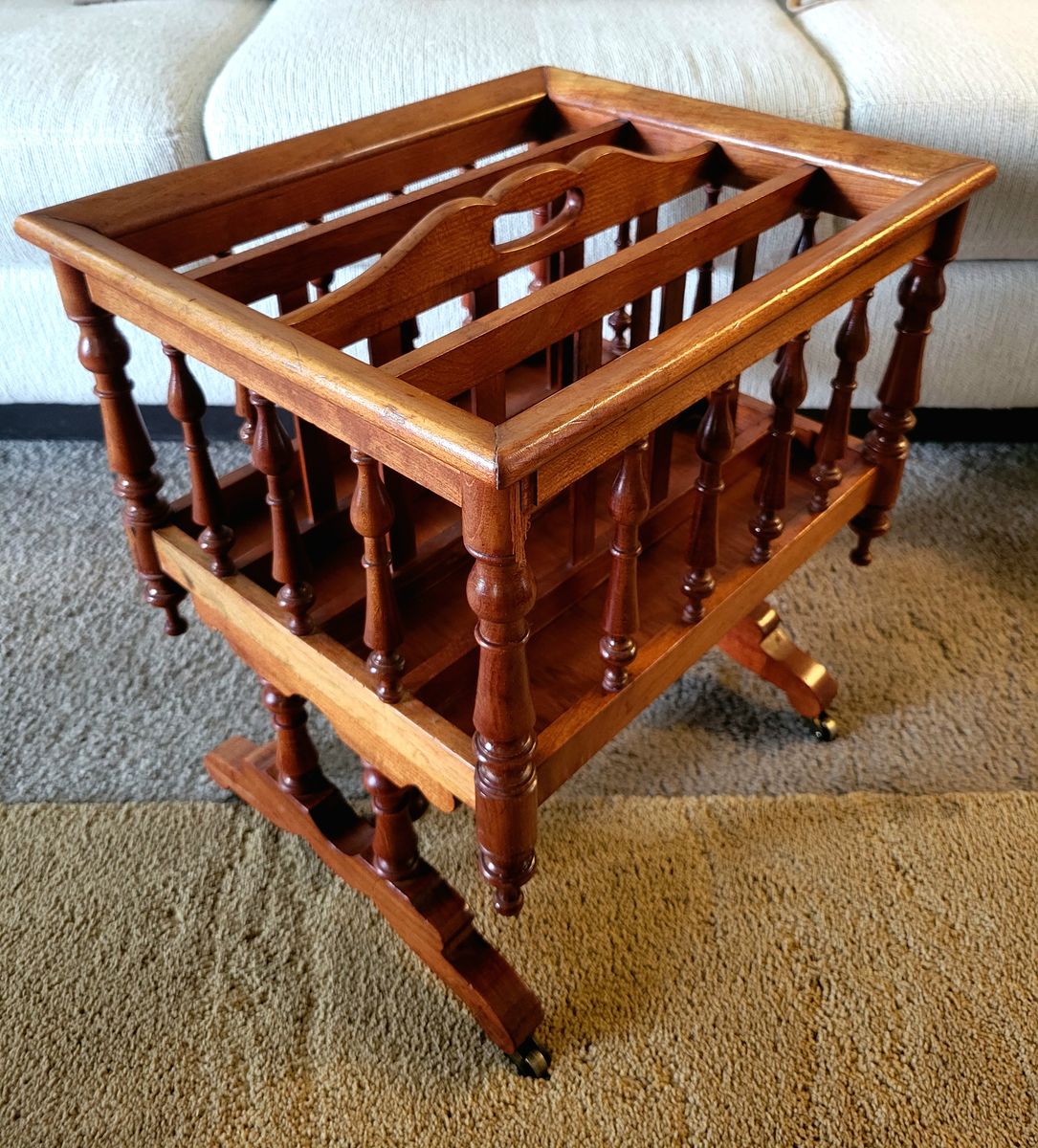 Vintage Judy Canterbury Solid Cherry Wood Magazine Rack on brass rolling castors, circa 1940s.