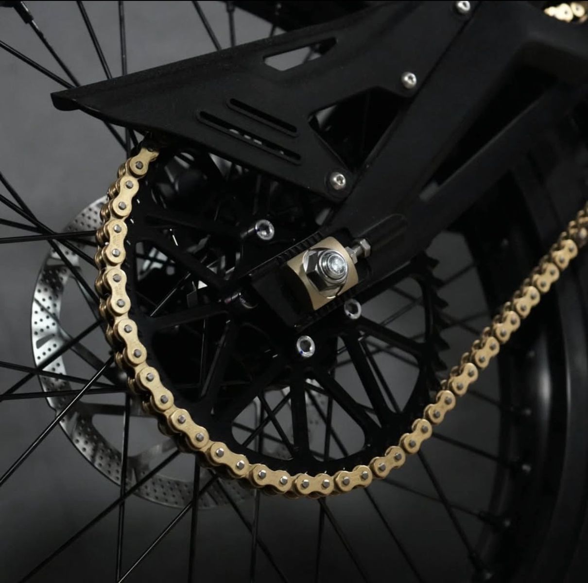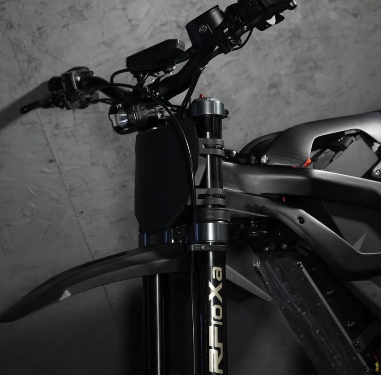 Motor: 28,000W high-torque brushless Top speed: 81 mph Range: up to 71 miles Battery: 72V 50Ah Lithium LG Charging: 84V 9Ah silent charger (110V US plug) Brakes: Titanium gold four-piston hydraulic system Torque: 287 ft-lb Security: password protection + locking fork Modes: 5 customizable speed settings Recharge time: 4 hours Suspension: RFloXa
