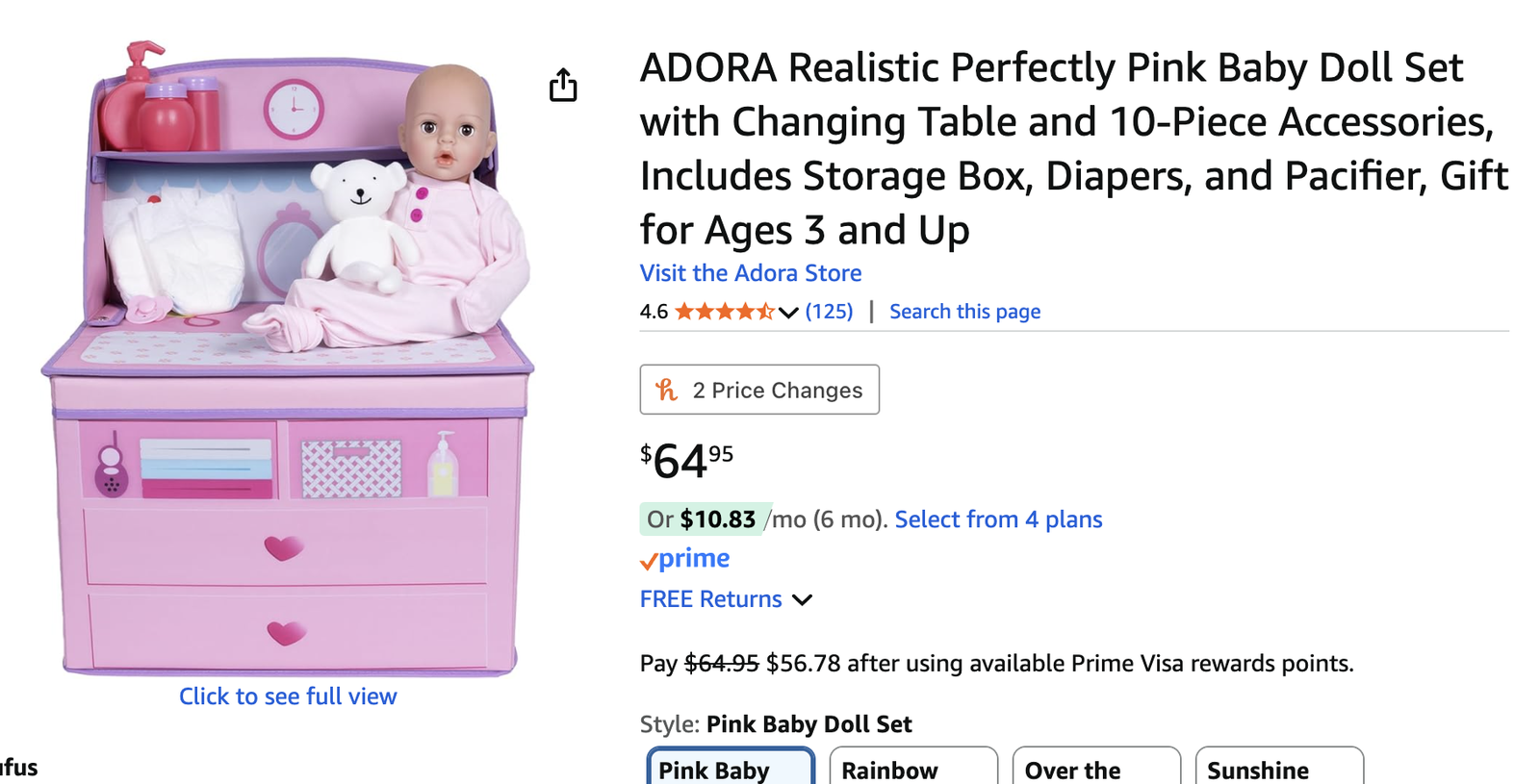 10-PIECE DOLL SET - This Adora Perfectly Pink baby doll set includes one 14" realistic baby doll with open/close eyes, a collapsible pink storage box designed to be a changing table, a pink onesie, a pink pacifier, 2 baby doll diapers, a plush bear, a baby doll lotion bottle, a baby powder bottle, and 1 extra doll bottle.