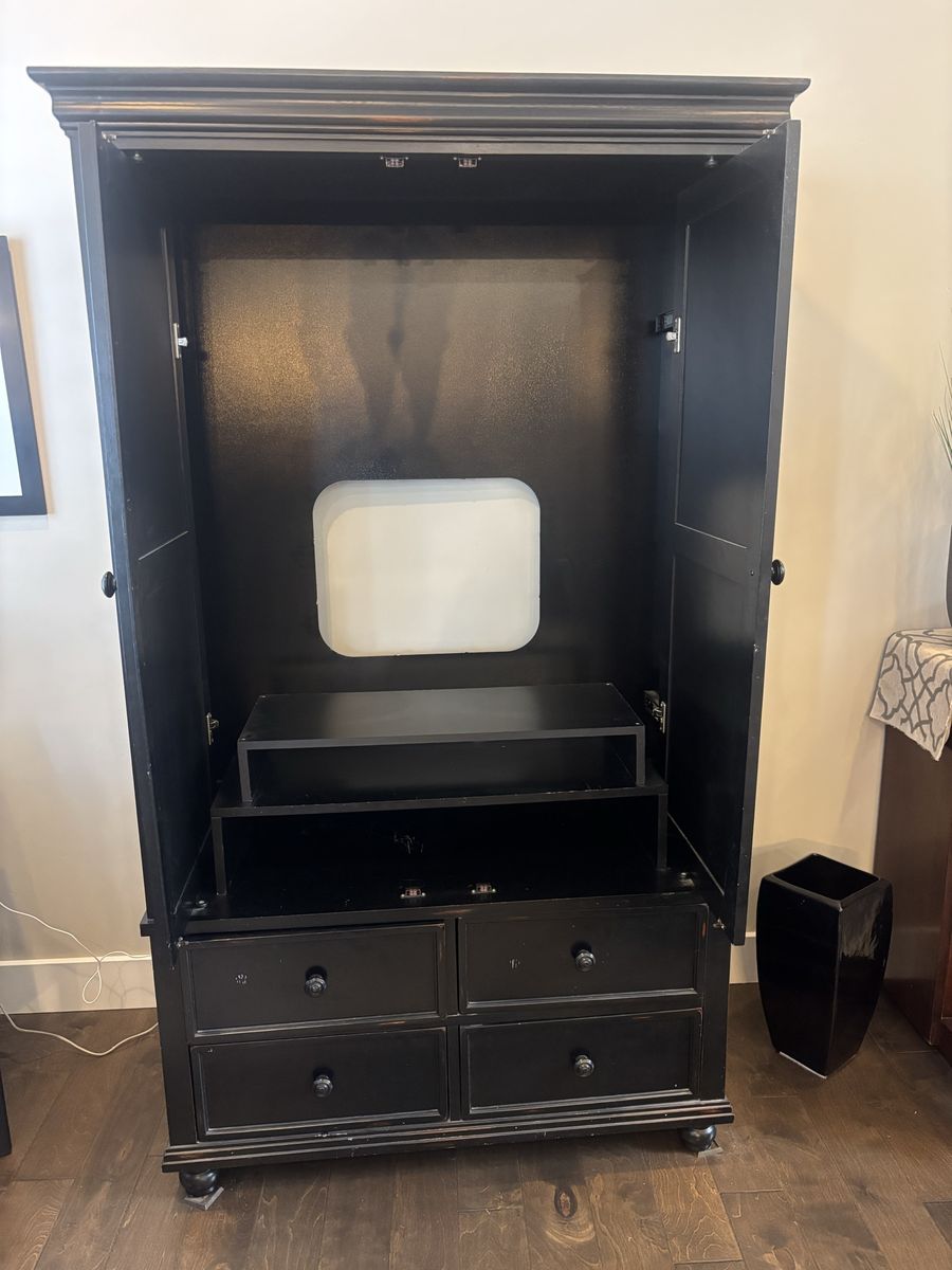 ApplePayBlack armoire roughly 78 H x 43 W. Breaks apart into 2 pieces.