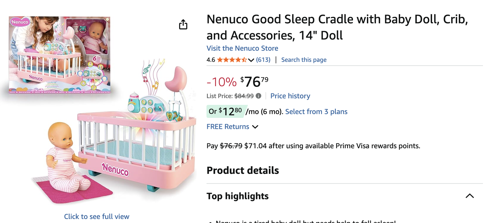 Includes one doll, crib with soothing center, star mobile, bottle, pacifier and blanket.