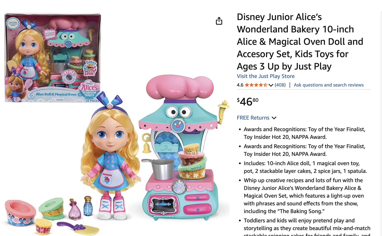 Whip up creative recipes and lots of fun with the Disney Junior Alice’s Wonderland Bakery Alice & Magical Oven Set, which features a light-up oven with phrases and sound effects from the show, including the “The Baking Song.”
