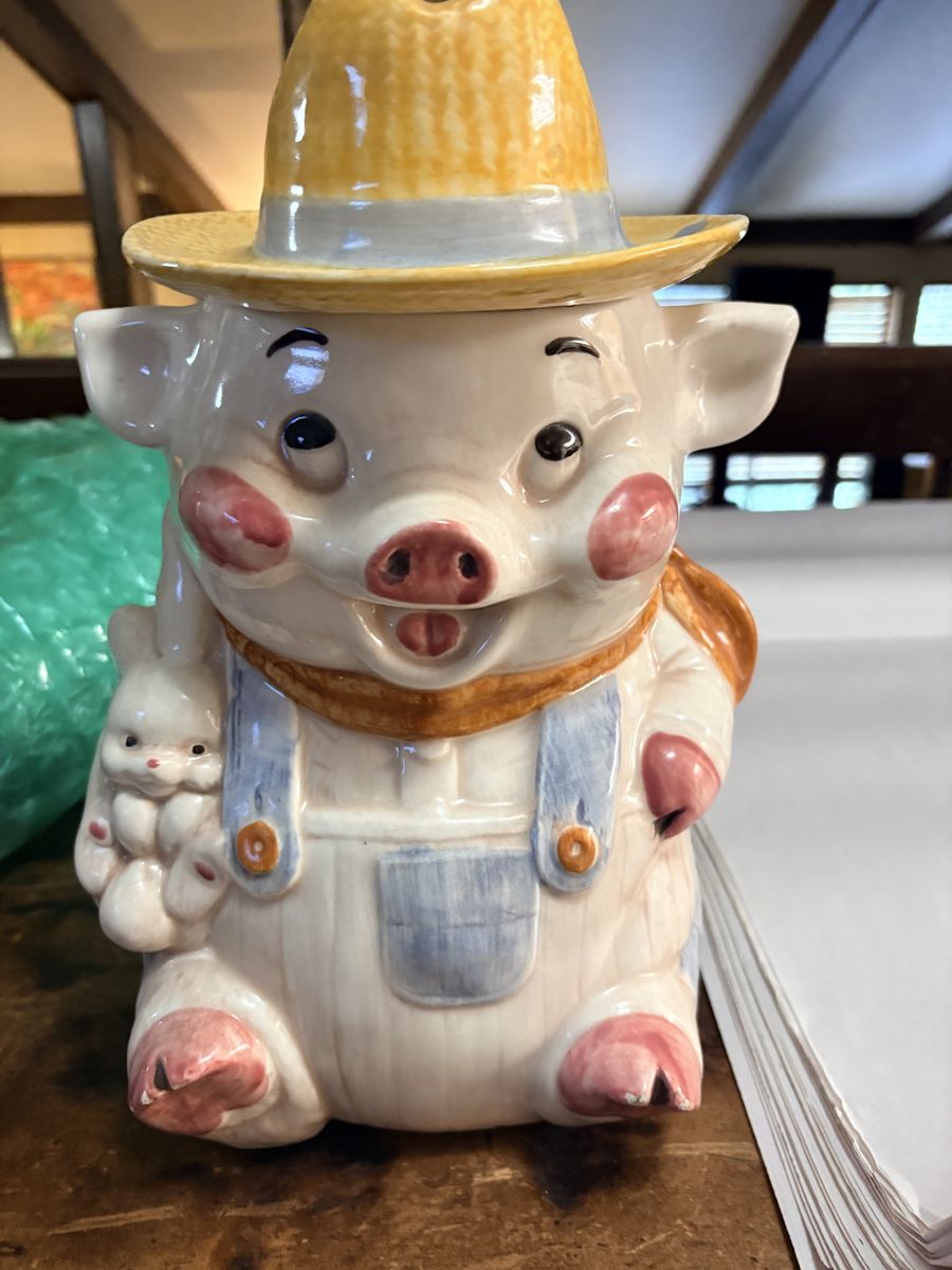 VenmoCeramic Pig cookie jar. small chip on the back of the hat (lid)