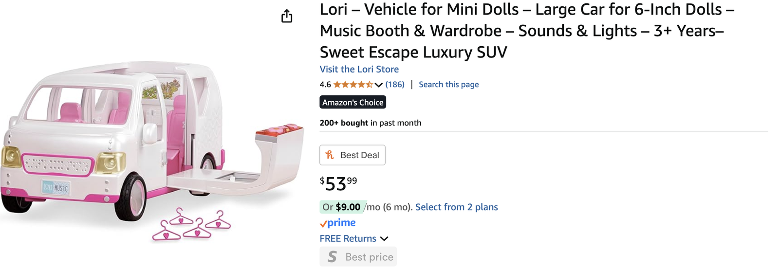 Fits Four: This toy car has seats for 4 of your favorite 6-inch dolls and space their little pets.