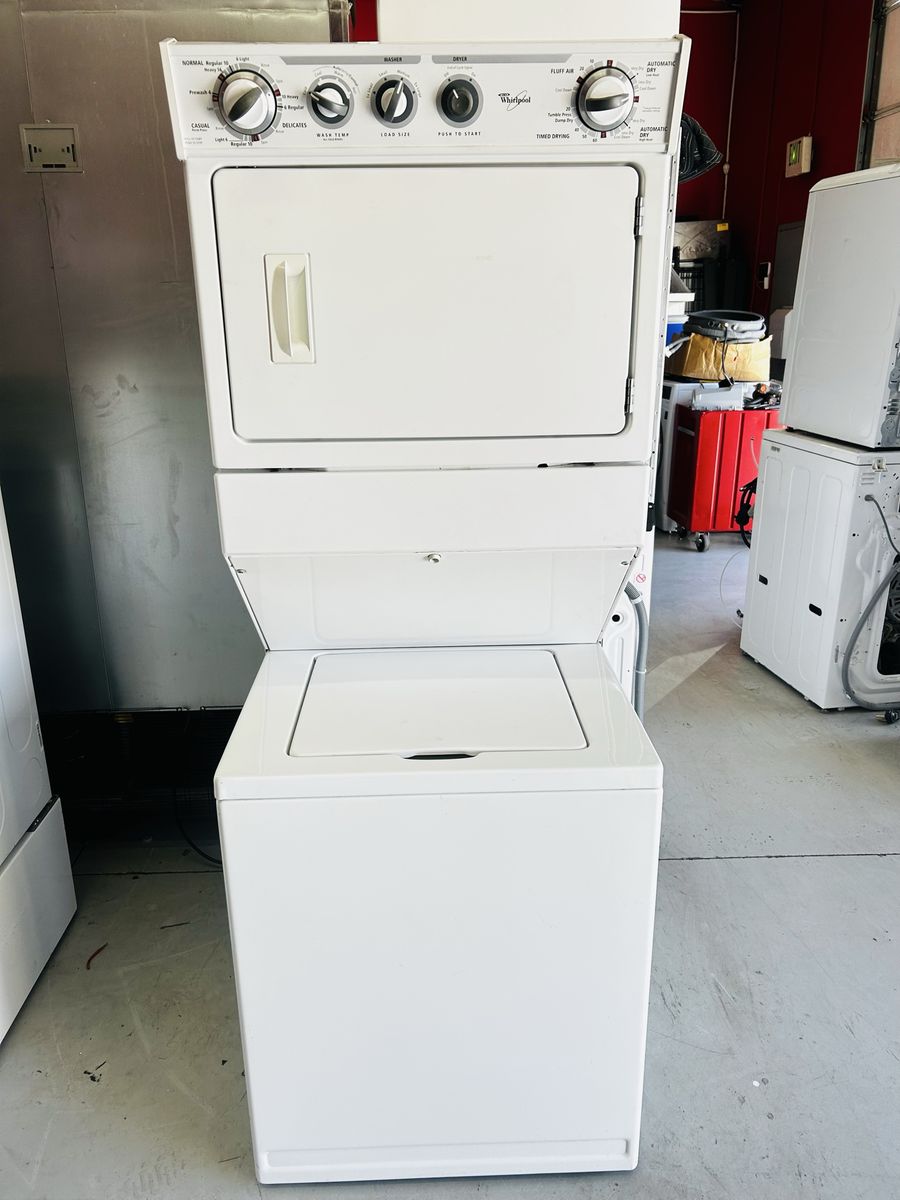 Whirlpool stackable extra large capacity normal casual prewash perm press delicate electric dryer time dry tumble press damp dry fluff air automatic dry etc..It works great, clean, 45 day warranty, delivery/install available.