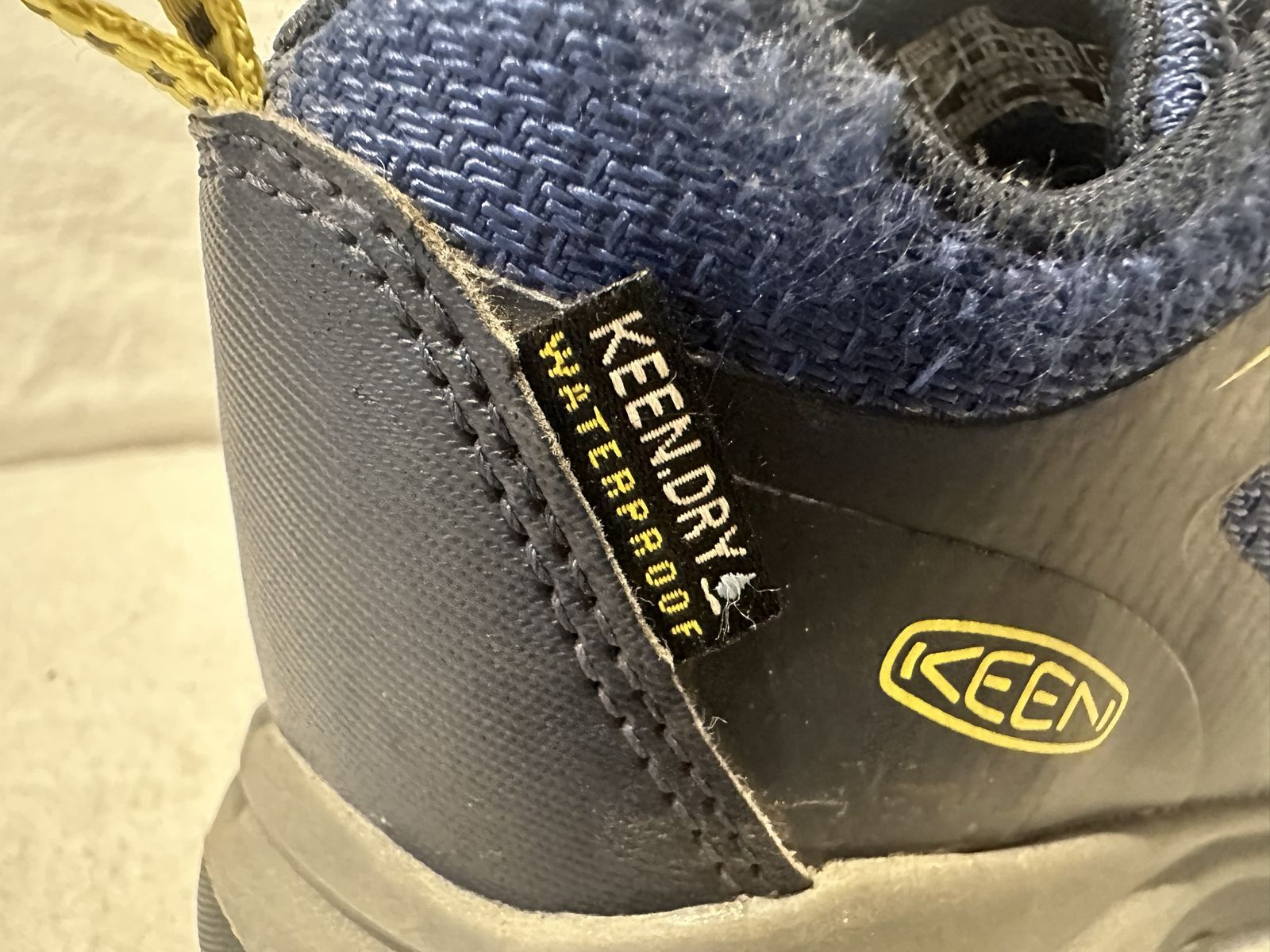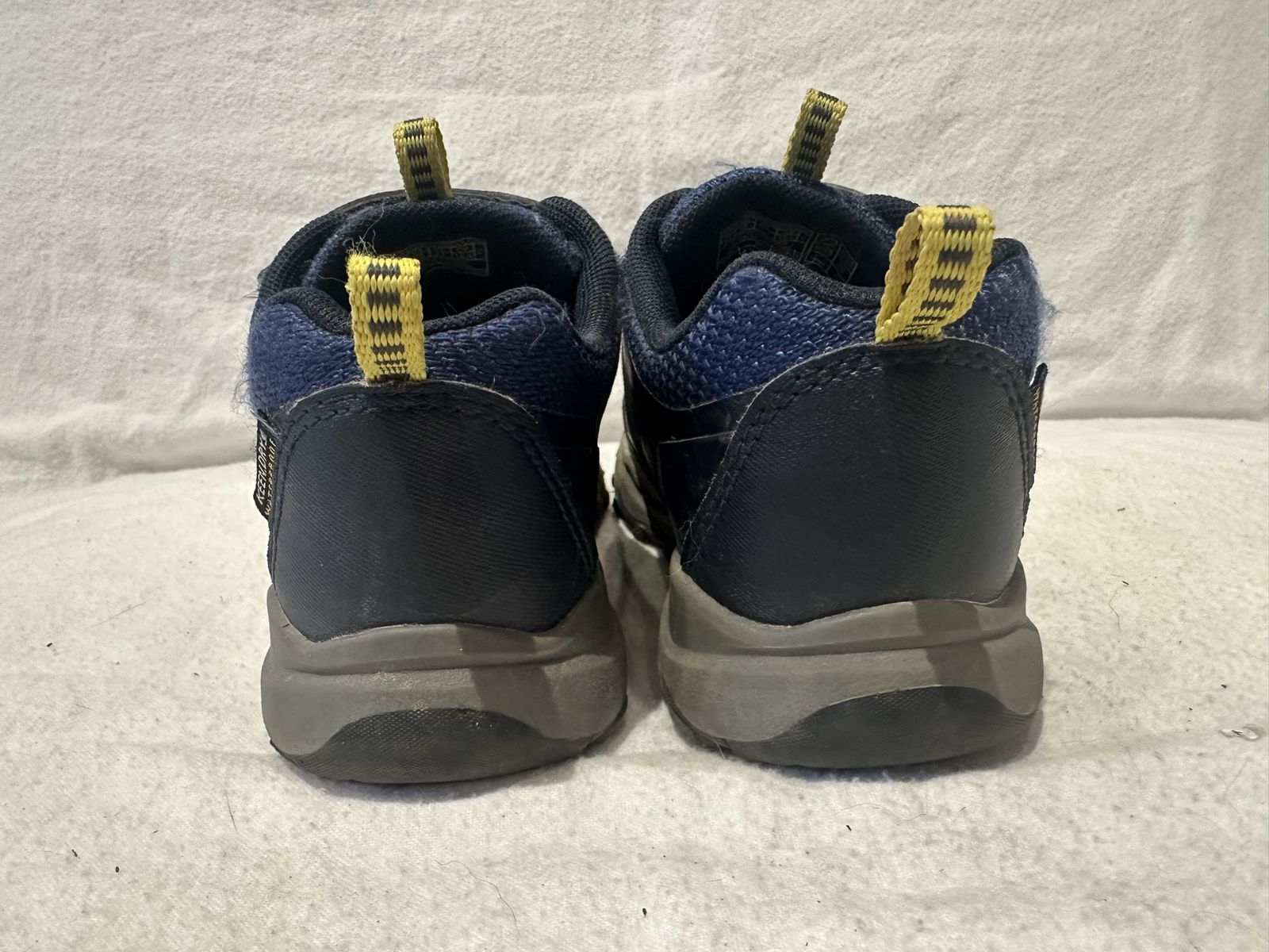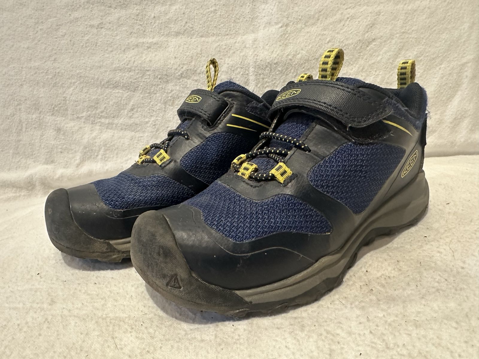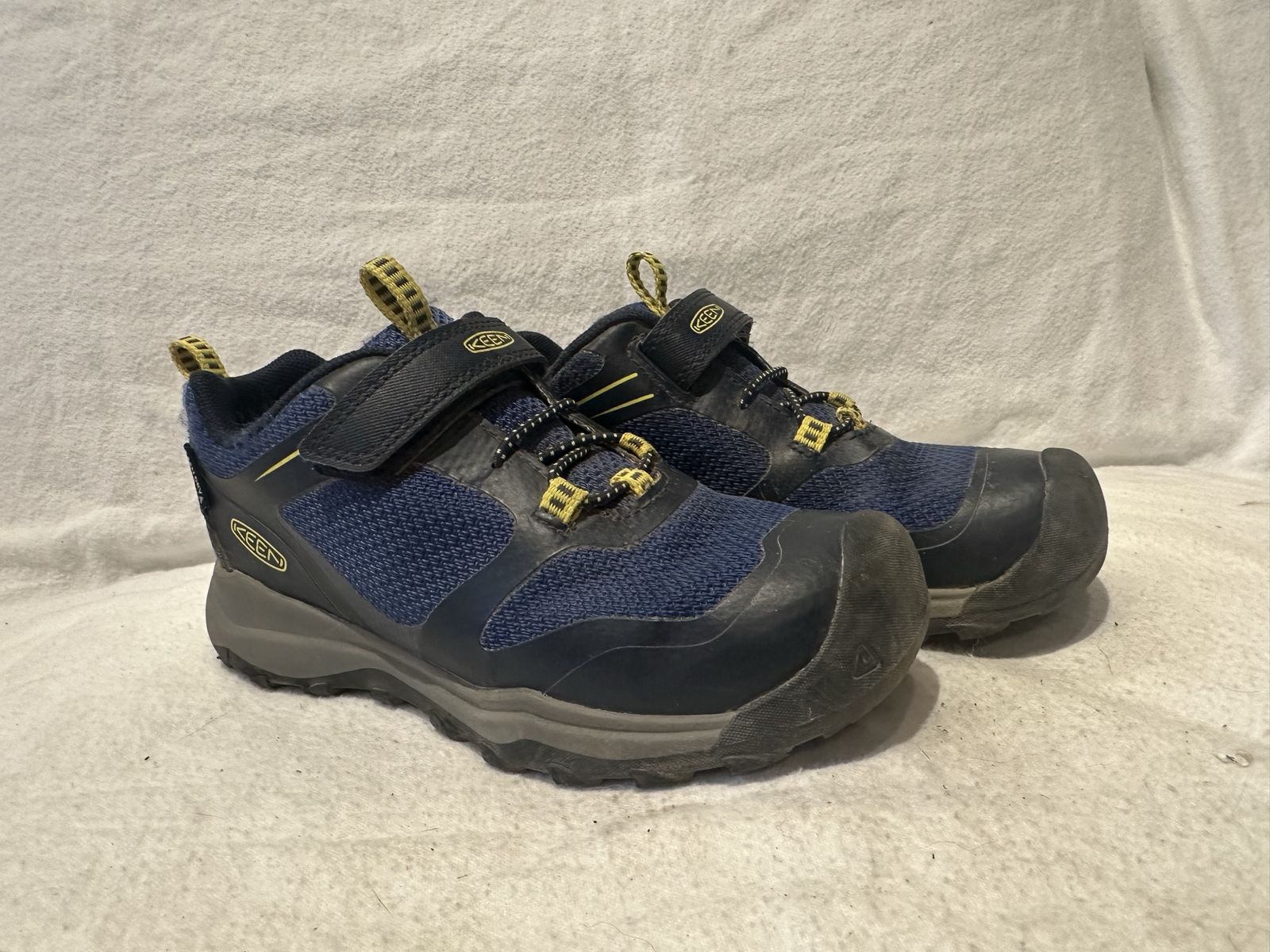 Keen toddler size 12 navy blue textile with yellow trim, waterproof, hiking shoes with elastic laces and Velcro strap at the top. These are in good condition, see photos for details. I take cash or Venmo, but cash is preferred. Text is best. 801-201-4446. Check out my other ads for additional sizes and styles.